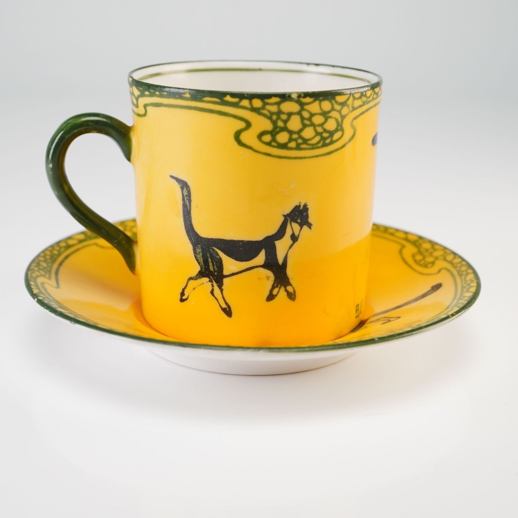 This Royal Doulton earthenware cup and matching saucer are part of the Series Ware collection featuring illustrations by David Henry Souter, often referred to as the Kateroo or Souter's Cats series. The set is decorated with a bright yellow ground and a dark green Art Nouveau border characterized by scrolling lines and a cellular pebble pattern. The central motifs feature stylized black cats in various poses. The cup includes the transfer-printed proverb 'Be Content the Sea Hath Fish Enough'. Both pieces bear the printed signature Souter accompanied by a stylized symbol. The bases are marked with a green underglaze Royal Doulton factory stamp.