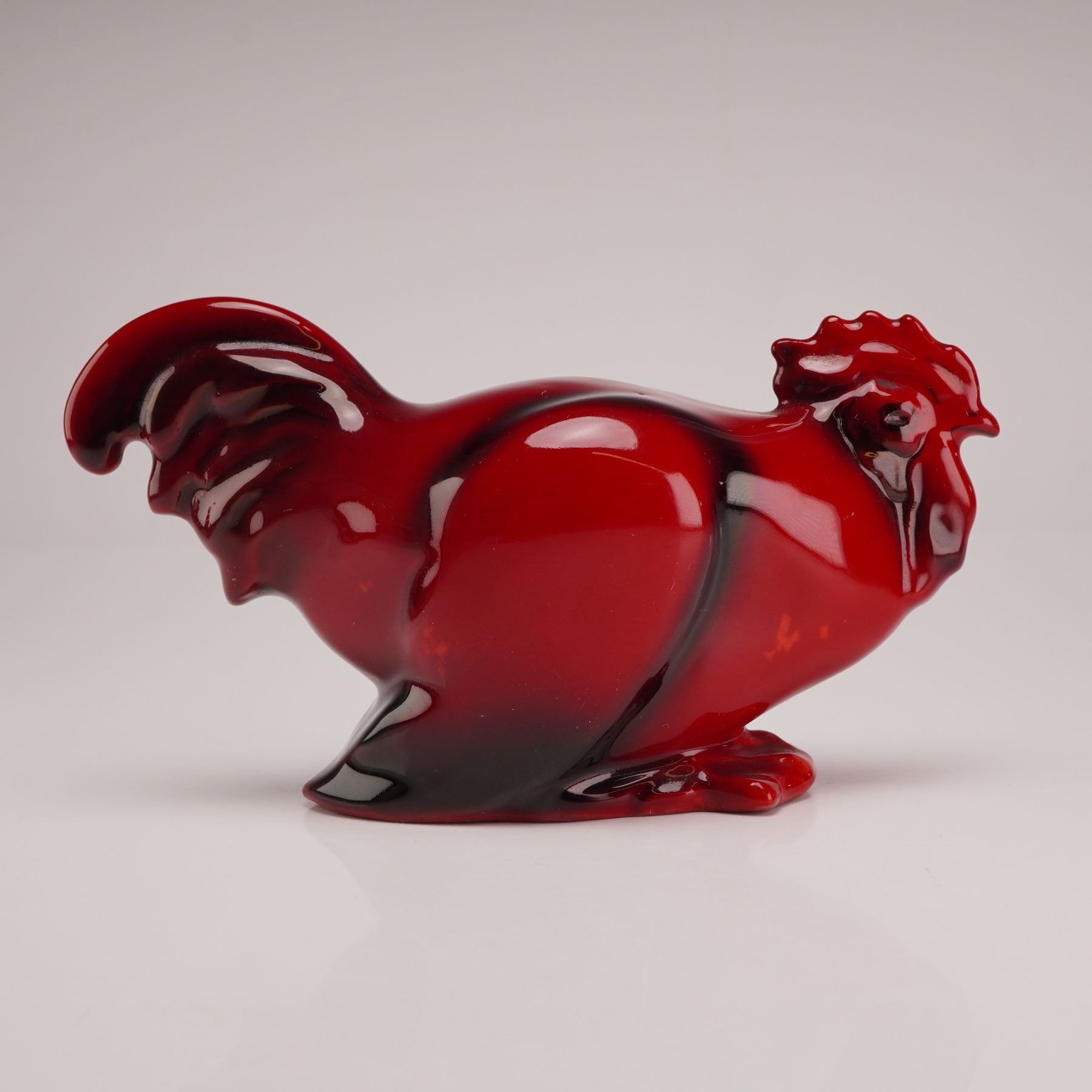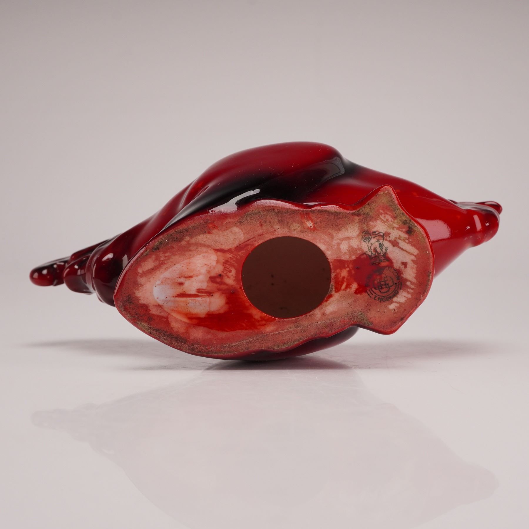 Depicts a stylized crouching. The piece is finished in a deep red flambe glaze, displaying characteristic oxblood color variations and dark streaks resulting from the copper-reduction firing process. Marked with the Royal Doulton backstamp.