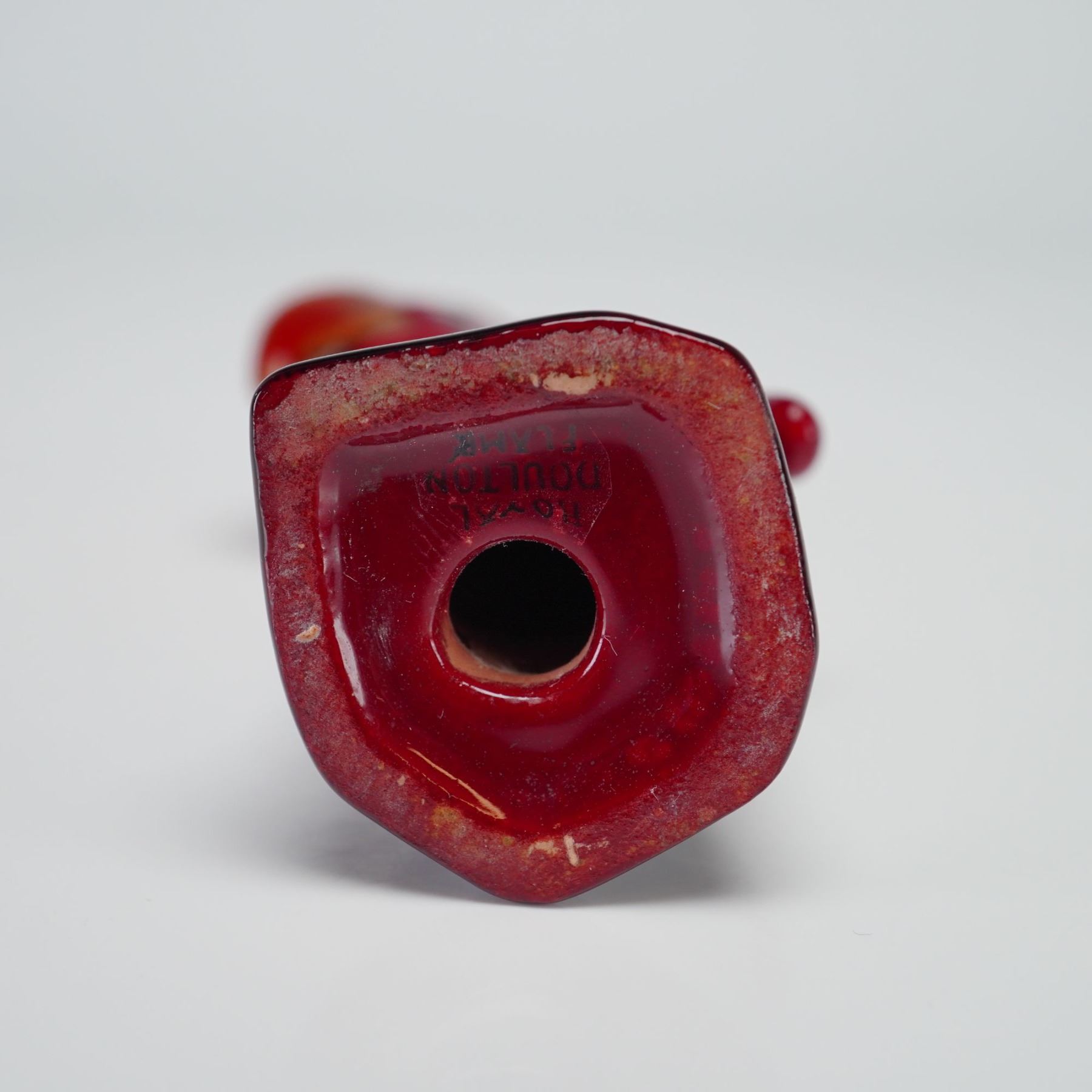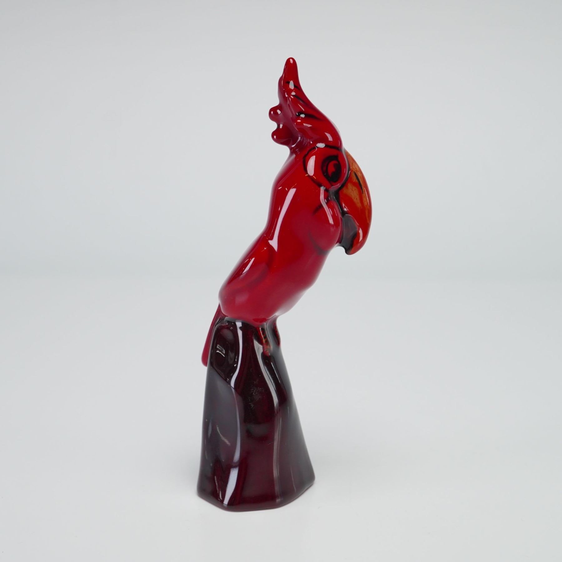 Depicts a bird on base, specifically a cockatoo with a prominent crest and a large, curved beak. The bird is perched on a pillar form. The piece is made of porcelain and finished in the signature Royal Doulton Flambe glaze, which features a high-gloss red color on the body that transitions into a dark burgundy and black shade at the base. The beak is accented with orange and black detailing. Underside marked Royal Doulton Flambe.