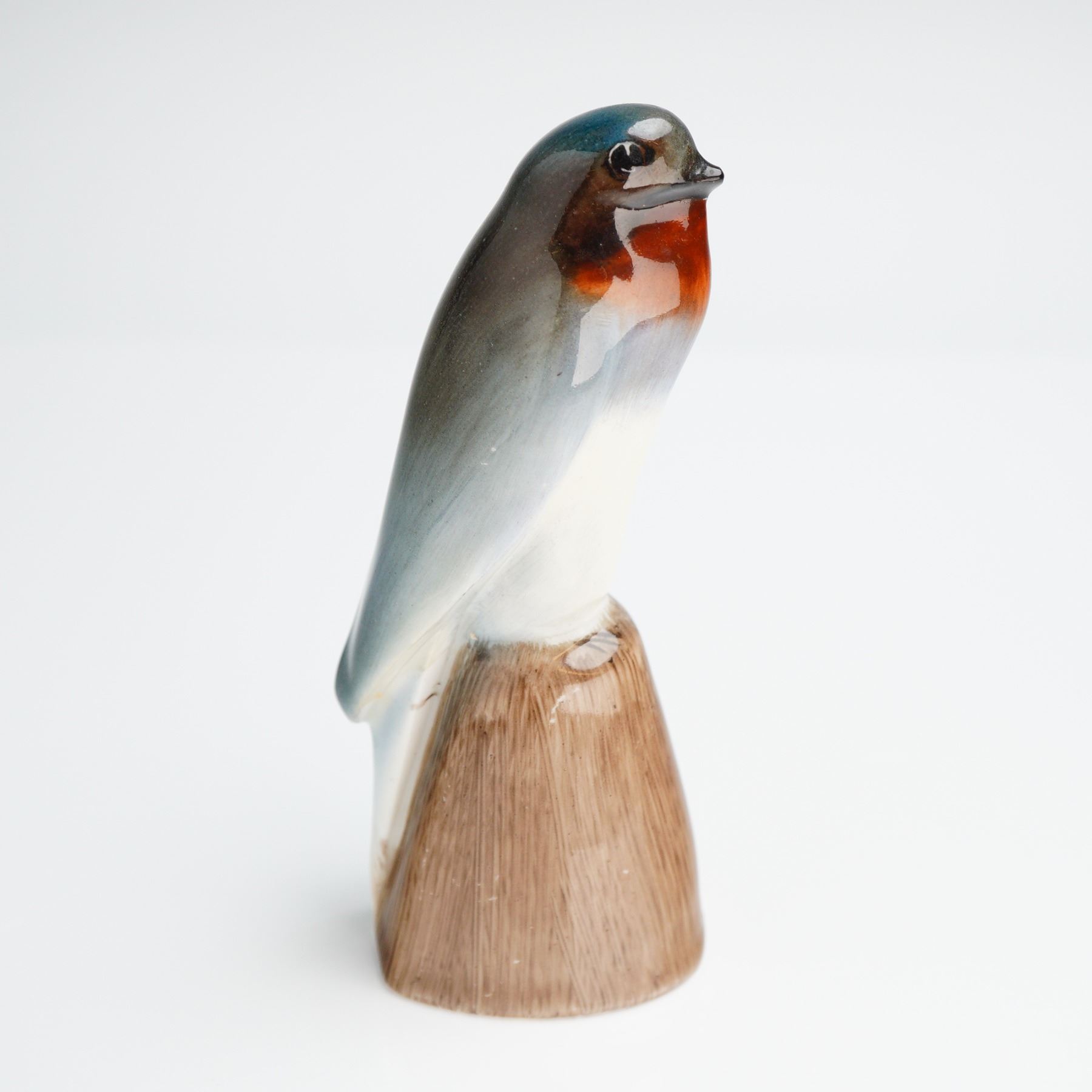 A single glazed porcelain figurine attributed to Royal Doulton, model 'Swallow on Rock' (HN136). The piece depicts a stylized swallow perched atop a conical base designed to simulate a wooden stump or rock formation. The bird is decorated with glossy coloration, featuring dark blue/black on the head and back, a distinct reddish-brown throat patch, and a white underside. The base features a central ventilation hole. The underside of the base bears stamped green maker's marks consistent with Royal Doulton Hand-painted inventory or factory marks reading "HN136" are also visible on the underside.