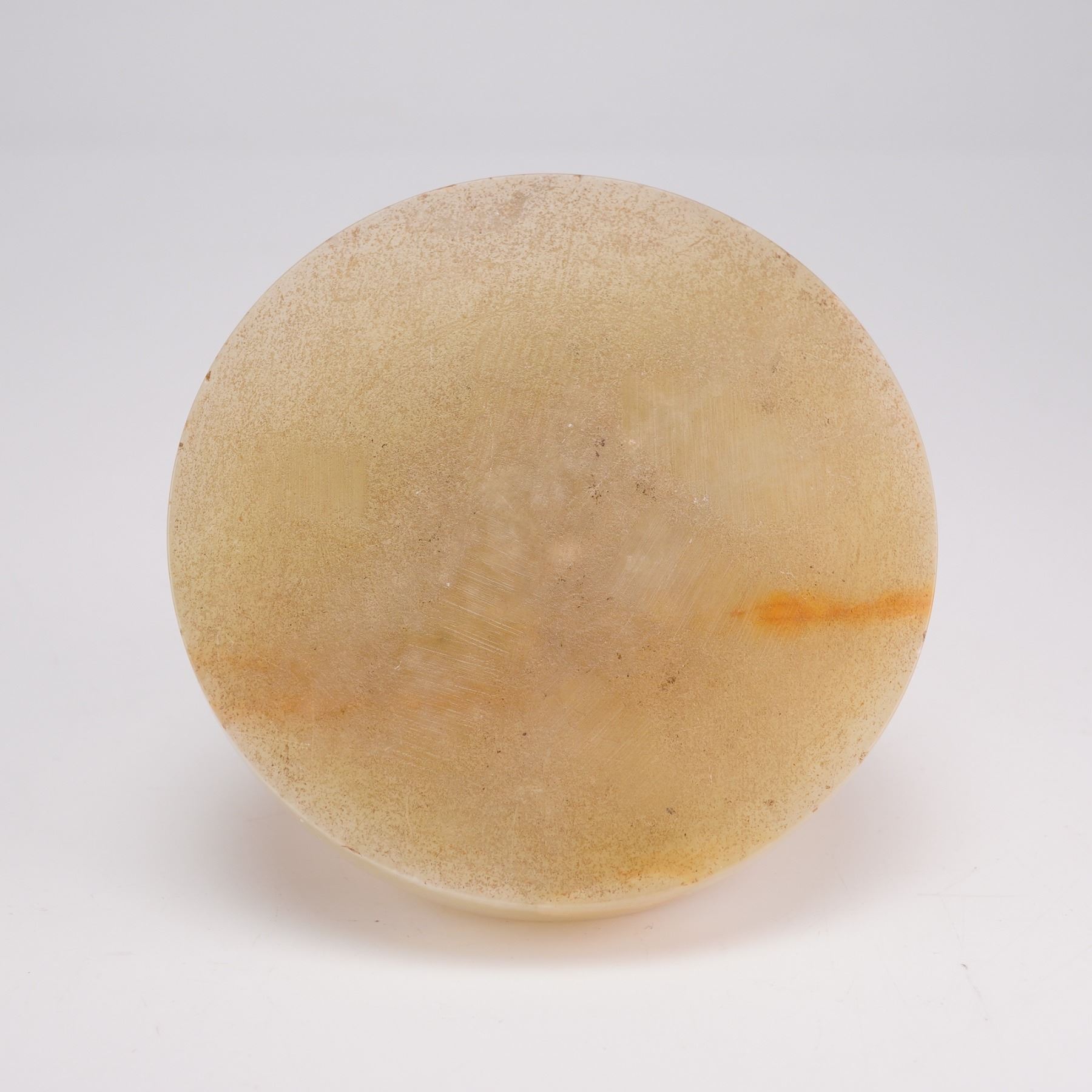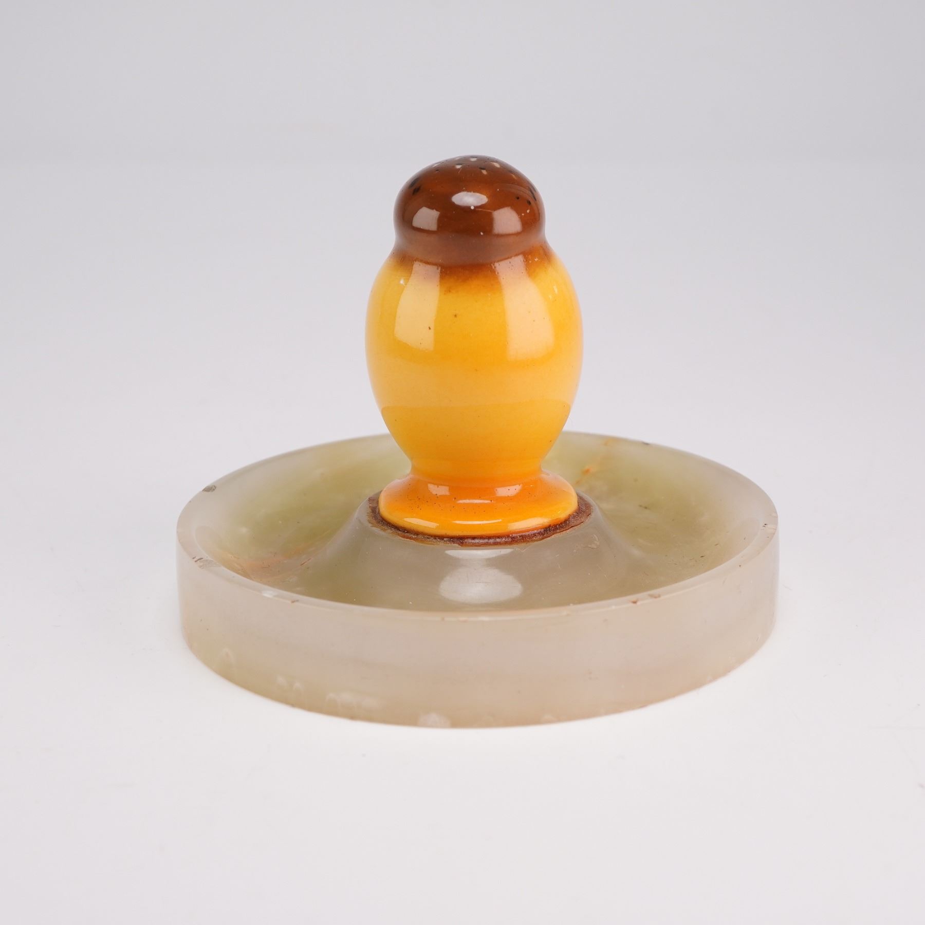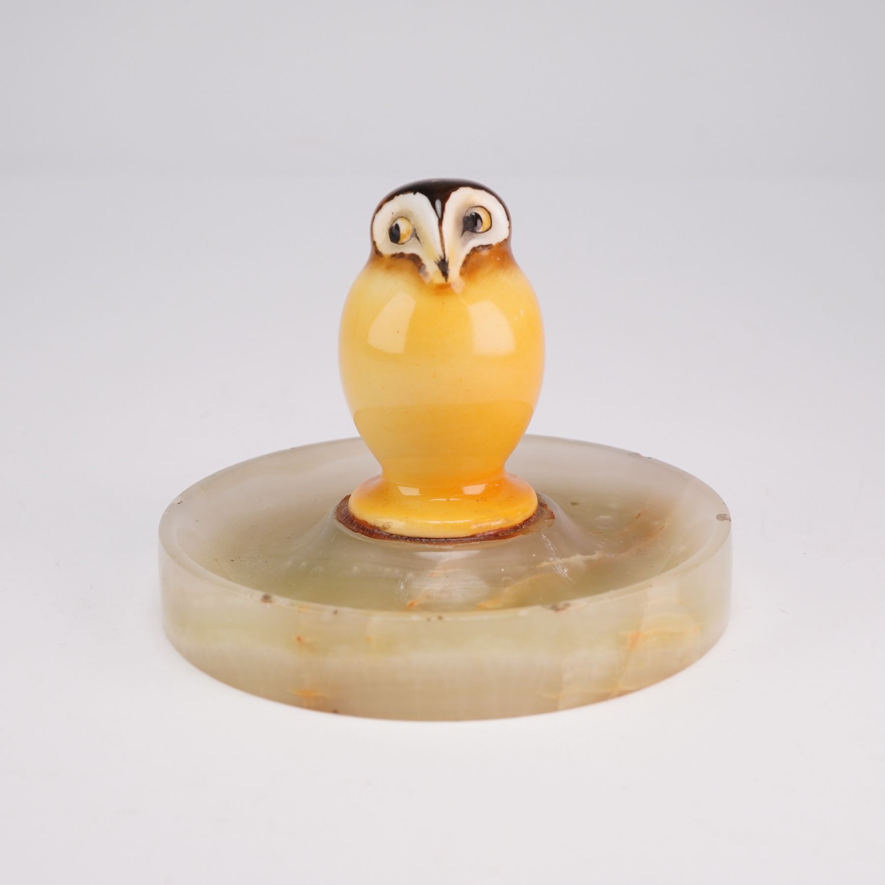 Royal Doulton "Character Birds" comprise a rare series of eleven modeled bird figurines, first introduced in 1922 and discontinued by 1946. These decorative figures were often used as finials on powder bowls, desk accessories, menu holders, and place name holders. This English porcelain Character Bird is rendered in shades of yellow and brown in a minimalist style and is presented on a natural onyx tray of pale green and beige alabaster, displaying distinctive orange-brown veining and banding.