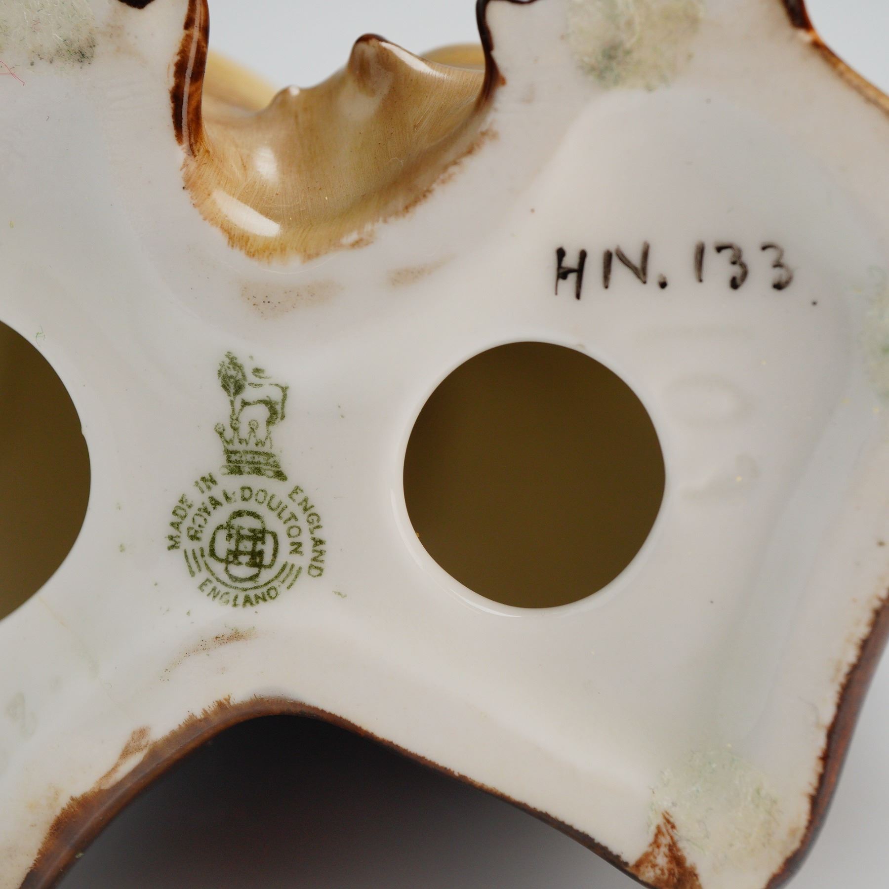 A single ceramic figurine depicting two stylized penguins standing closely together, executed in glazed earthenware or porcelain with a high-gloss finish. The coloration utilizes polychrome enamels in black, dark brown, cream, and yellow-ochre to render the plumage, with orange-brown detailing on the beaks and feet. The underside of the base features the standard printed green Royal Doulton backstamp, reading "MADE IN ROYAL DOULTON ENGLAND" with a crown logo, alongside a hand-painted model number "HN. 133." This model is commonly referred to in the market as 'Penguins' or 'King Penguin Family'.