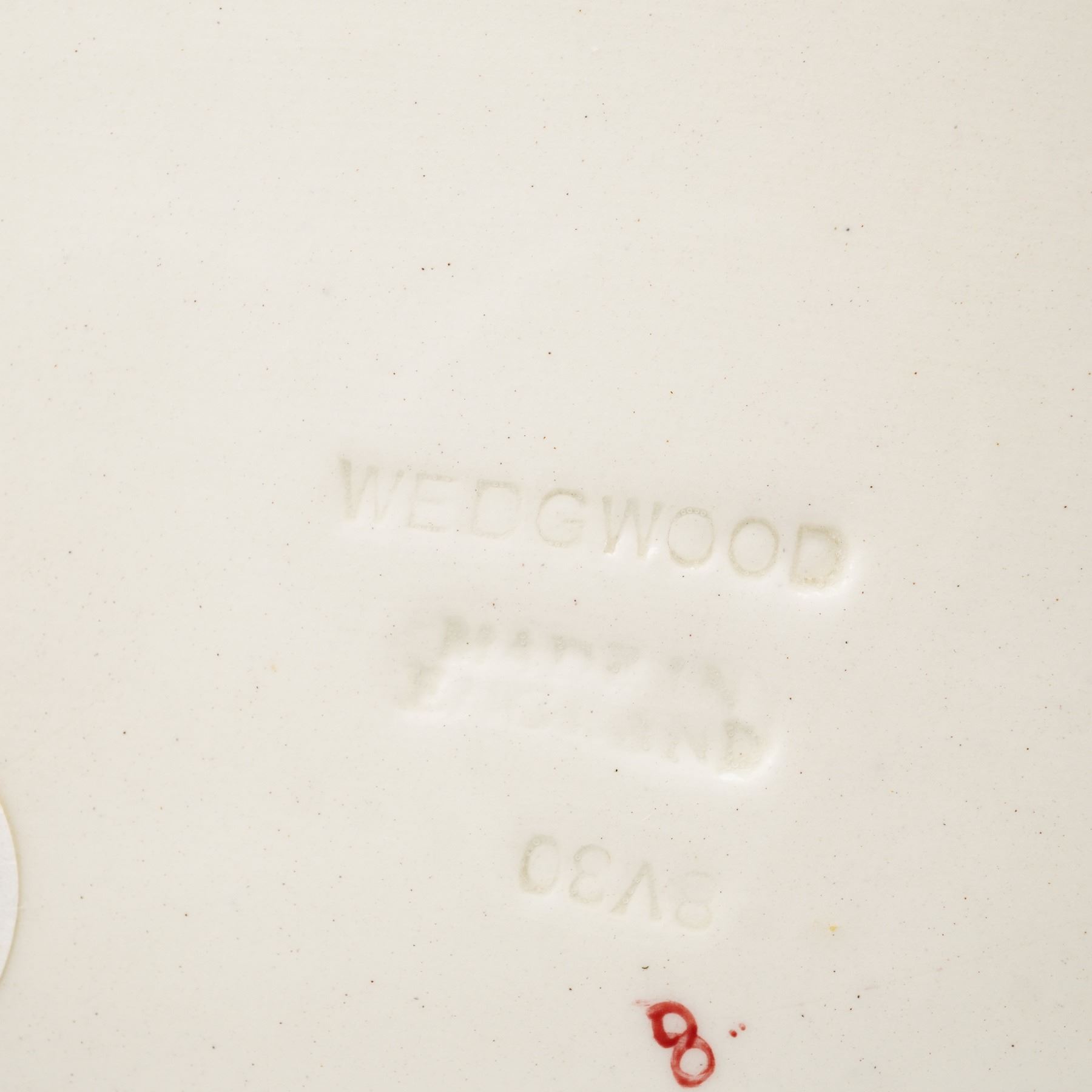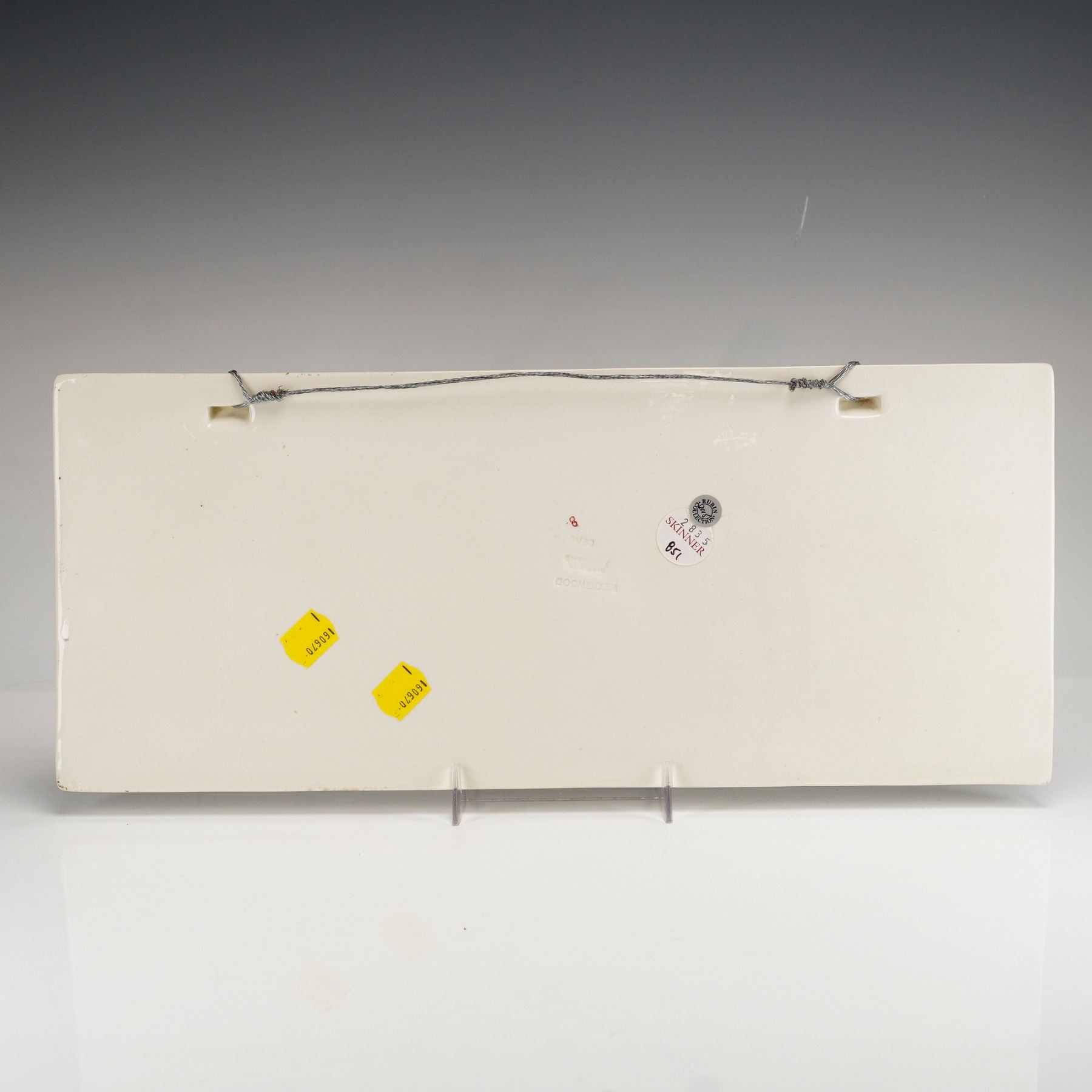 A Wedgwood polychrome glazed earthenware plaque featuring a relief-molded traditional English fox hunting scene. The horizontal rectangular plaque depicts four riders in red hunting coats on horseback with a pack of hounds in a wooded landscape including a gate and fence. The figures and landscape elements are raised from the background through relief-molding and finished with hand-applied polychrome glazes. The reverse features impressed marks for WEDGWOOD and MADE IN ENGLAND, along with an impressed alphanumeric code 8V30 and a hand-painted red 8. The back includes integrated molded lugs with an attached wire hanger. Labels on the reverse include a Rubin Collection sticker, a Skinner auction label, and two yellow lot stickers.