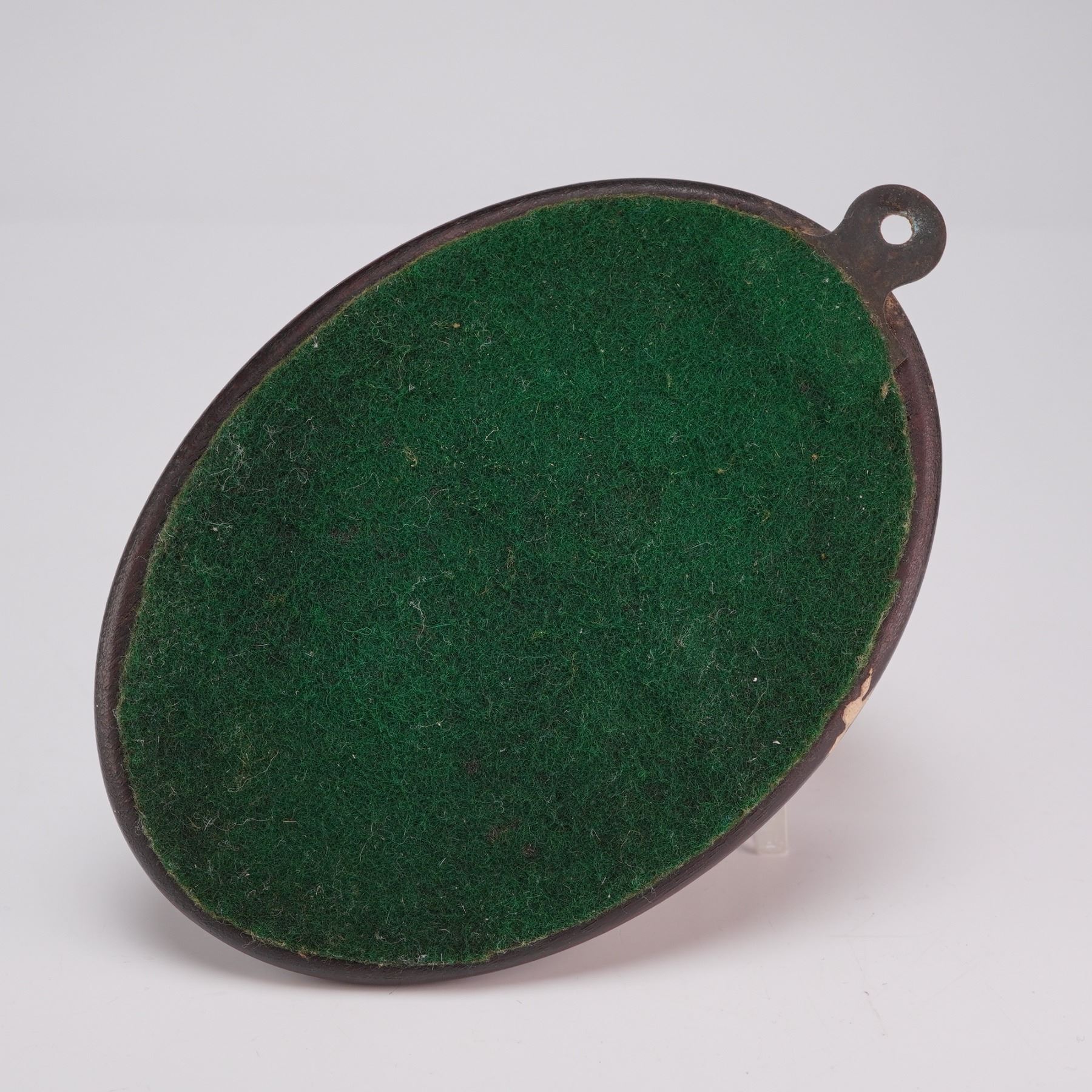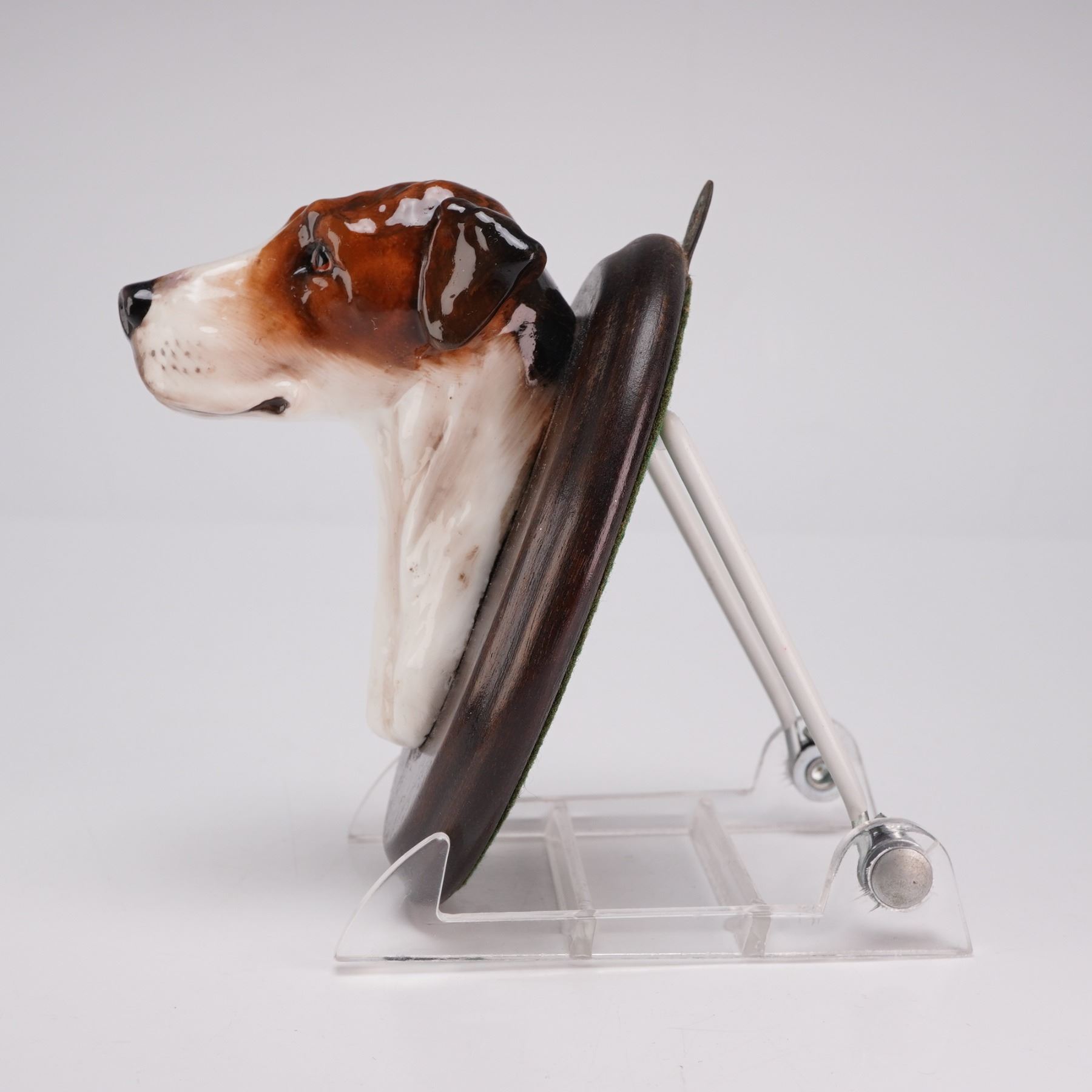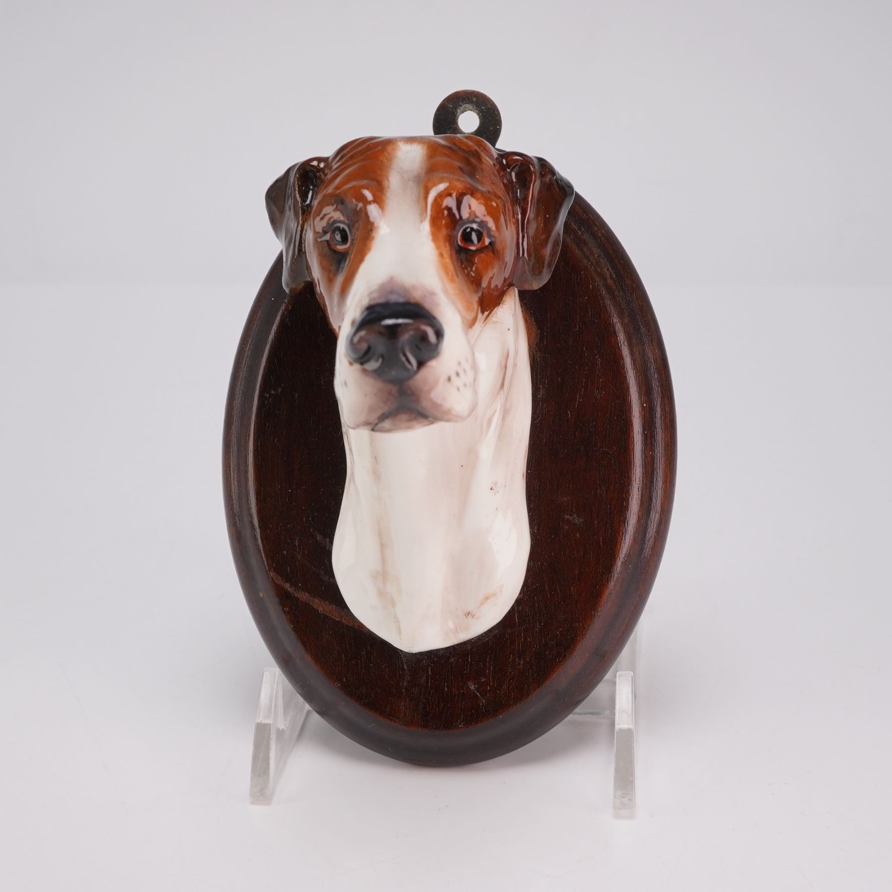 This wall-mounted plaque features a realistically modeled ceramic head of a Foxhound. The head is constructed of glazed porcelain with hand-painted brown and white markings. It is securely mounted to an oval, dark-stained wooden plaque with a beveled edge.