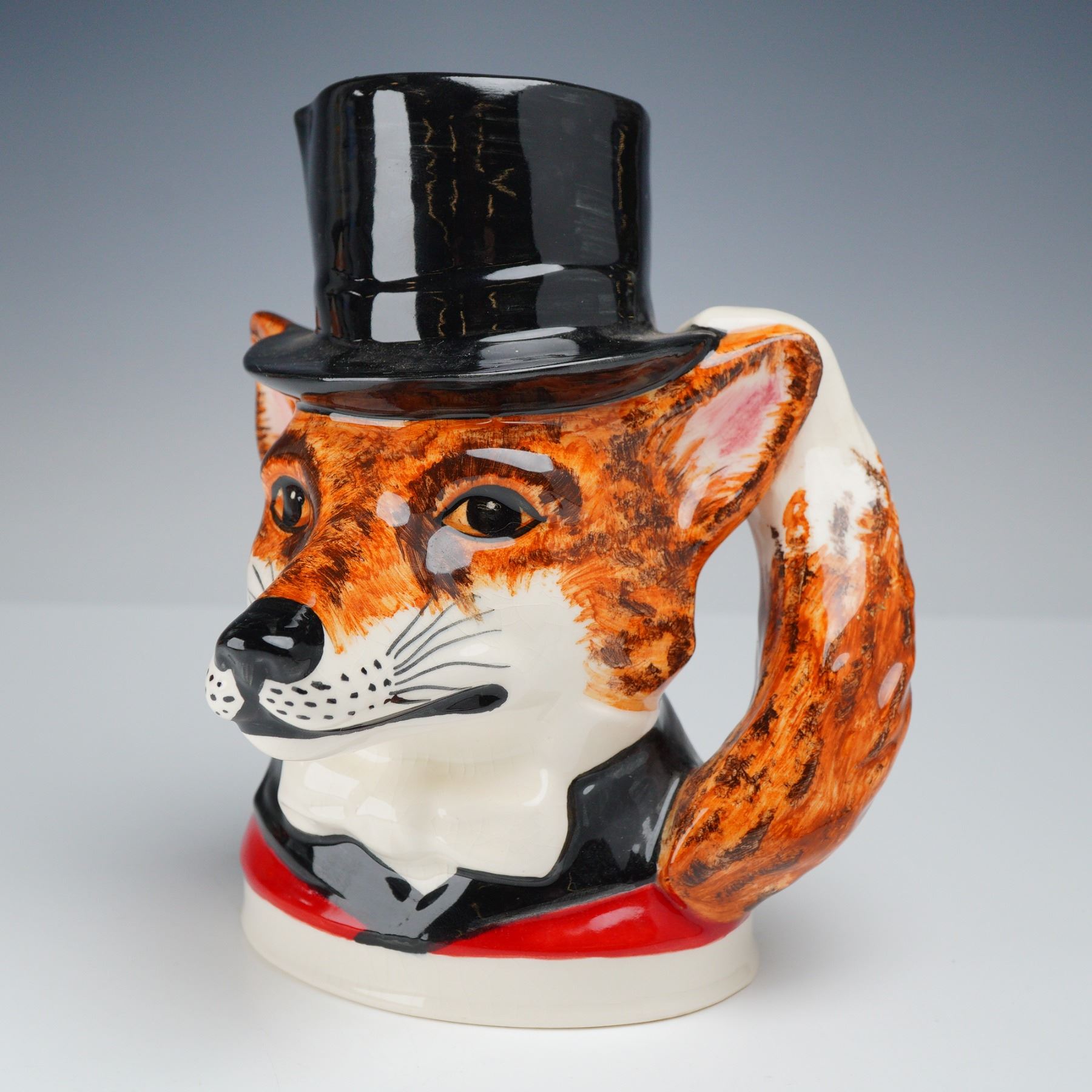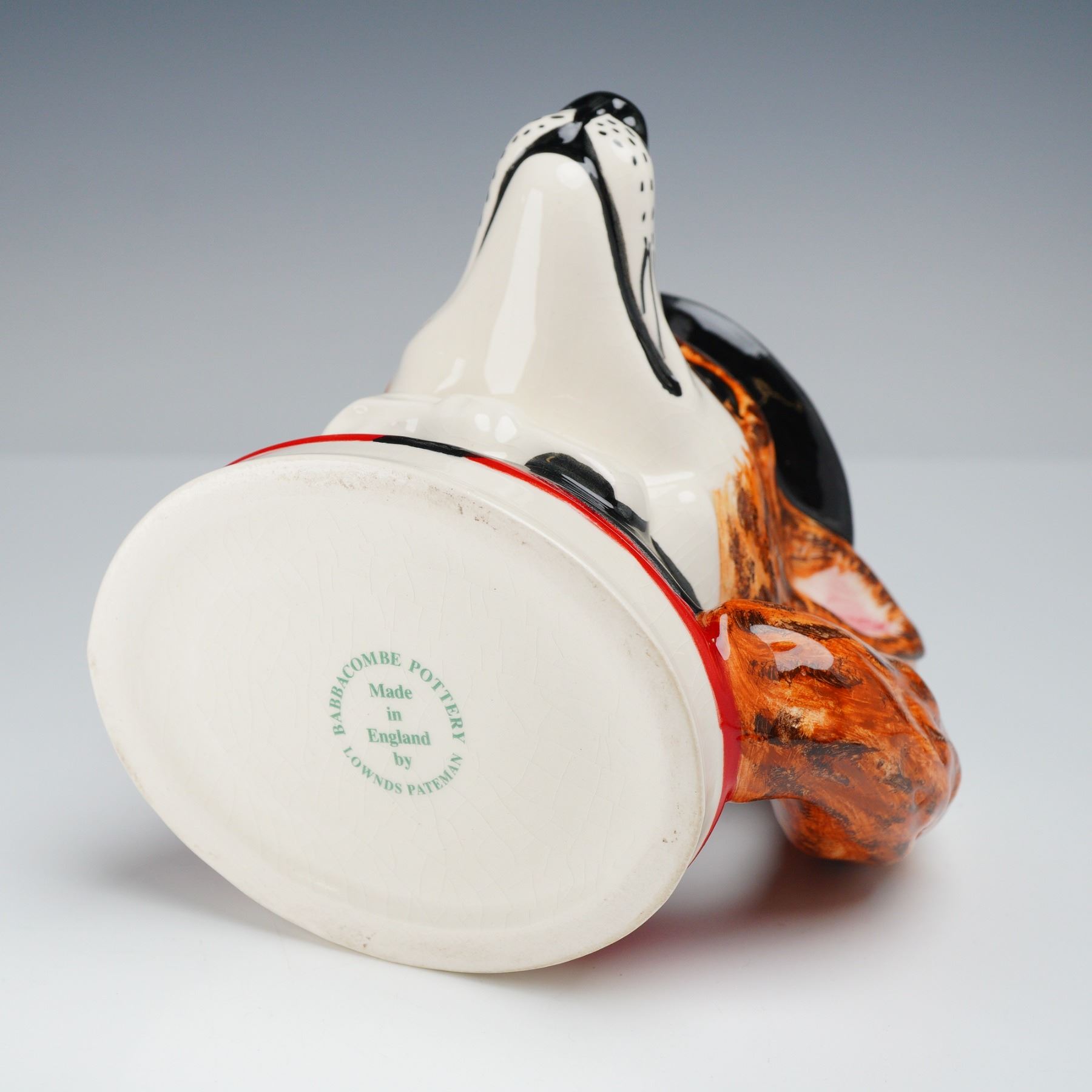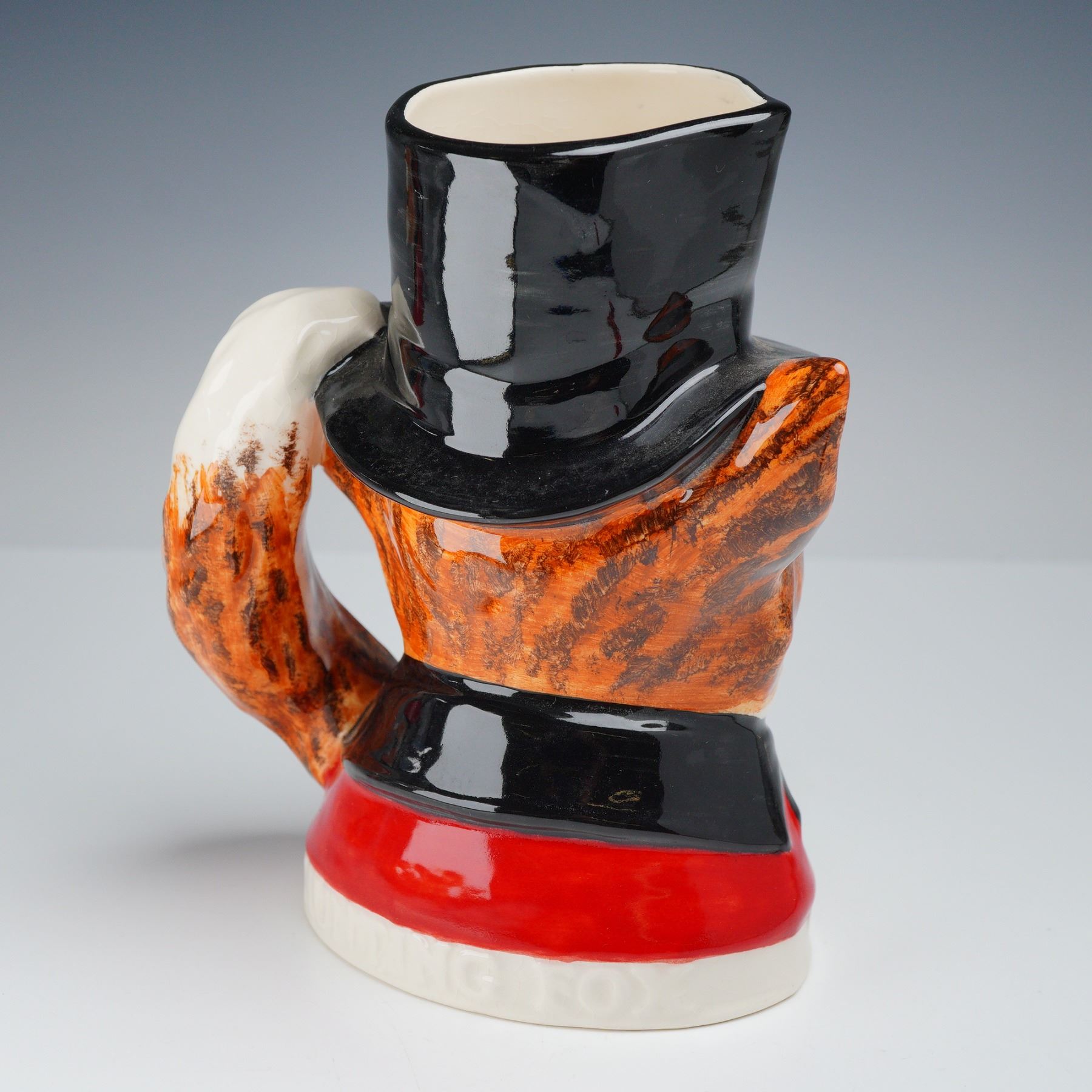 A glazed earthenware character jug produced by Babbacombe Pottery in England by Lownds Pateman. The vessel is modeled in the form of an anthropomorphic hunting fox dressed in formal equestrian attire. The fox is depicted wearing a black top hat that forms the rim and pouring spout of the jug. The figure is further detailed with a white cravat and a black waistcoat over a red hunting jacket base. The handle is realistically modeled in the shape of a fox tail or brush.The item features molded details with hand-painted underglaze decoration. Fine brushwork is used to simulate the texture of fur in shades of orange, brown, and black. The piece is finished with a high-gloss clear glaze. The underside of the base features a green printed mark in a circular orientation reading BABBACOMBE POTTERY, Made in England by LOWNDS PATEMAN. The reverse of the red base features embossed capital letters reading HUNTING FOX.