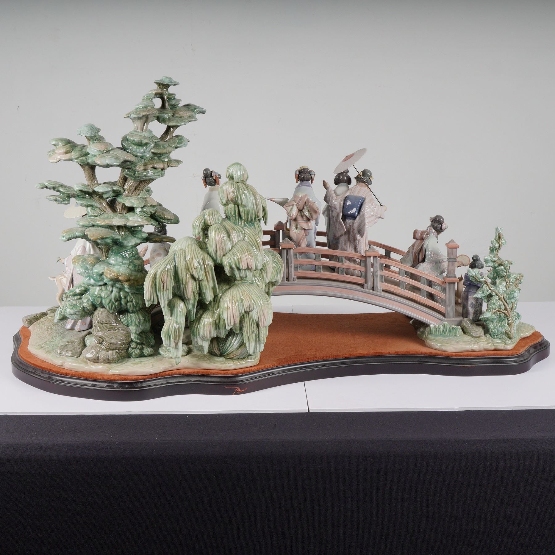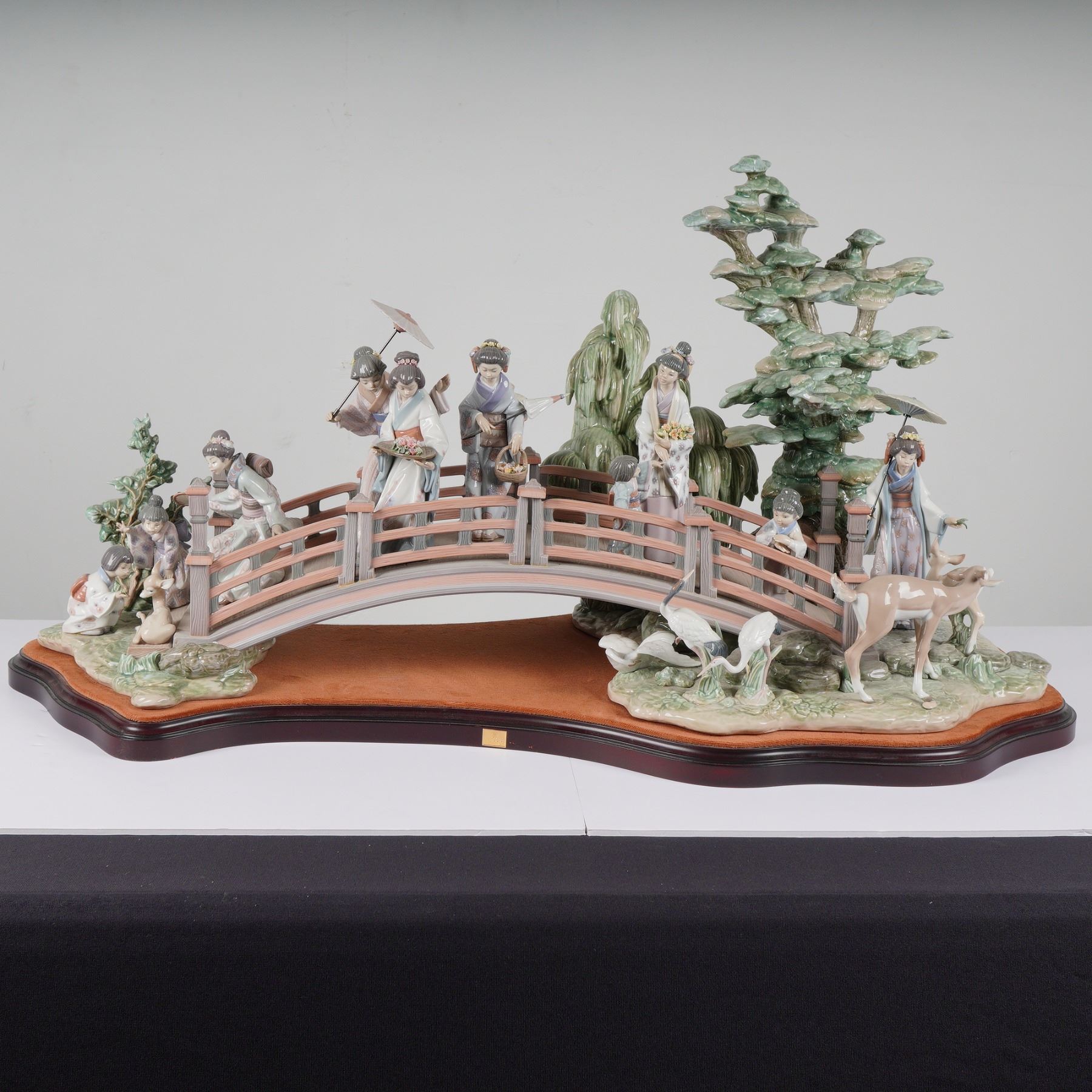 A monumental Lladro porcelain sculptural group titled "Oriental Garden" (Puente Japones), reference number 1001775. This intricate tableau depicts a procession of Japanese figures, including geishas with parasols and children, crossing a large arched moon bridge. The scene is further enriched with a pair of cranes, a deer with its fawn, and highly detailed stylized pine and willow trees. Expertly sculpted by Salvador Debon and decorated by ngeles Cabo, the piece is finished in the classic Lladro pastel palette with delicate, hand-applied floral elements. This is a limited edition piece, numbered 83 of 750, and bears the official Lladro backstamp. The sculpture is mounted on its original custom-contoured dark wood base featuring a gold-toned Lladro plaque and is accompanied by the original framed certificate of authenticity dated October 25, 1994. Height: 24 inches.