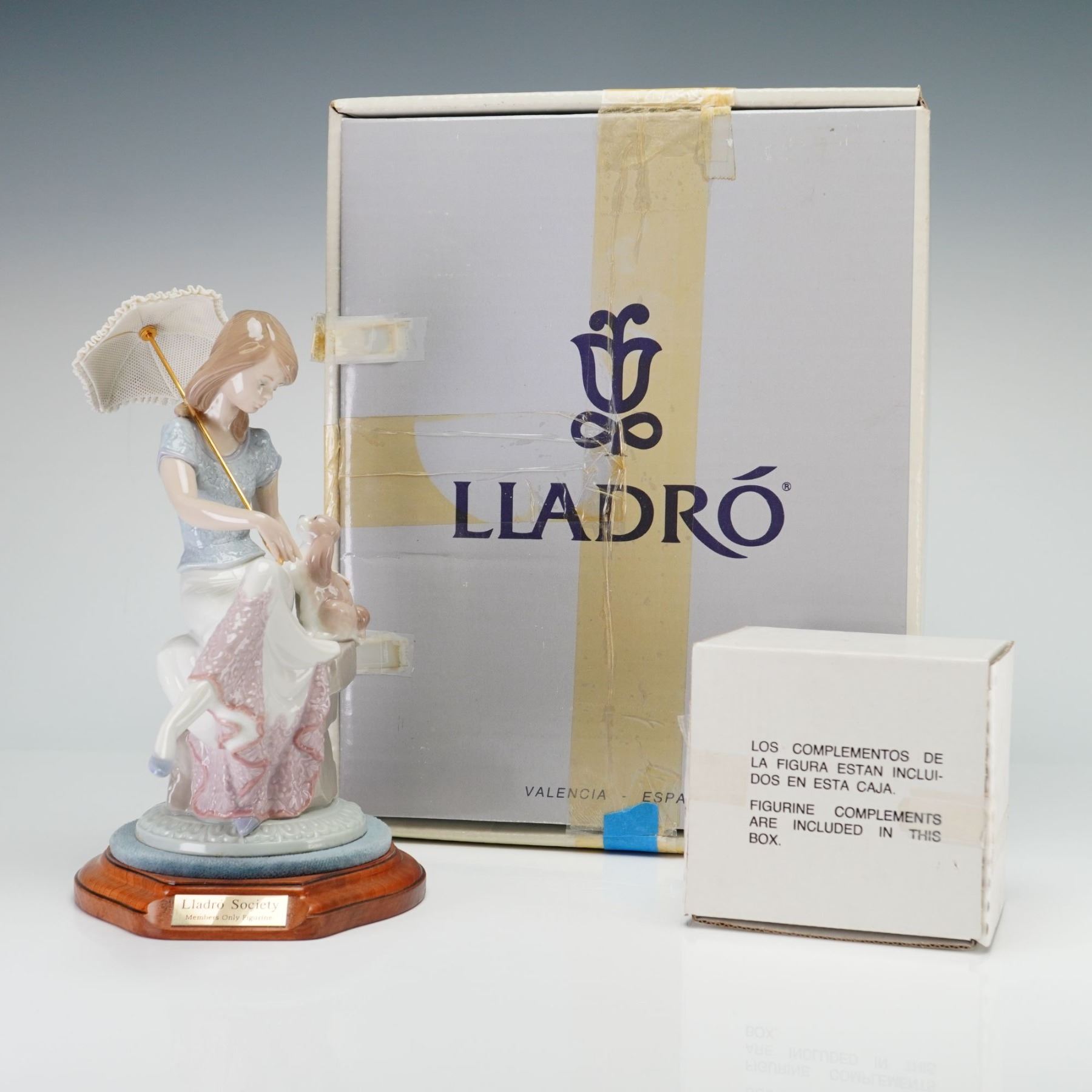 Lladro glazed porcelain figurine titled Picture Perfect, model number 7612. The piece depicts a young woman seated on a textured stone-like plinth with a small spaniel-type dog jumping up at her side. She holds a removable parasol featuring lace-textured porcelain and applied pink floral blossoms. The figure is attired in a pale blue patterned bodice and a flowing white skirt with a detailed, ruffled pink lace-effect hem. The underside of the base features a blue Lladro backstamp, Hand Made in Spain, and copyright Daisa 1990. It also bears a black circular stamp for the Lladro Collectors Society 5th Anniversary 1985-1990. The model number 7612 is incised into the paste. This item includes the original Lladro branded box, an internal box for the parasol, and a polished wooden display stand with a brass-toned plaque that reads Lladro Society Members Only Figurine.
