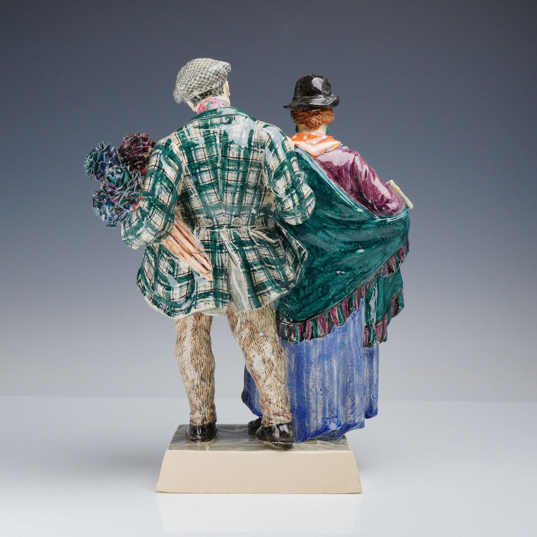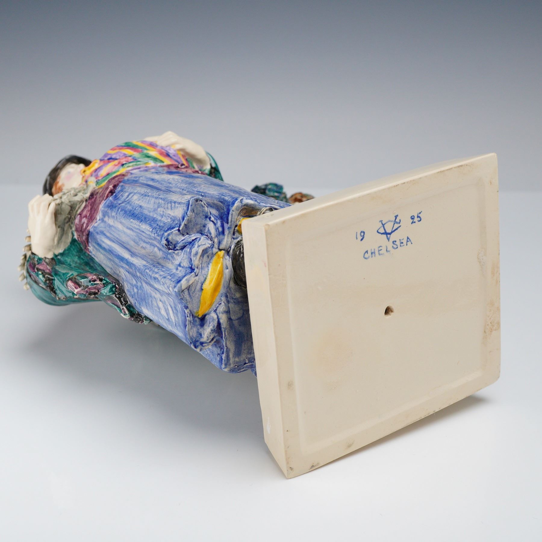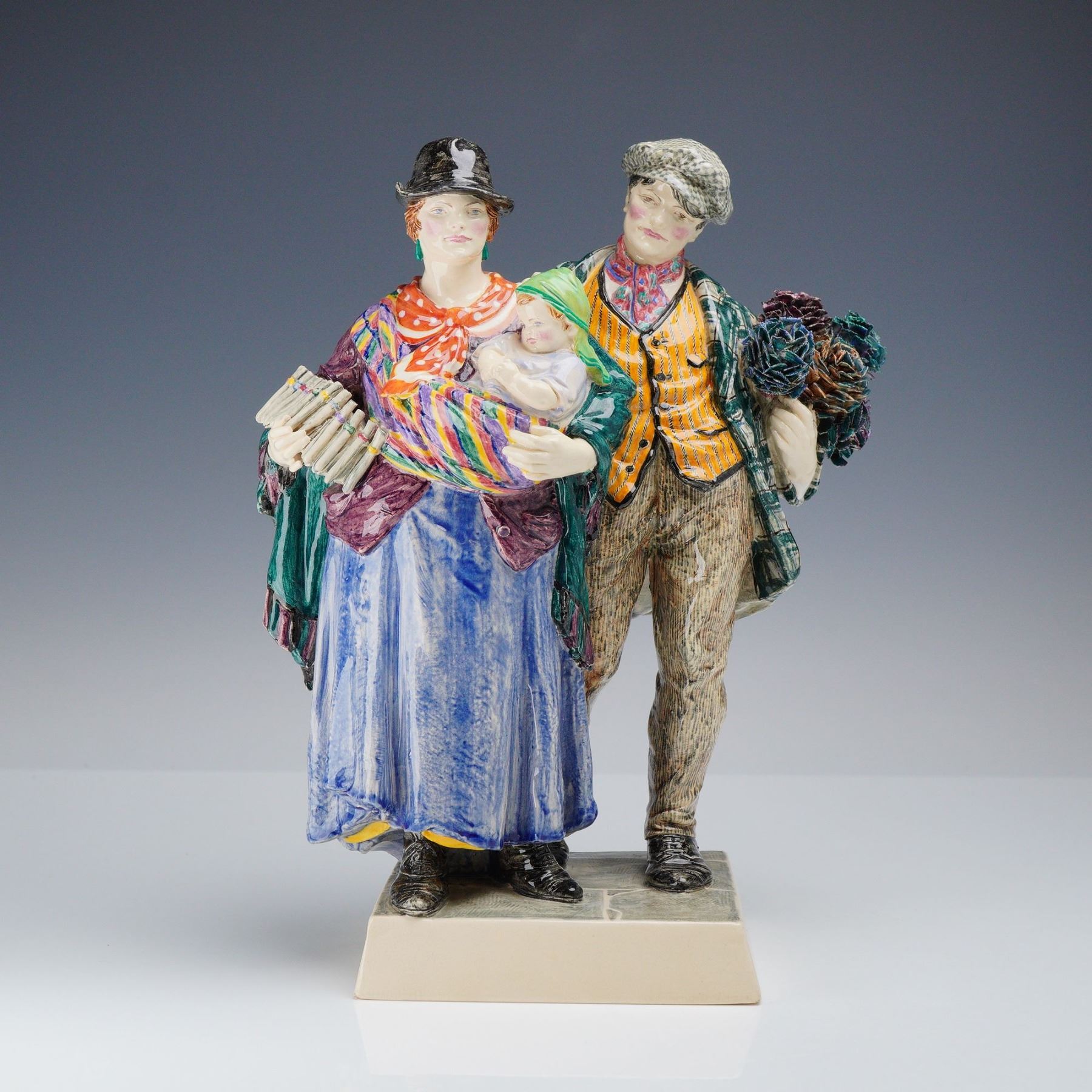 Charles Vyse Chelsea English pottery figure titled The Gypsies, dated 1925. This hand-painted glazed ceramic figurine depicts a gypsy mother and father holding a baby. The female figure is modeled wearing a black hat, a purple jacket, and a long blue skirt, holding a stack of papers and an infant bundled in a multi-colored striped wrap. The male figure stands beside her in a gray flat cap, a yellow and black striped waistcoat, and a green and white checked overcoat, carrying a bouquet of flowers and an umbrella. The group is set on a rectangular base with a hand-painted simulated cobblestone surface and cream-colored beveled sides. The underside of the base features hand-painted marks in blue underglaze including the date 1925, the CV monogram for Charles Vyse, and the word CHELSEA.