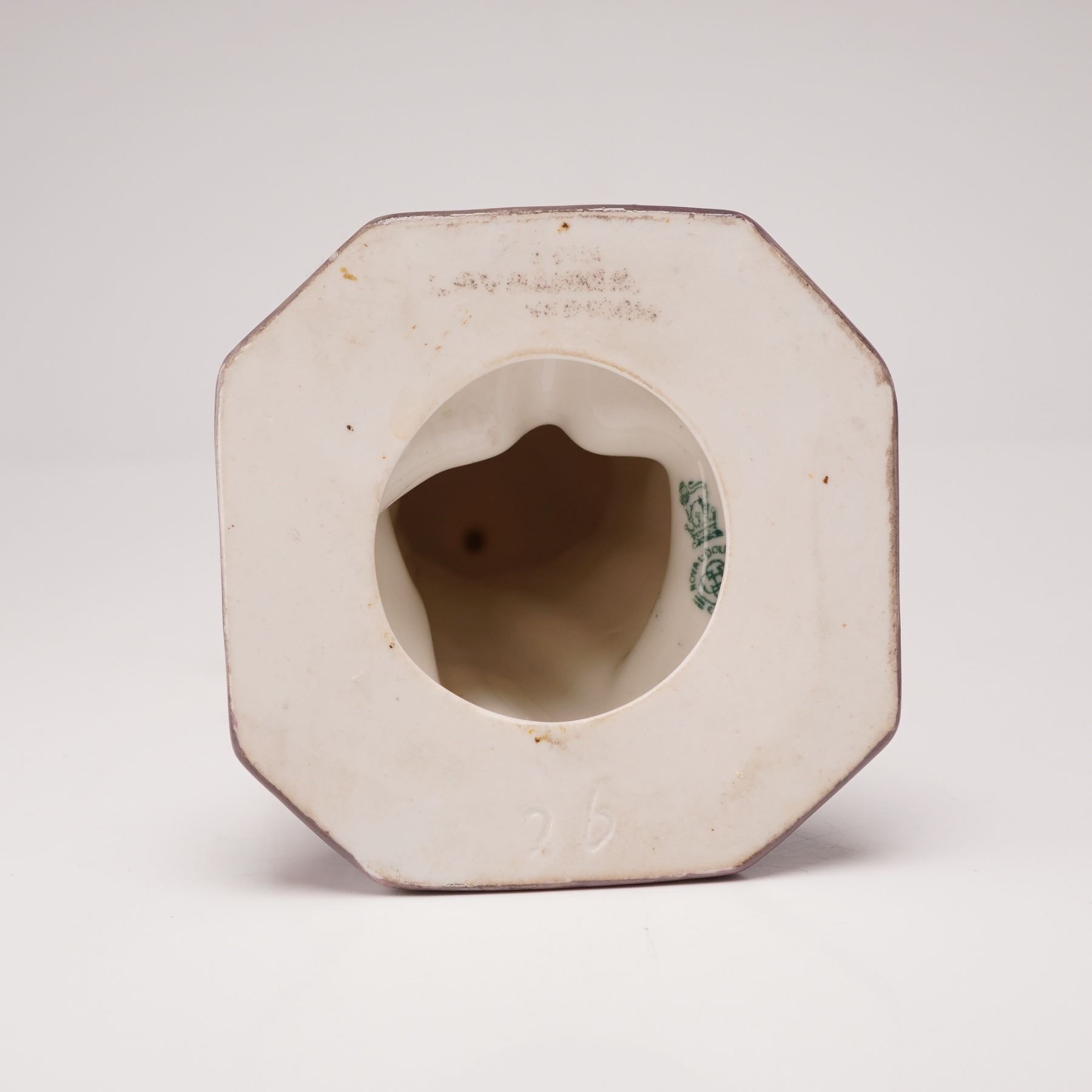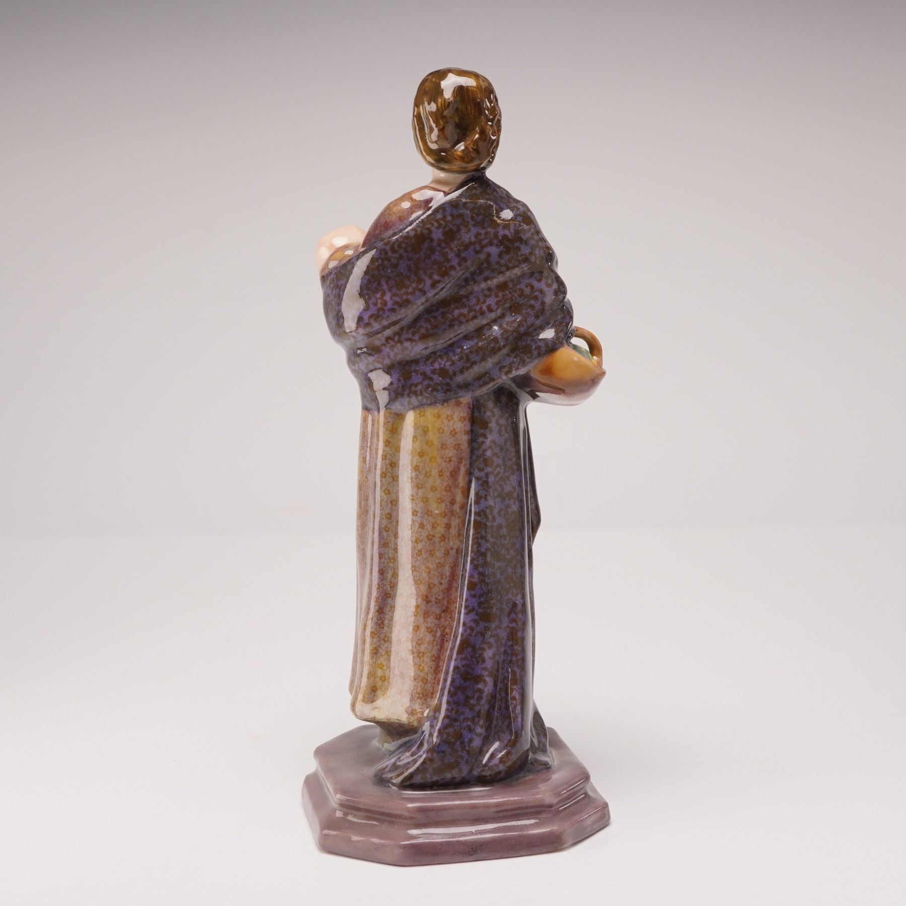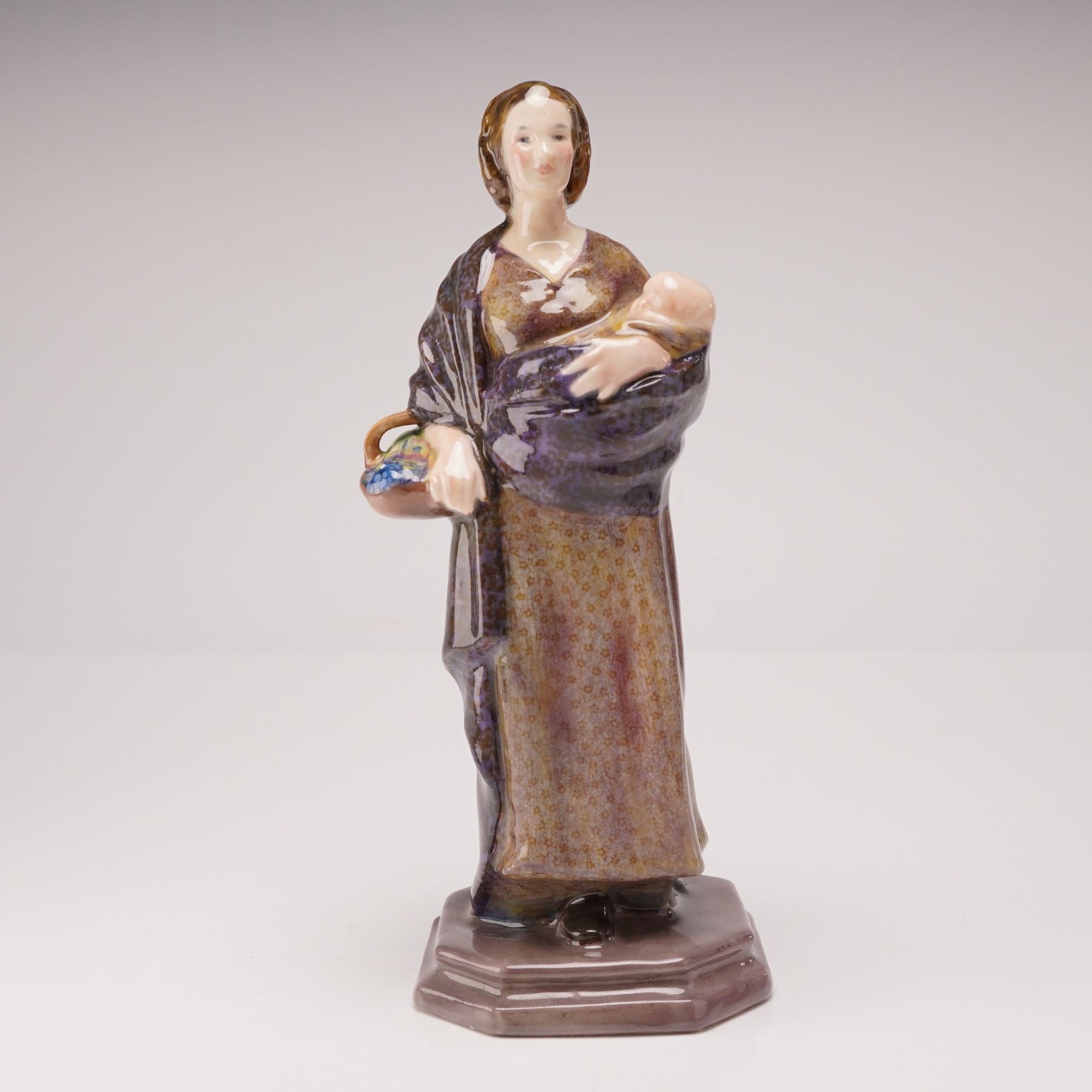 Depicts a mother holding an infant and a basket of flowers. The figure is shown standing on an integral octagonal base, wearing a long gown with a speckled ochre pattern under a heavy shawl. The shawl and base feature a multi-colored, mottled glaze with deep purple and brown tones. A small basket containing blue flowers is held on the woman's right arm. The base is marked with the Royal Doulton backstamp, and a faint ink stamp that reads "The Lavender Woman."