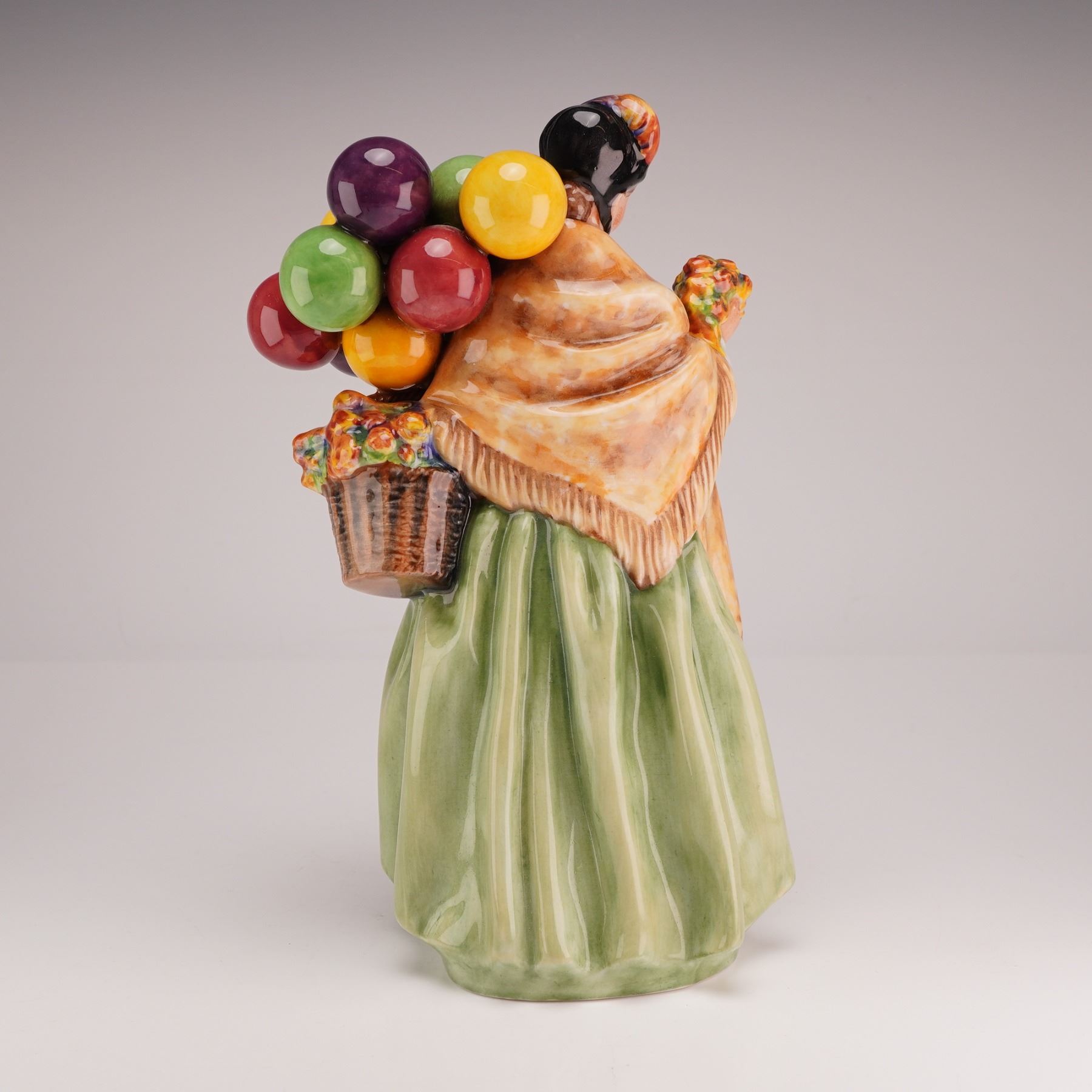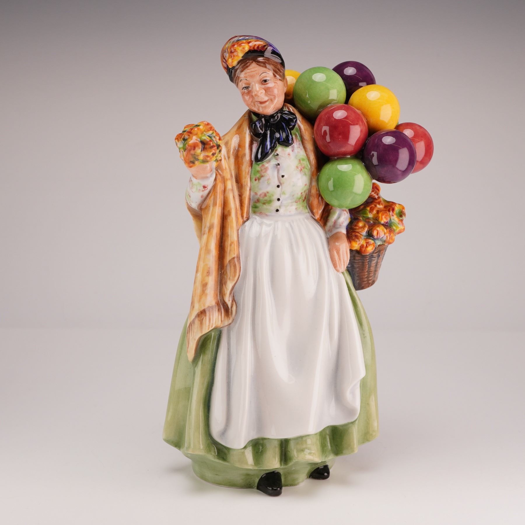 The figure depicts an elderly woman in traditional attire, including a floral-patterned blouse, a white apron, a long green pleated skirt, and a fringed, ocher-colored shawl. She wears a colorful bonnet with a black ribbon bow at her neck. The figure holds a large cluster of multicolored balloons in green, red, yellow, and purple, with a small woven basket of flowers tucked under her left arm. The base is marked with the Royal Doulton backstamp in gray.