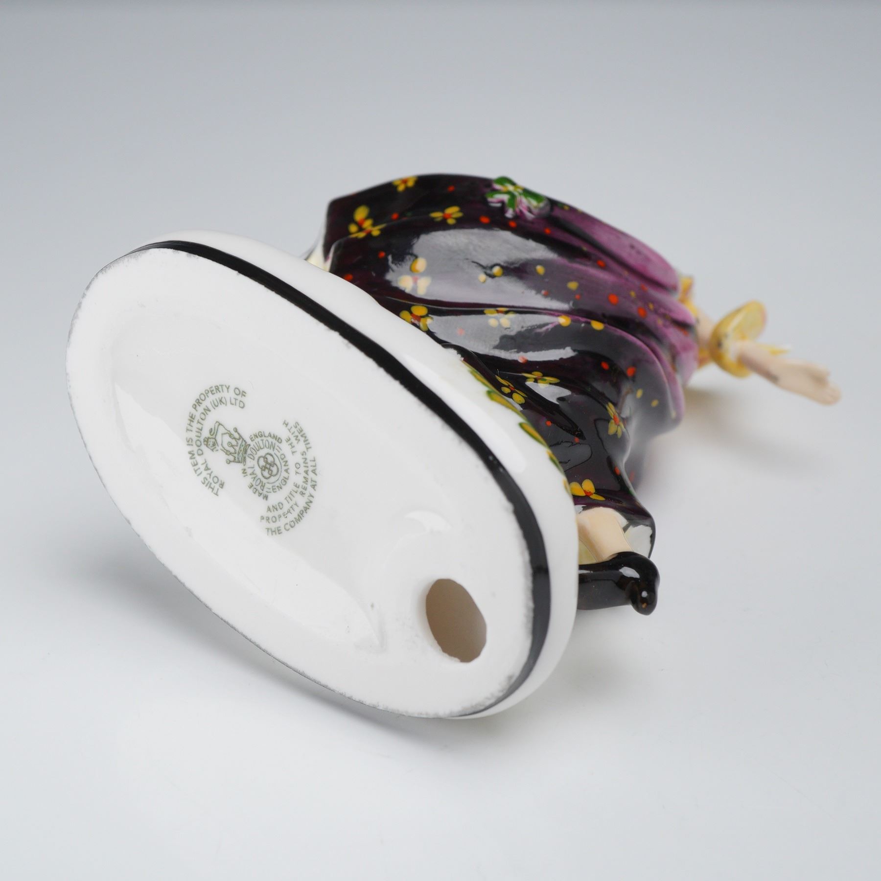 This Royal Doulton petite Columbine figurine is a rare color variant of the dancer subject. The polychrome glazed porcelain figure is depicted in a dynamic, mid-motion pose. The dancer wears a black bodice decorated with yellow and red floral patterns and a voluminous, swirling skirt that transitions from deep magenta at the waist to black at the hem. The skirt is further detailed with small yellow floral sprays and red dots. A long, flowing yellow scarf is draped across her chest and winds through her hair. The figure is accented with a gold-toned tiara and black shoes, standing upon an oval base decorated with a green and gold foliate wreath. The underside of the base bears a green underglaze factory mark featuring a lion standing atop a crown over a circular Royal Doulton England emblem. This central mark is surrounded by two concentric rings of text stating: THIS ITEM IS THE PROPERTY OF ROYAL DOULTON (UK) LTD AND TITLE REMAINS THE PROPERTY OF THE COMPANY AT ALL TIMES. This specific marking identifies the piece as a factory sample or internal showroom model.