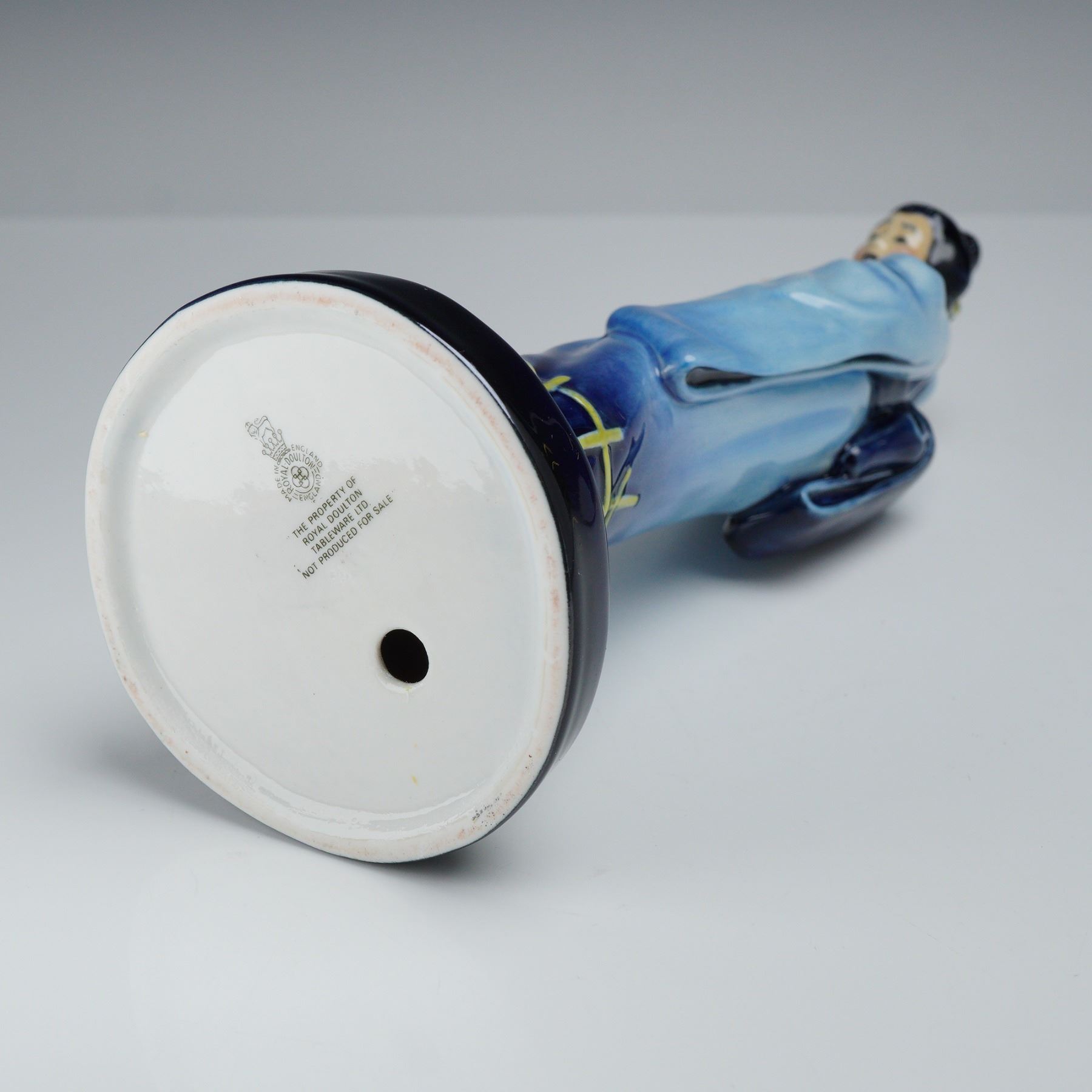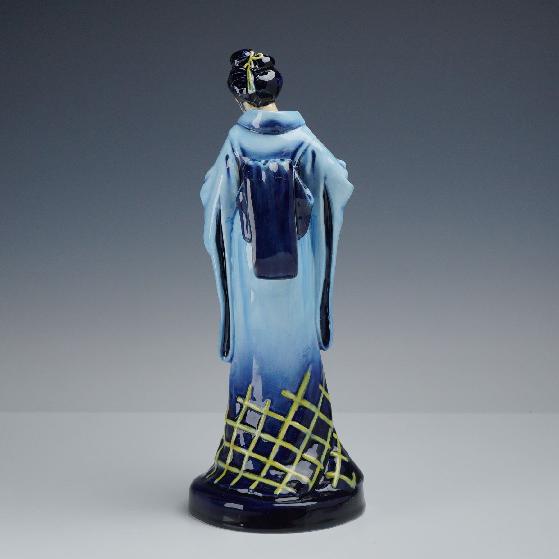 A Royal Doulton porcelain figurine identified as The Geisha. The piece is constructed of glazed porcelain and depicts a woman in traditional Japanese attire. The figure is modeled in a standing pose wearing a kimono with a monochromatic blue gradient, transitioning from light sky blue at the shoulders to a deep cobalt blue at the hem. The lower portion of the garment is decorated with a raised yellow lattice pattern. The hair is finished in black and styled in a traditional bun with a yellow accessory. The figure holds a small, closed accessory to her chest. The underside of the base bears a green Royal Doulton factory mark with a crown and circular crest, including the text MADE IN ENGLAND and ROYAL DOULTON. Additionally, a black stamp is present stating THE PROPERTY OF ROYAL DOULTON TABLEWARE LTD. NOT PRODUCED FOR SALE. This designation indicates the item was an internal archive piece or showroom sample not intended for original retail distribution.