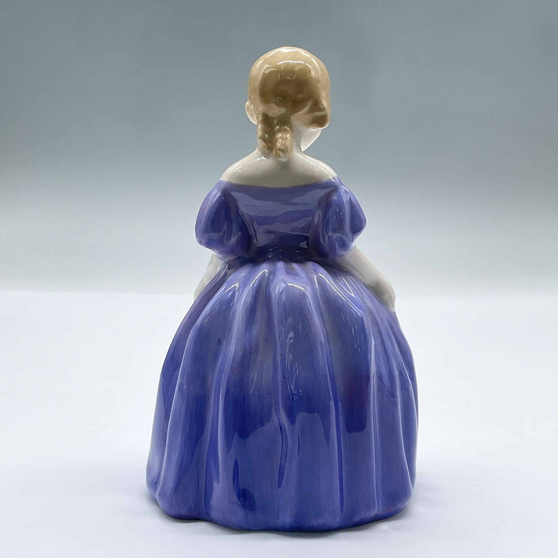 From the Harradine Child Classics series, features this figure of a sweet small girl in a purple dress. Royal Doulton backstamp.