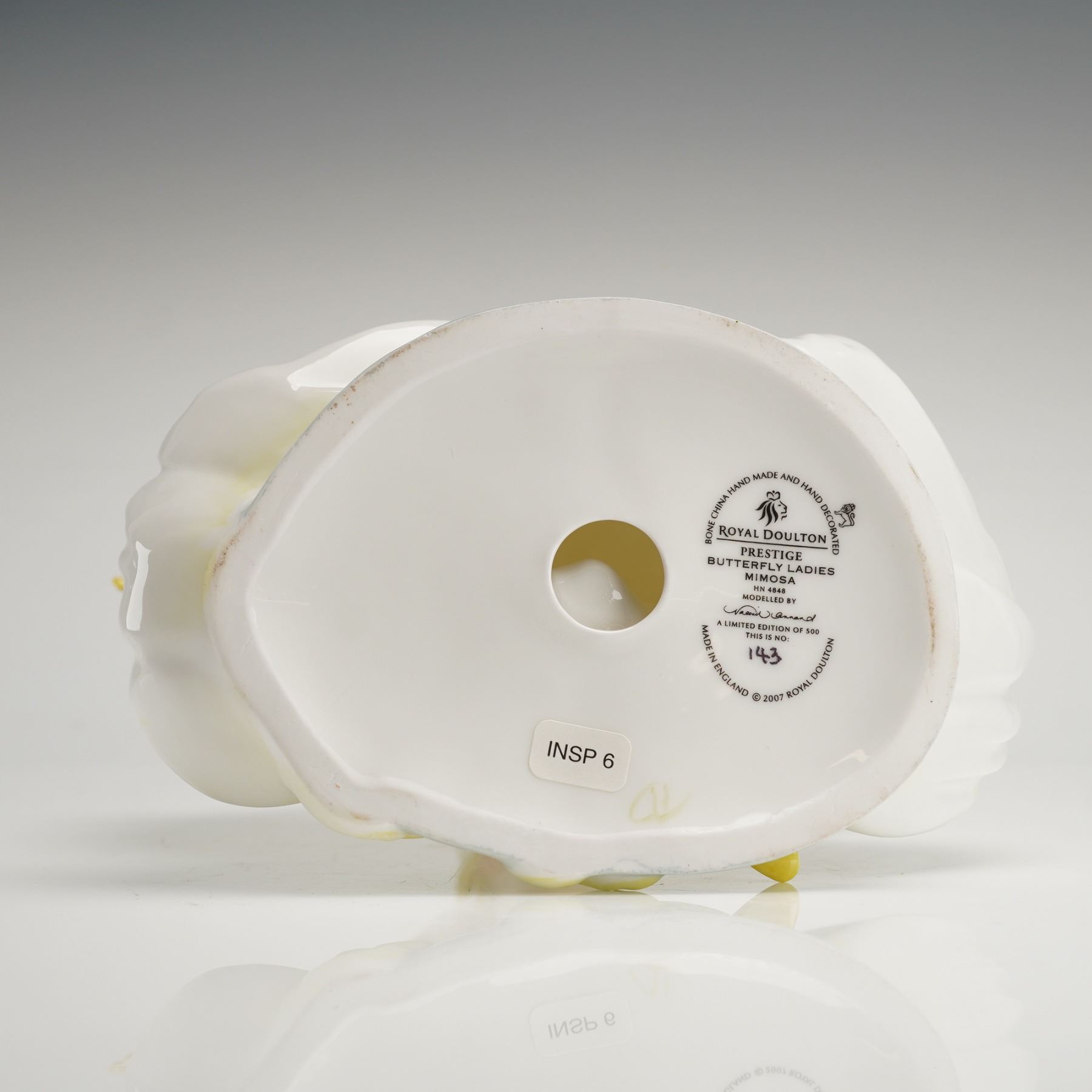 A single glazed porcelain butterfly ladies mimosa figurine, modeled by T C Curtis, HN4848. The figure depicts a female subject in a stylized, glamorous pose reminiscent of the Art Deco tradition, part of the Prestige Butterfly Ladies series. The figure is dressed in a dramatically flowing white gown accented with yellow coloration on the bodice, long gloves, shoes, and a hair ornament. The base bears the printed Royal Doulton backstamp, confirming the title 'Mimosa' and identifying it as a Limited Edition of 500, numbered 143. The backstamp also indicates the piece was made in England and hand decorated, dated 2007.