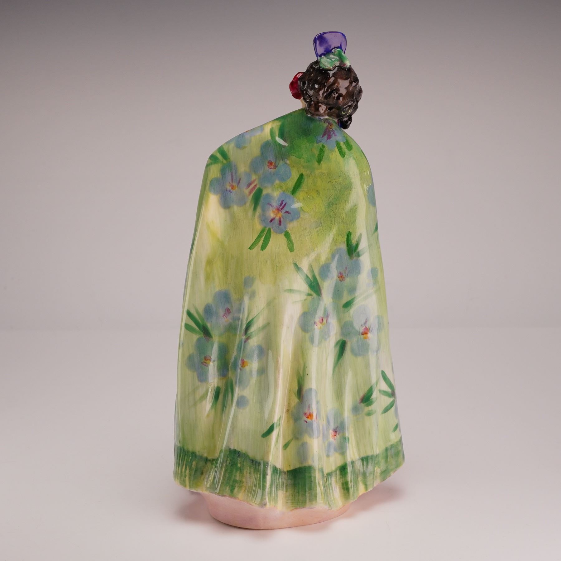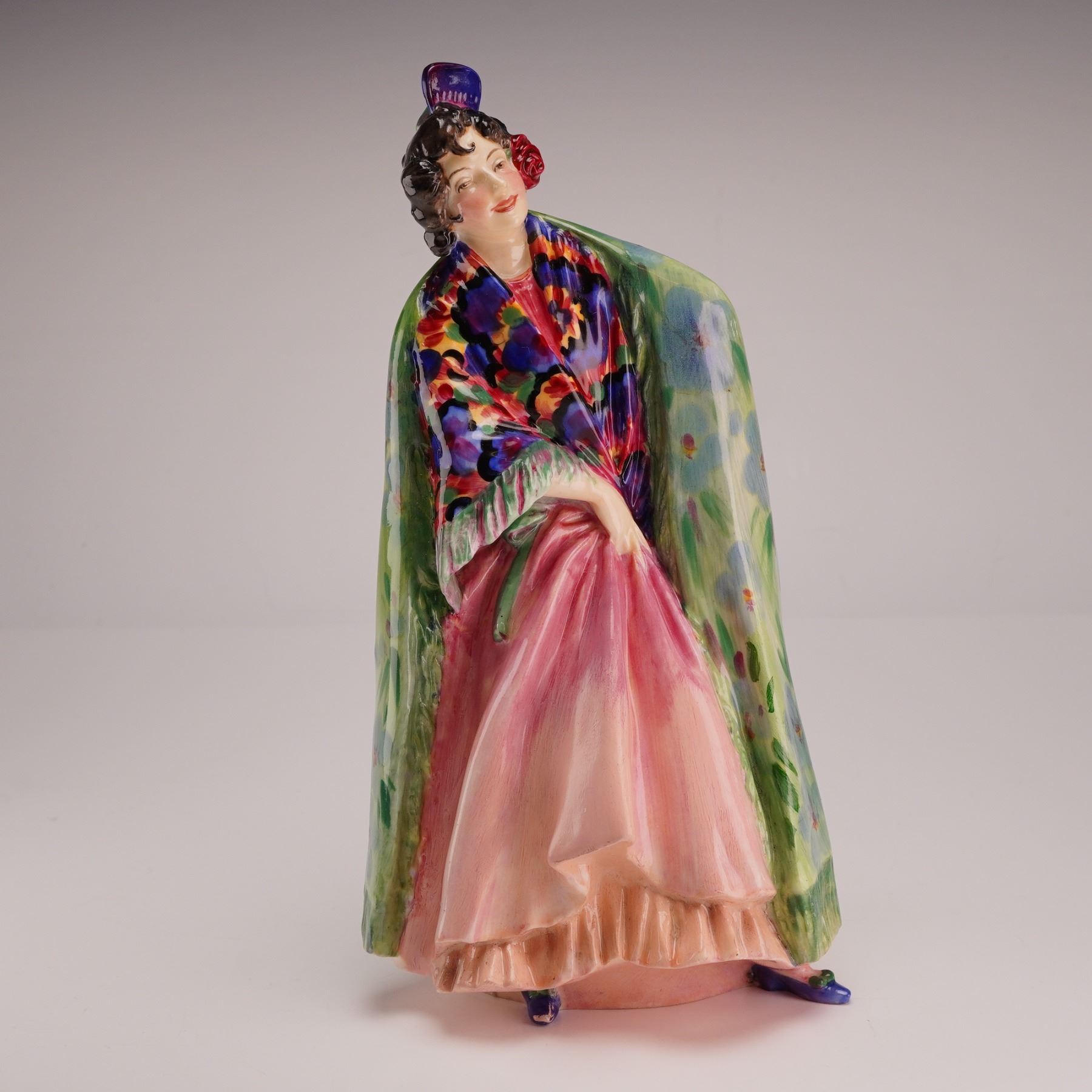 This polychrome hand-painted porcelain figure is finished with a high-gloss glaze. The subject is a woman in a standing pose, slightly lifting the hem of a voluminous pink tiered skirt. She wears a multicolored shawl with a fringed border over her shoulders; the front features an abstract floral pattern in shades of purple, red, yellow, and blue, while the reverse is decorated with a pale green ground and scattered blue flowers. Her dark hair is styled with a red flower and a small purple headpiece. The base is marked with the Royal Doulton backstamp.