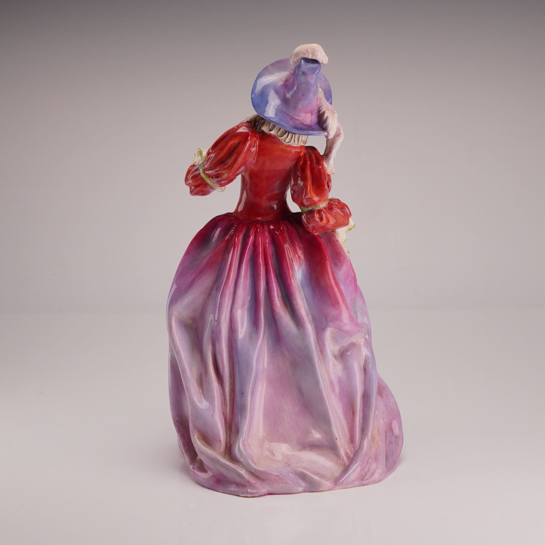 The figure is depicted in historical costume, featuring a wide-brimmed purple hat with a white feather, a ruffled collar, a red bodice with puffed sleeves, and a skirt in shades of purple and pink. The woman is posed holding a dark fan. The base is marked with the Royal Doulton backstamp.
