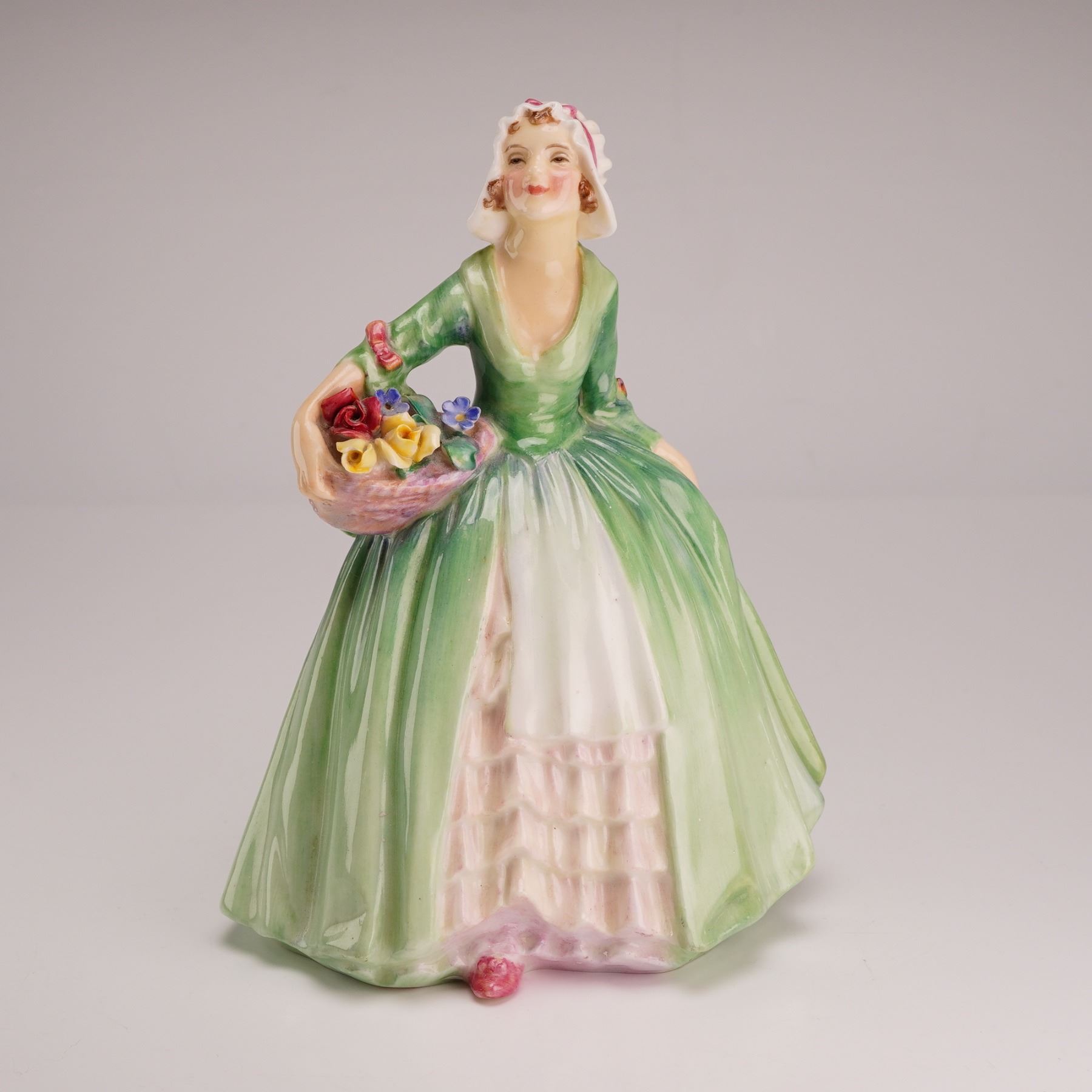 The piece depicts a young woman in 18th-century style attire, featuring a full-skirted green dress, a white apron, and a white bonnet accented with pink. She carries a pink-tinged basket filled with multi-colored flowers in her right hand. The base is marked with the Royal Doulton backstamp.