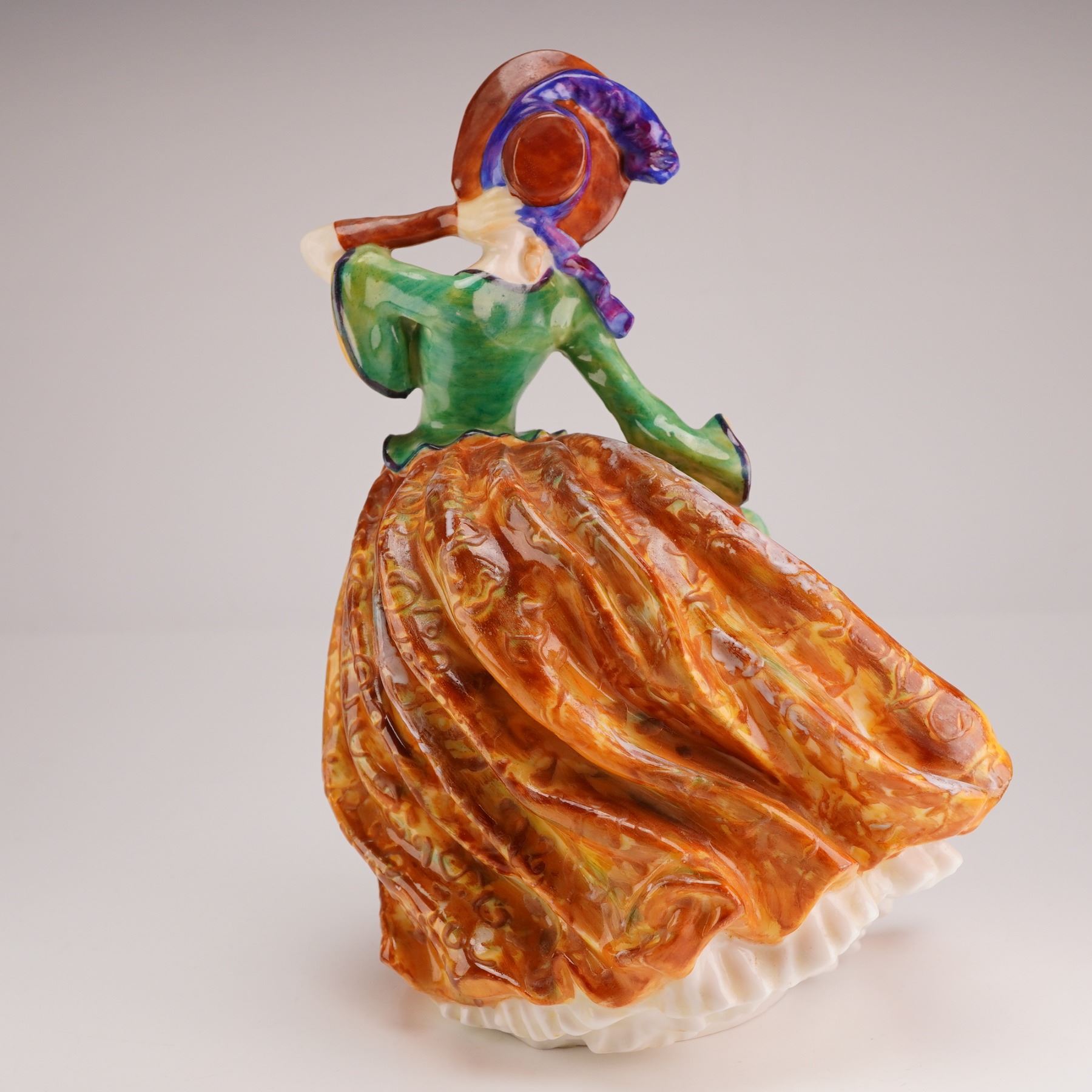 The piece depicts a woman in mid-19th-century attire, featuring a wide-brimmed green hat accented with a purple bow, a green jacket, and a voluminous, wind-swept orange and yellow dress decorated with an intricate pattern. The figure is shown holding a green muff in her right hand while her left hand is raised to steady her hat against the wind. The base is marked with the Royal Doulton backstamp.
