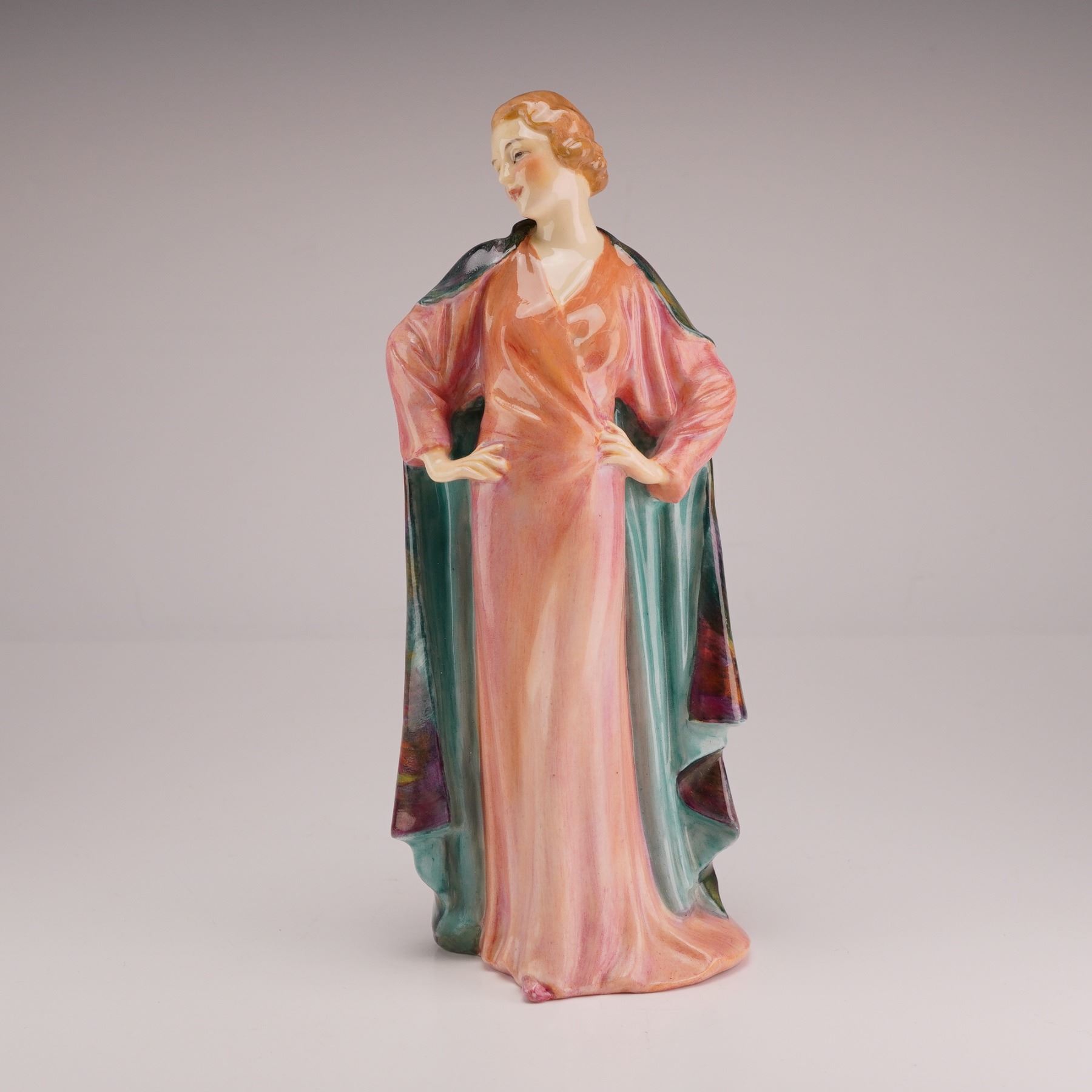 The figure is depicted in an Art Deco pose with hands on hips and head tilted. She wears a floor-length salmon-pink gown with a V-neckline, draped with a voluminous cloak featuring a multi-colored mottled glaze in shades of green, purple, yellow, and orange. The base is marked with the Royal Doulton backstamp.