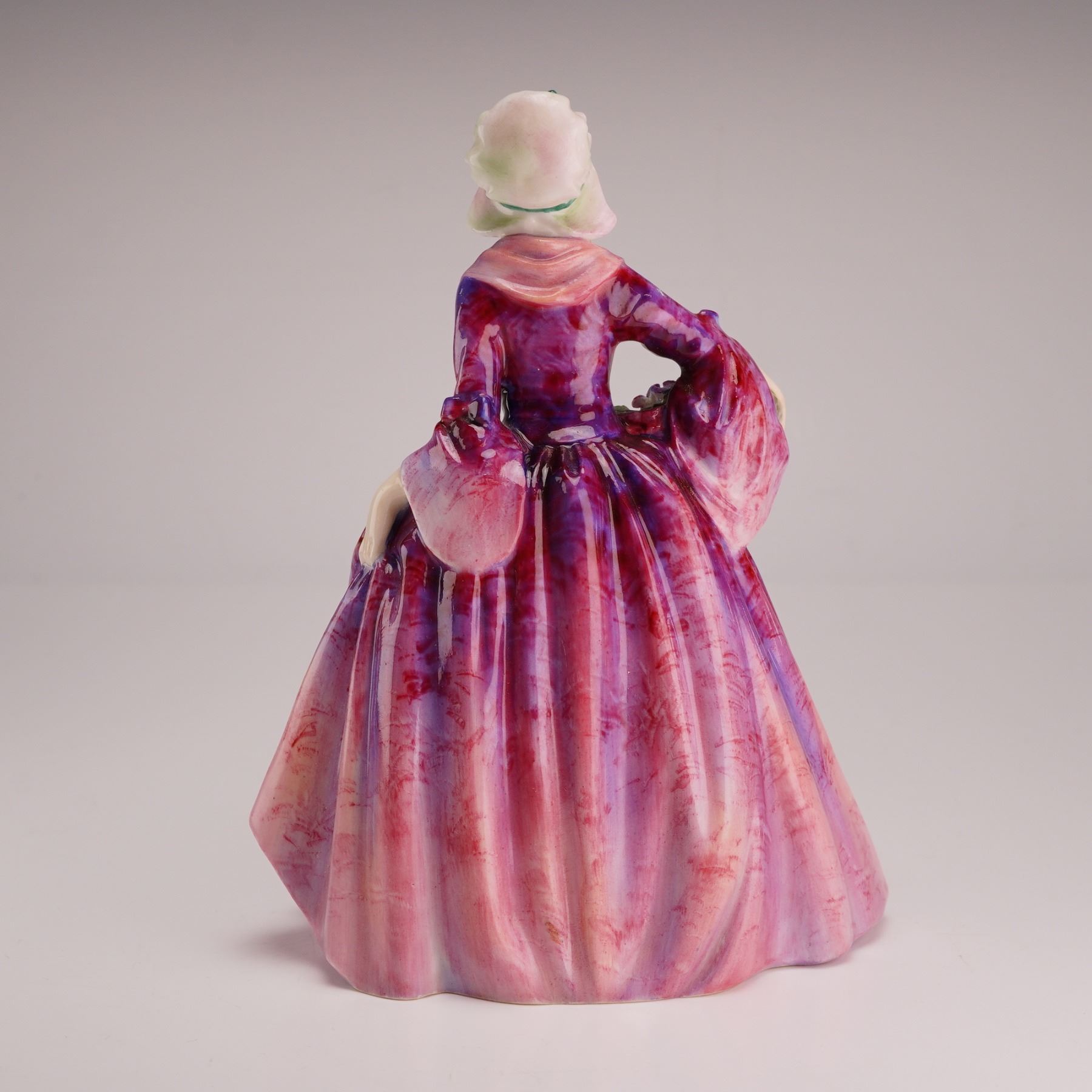 The piece depicts a young woman in 18th-century style attire, featuring a wide-brimmed white bonnet with floral accents and a shallow basket filled with polychrome roses. The dress is finished in a mottled glaze of magenta, purple, and pink tones over a white ruffled underskirt and apron. The base is marked with the Royal Doulton backstamp.