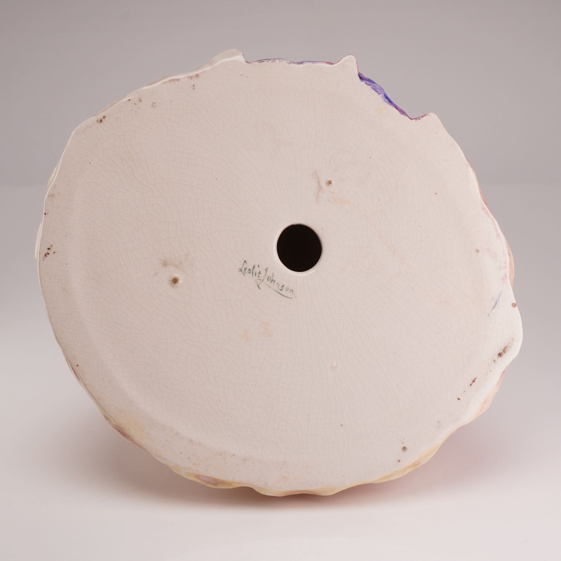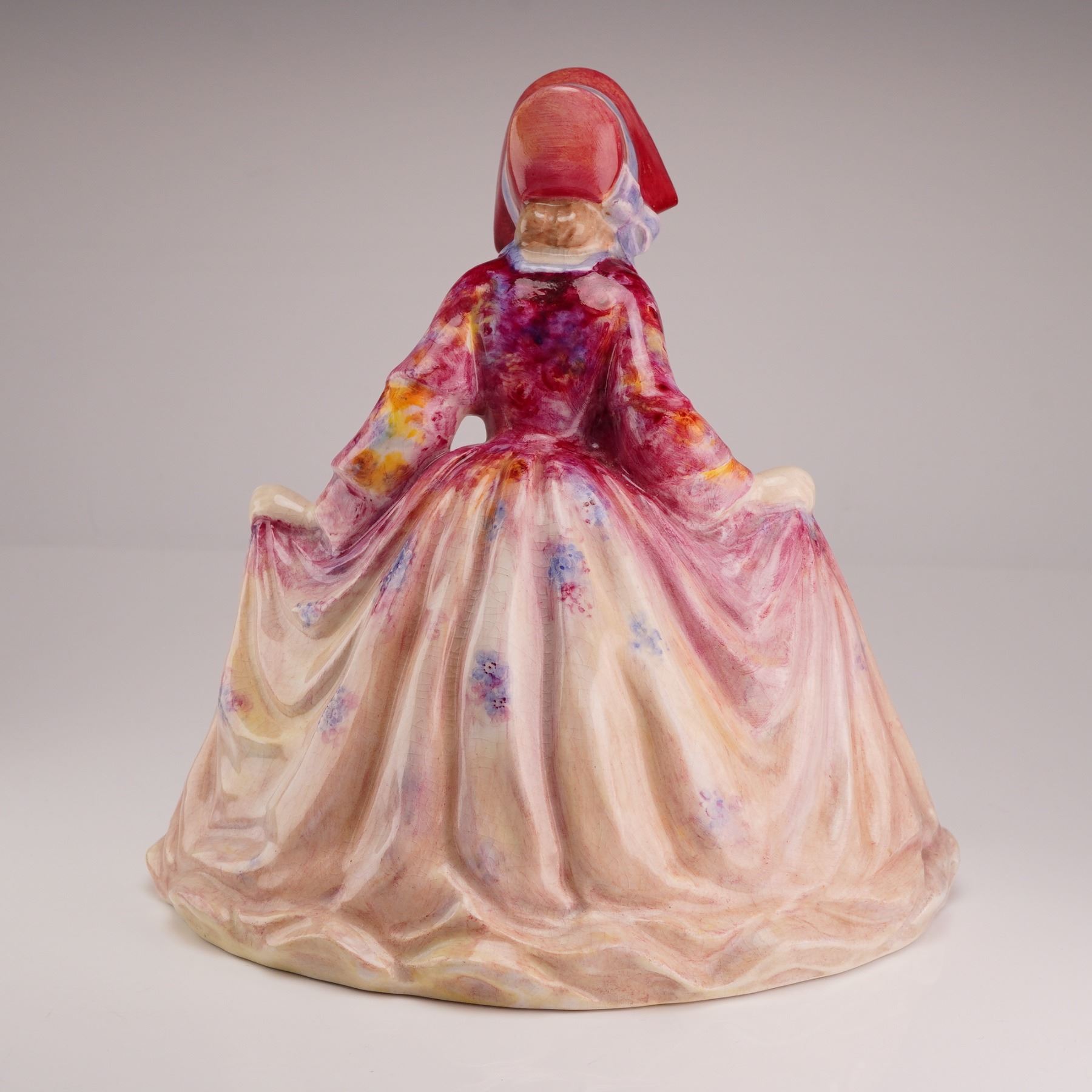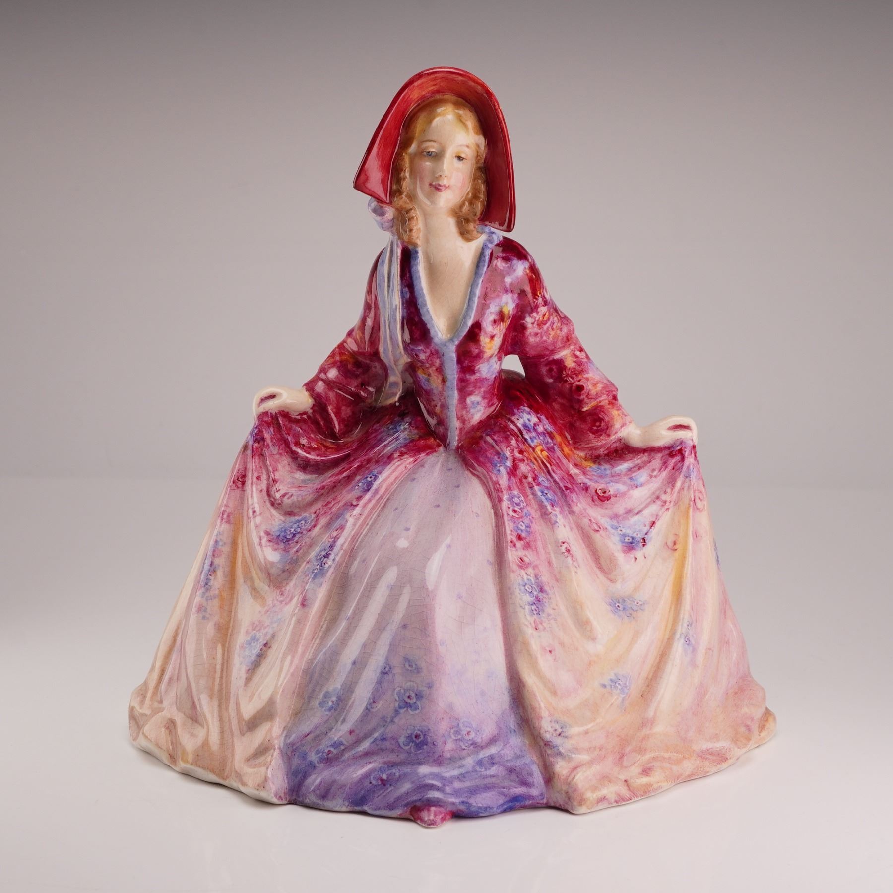 Leslie Johnson's tenure at Royal Doulton spanned one of the most creative eras in the pottery industry. Active mainly from 1900 to 1920, he focused on hand-painted porcelain plaques and decorative figures, demonstrating remarkable skill in capturing Edwardian refinement. This figure is dressed in a wide-skirted gown with long sleeves and a striking red hood. The decoration is rendered in a painterly style using a palette of magenta, lavender, and pale yellow, accented with delicate floral motifs. The figure is depicted gently lifting the hem of her skirt. Crafted from glazed porcelain or ceramic with a high-gloss finish, the piece has an unglazed base bearing Leslie Johnson's hand-painted signature in green script.