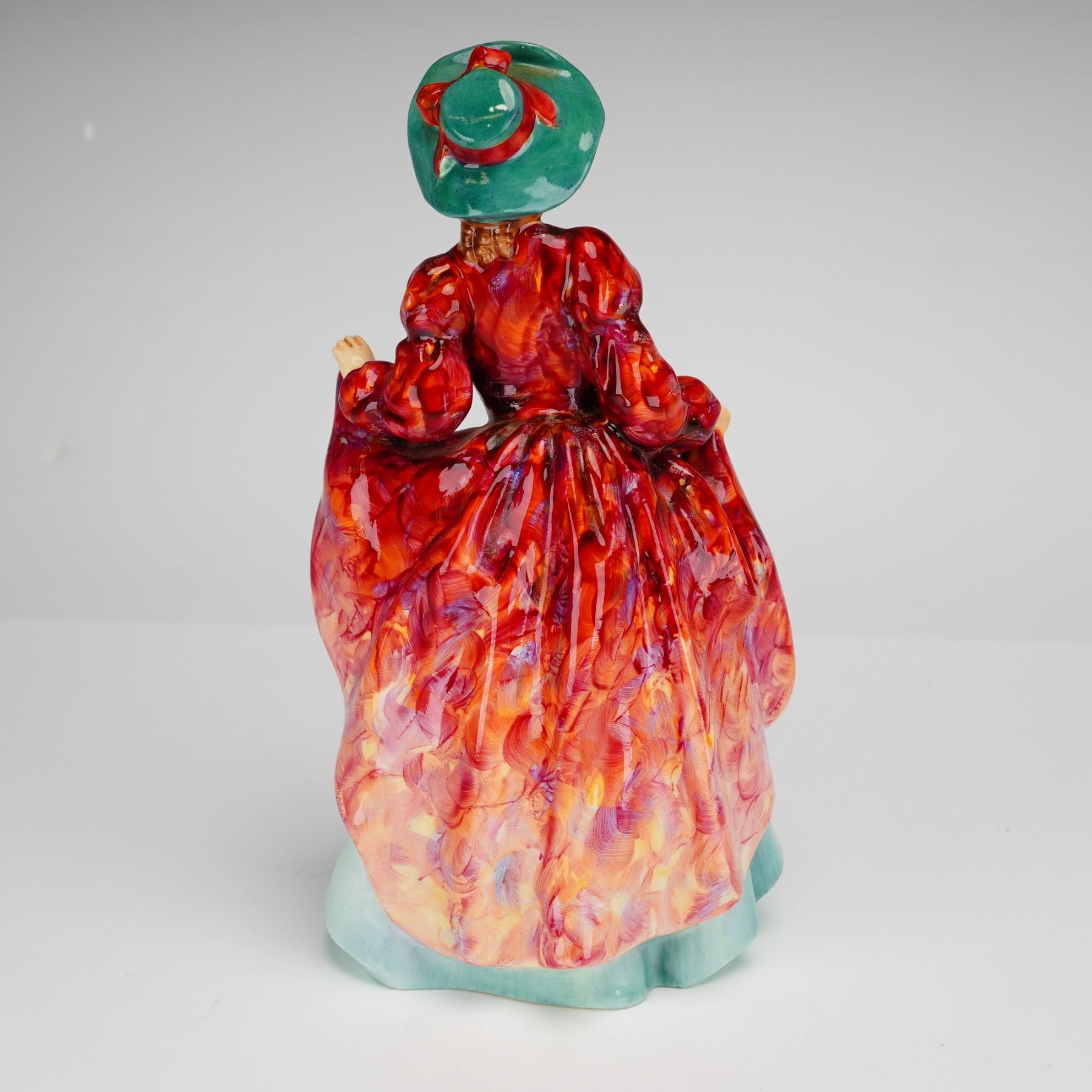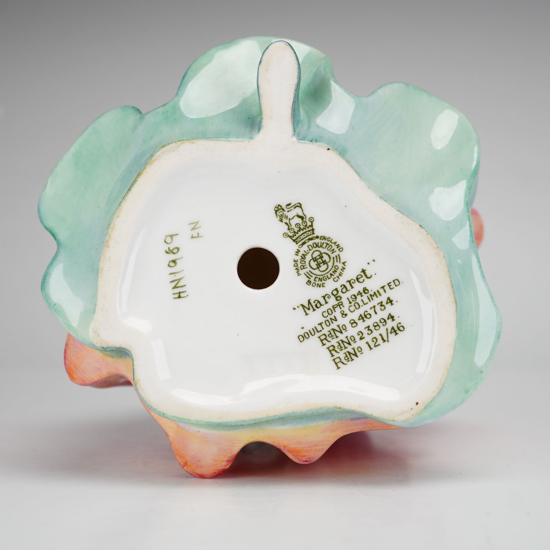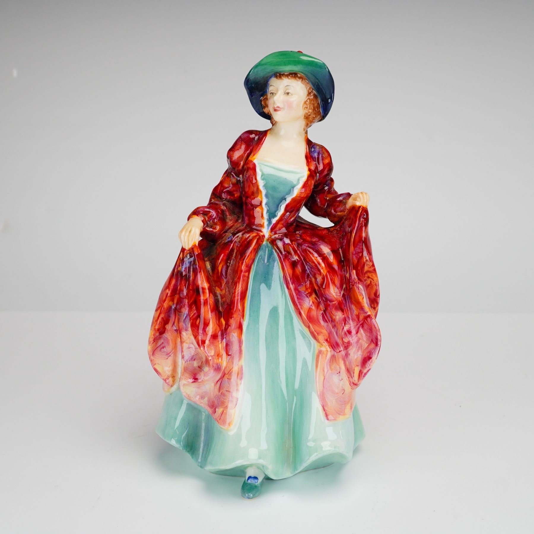 A fine Royal Doulton bone china figurine titled Margaret, model number HN1989, designed by Leslie Harradine. This vintage piece depicts a woman in 18th-century style dress, featuring a vibrant mottled overskirt in shades of red, orange, and yellow over a seafoam-green underskirt and bodice. She wears a coordinating green wide-brimmed hat with a red ribbon. The base is fully marked with the Royal Doulton lion and crown logo, the title Margaret, and a 1946 copyright date. It includes registration numbers RdNo 846734, RdNo 23894, and RdNo 121/46, along with the hand-painted model number HN1989 and decorator mark EN. Height: 7.25 inches.