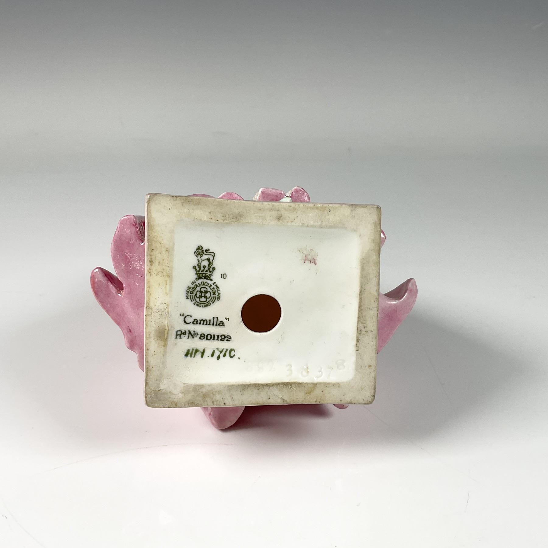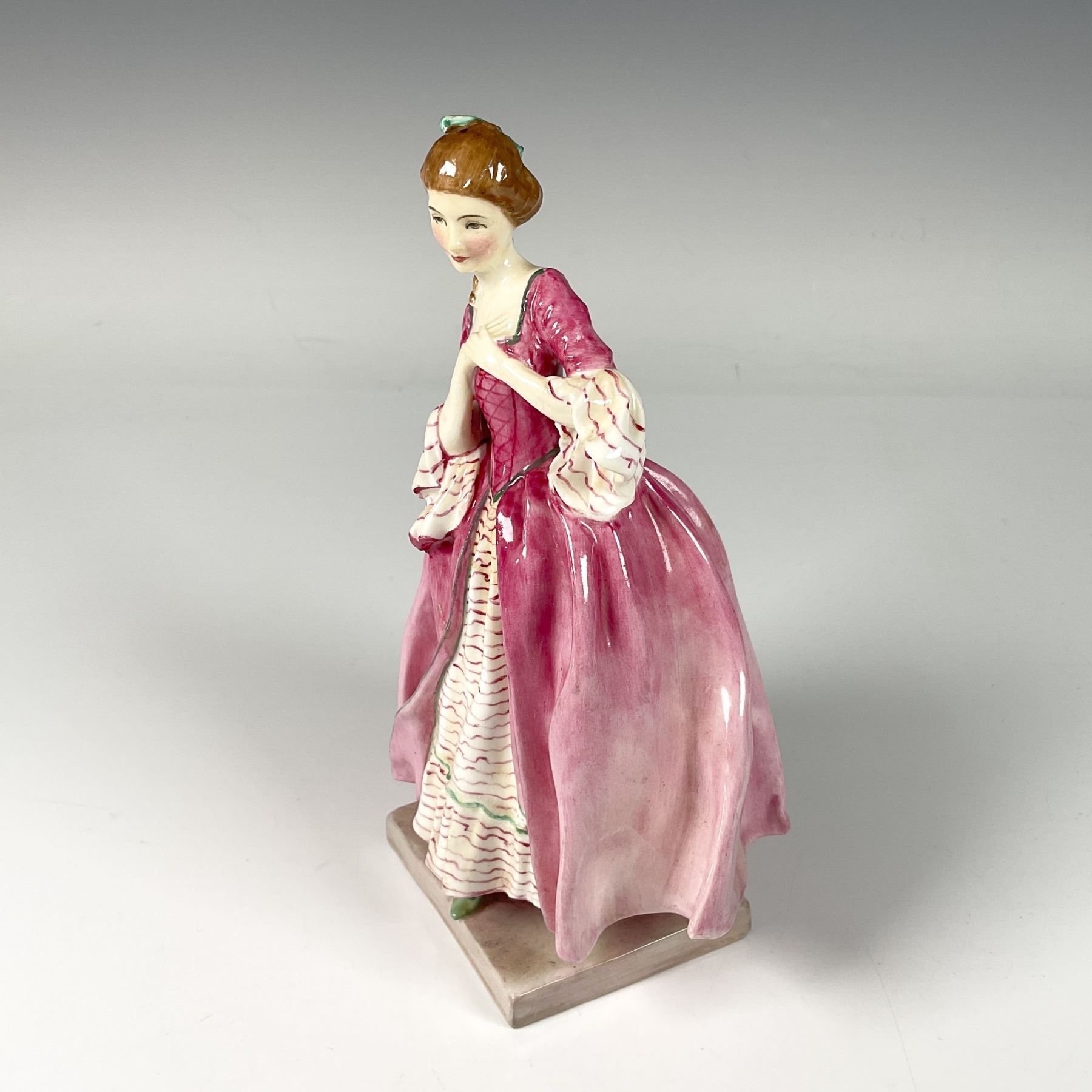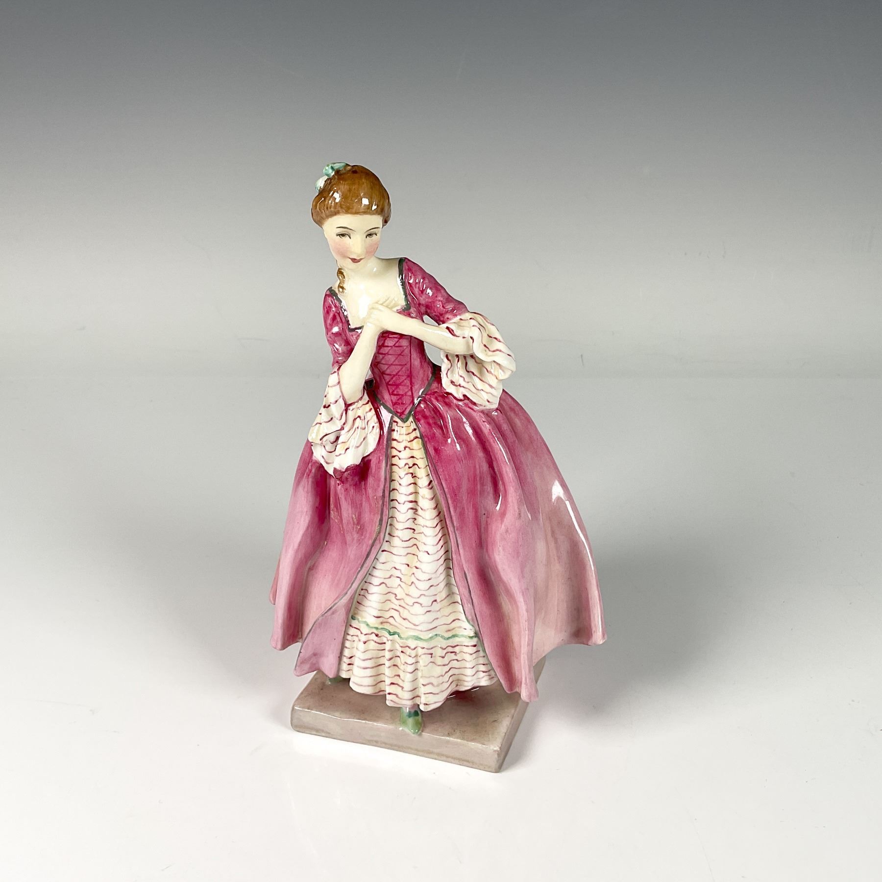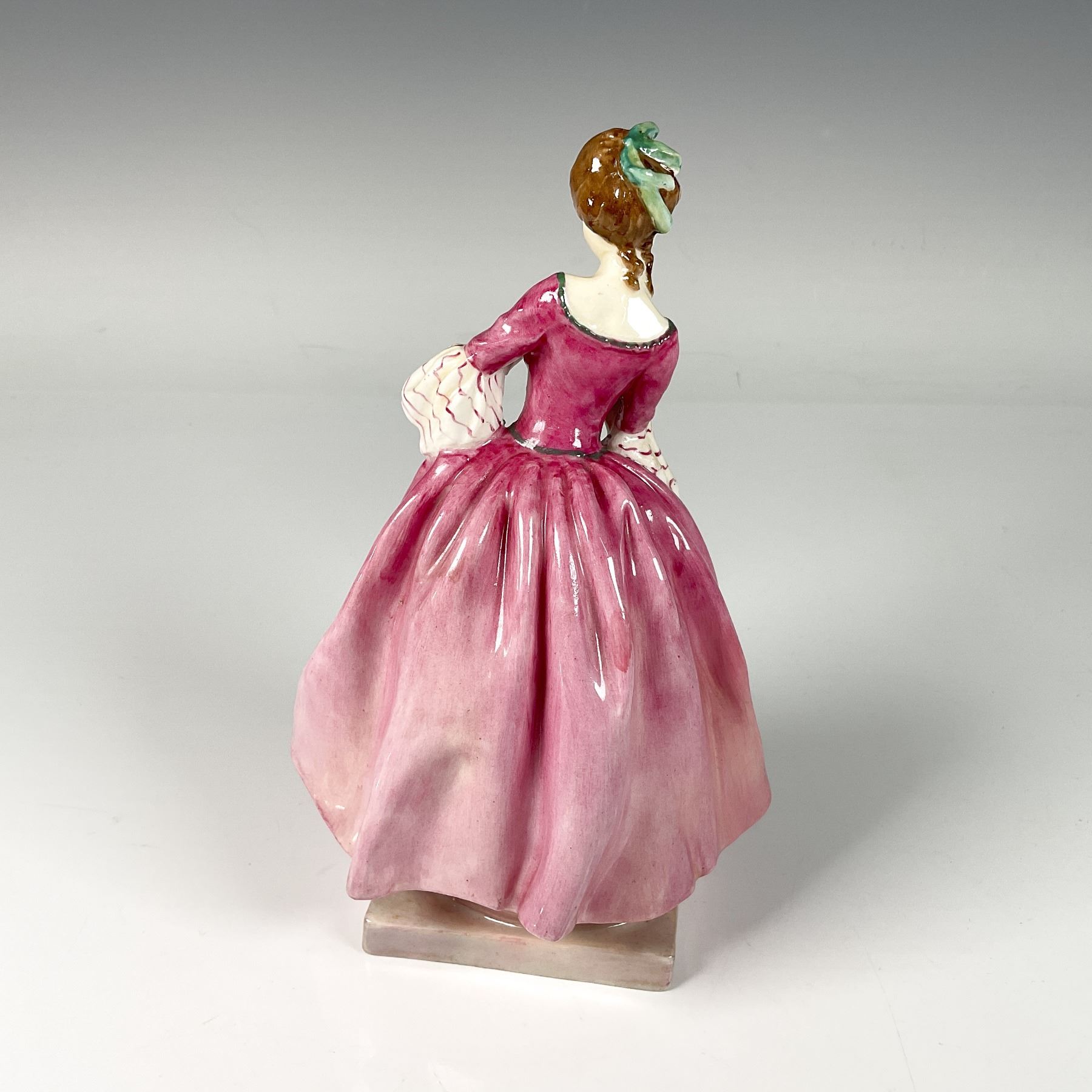 Hand painted and hand decorated figure of a charming girl with rosy cheeks, dressed in a lovely rose pink dress as she ties her hair with a green ribbon accent. Royal Doulton backstamp.