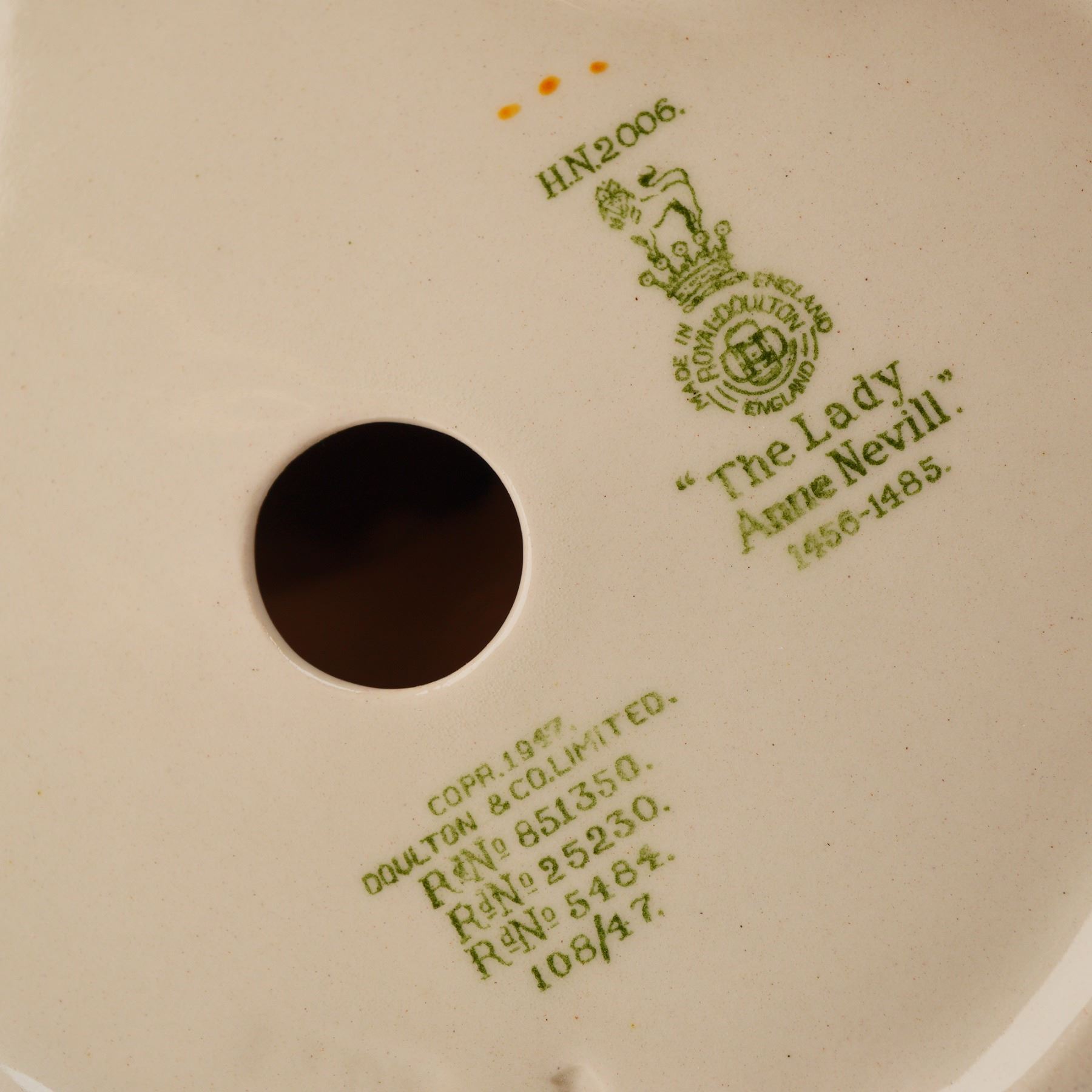 A single glazed porcelain figurine, identified as Royal Doulton The Lady Anne Nevill HN2006. The figure depicts the historical figure Anne Nevill (1456-1485) wearing a long, voluminous royal blue gown featuring a mottled glaze, trimmed in white with simulated ermine spots. She wears a distinctive pointed white headdress and is accented with gold paint on the necklace and headdress. The base of the figurine is marked in green with the Royal Doulton crown logo and text reading "MADE IN ENGLAND," the model name "The Lady Anne Nevill." (1456-1485), the model number HN.2006, and "COPPR. 1947. DOULTON & CO. LIMITED." Additional markings include registration numbers R.No 851350, R.No 25230, R.No 5484, and a hand-painted notation 108/47.