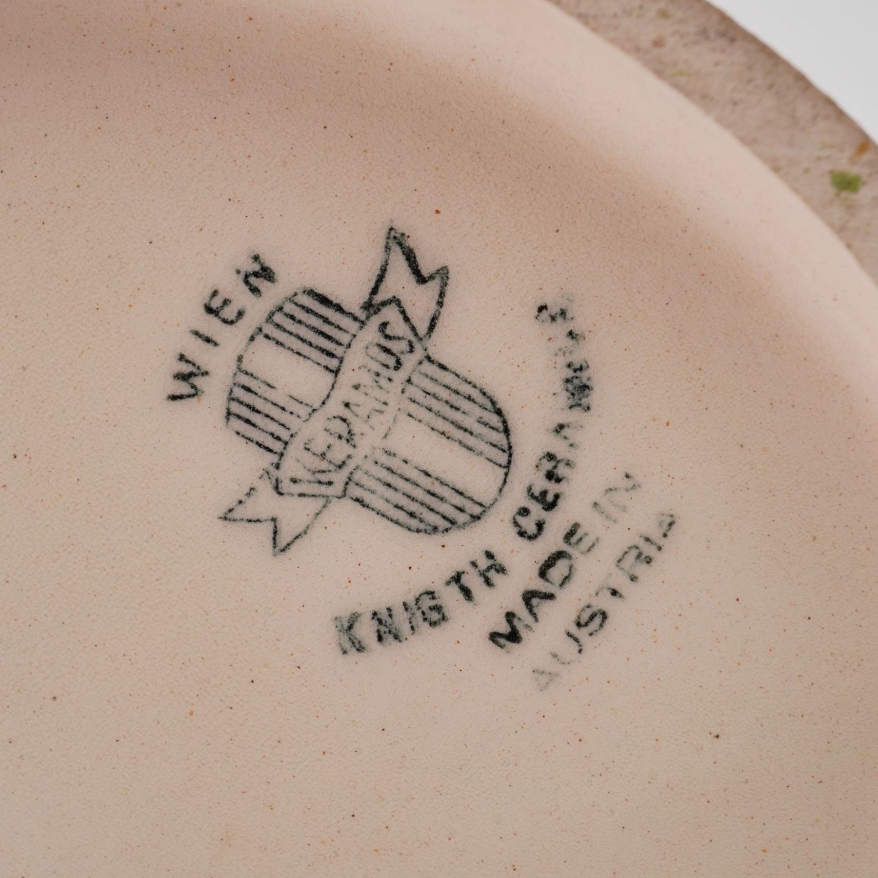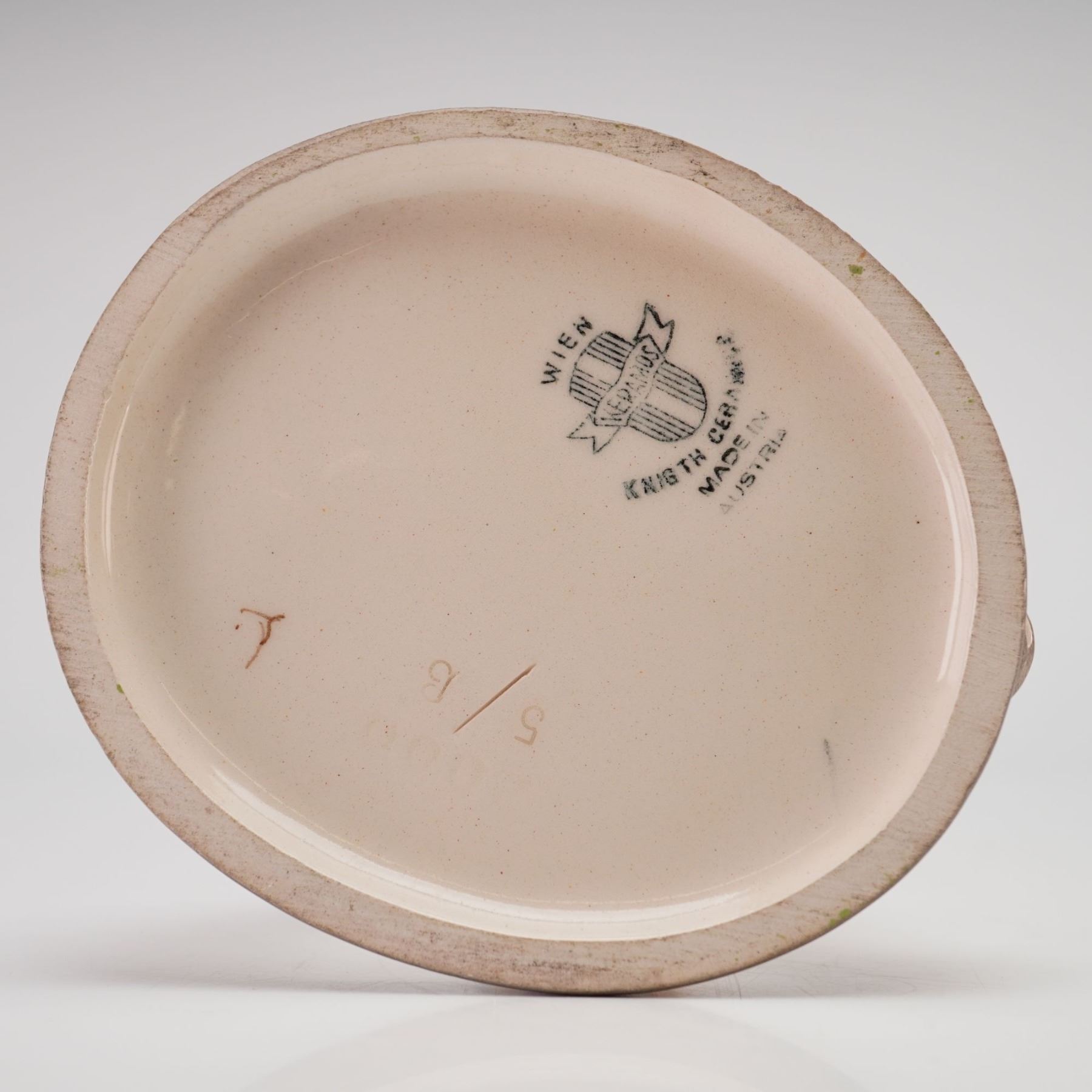 Vienna hand-painted figure designed by Austrian artist Stefan Dakon (1904-1992), known for his contributions to Art Deco sculpture. This example, numbered 5 of 8, portrays a young boy dressed in a yellow shirt with blue shorts and matching hat, holding a tennis racket. Marked "Keramos Wien Knight" on the underside. Impressed marked 2000, and incised marked 5/8.