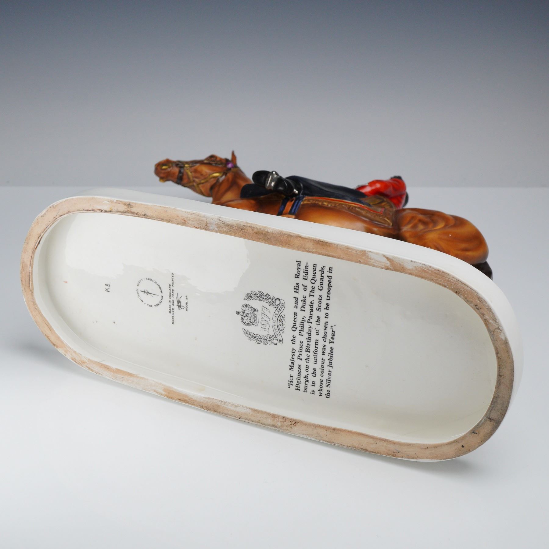 This hand-painted glazed porcelain equestrian figure by Michael Sutty depicts Her Majesty Queen Elizabeth II during the 1977 Silver Jubilee Trooping the Colour. The Queen is portrayed riding sidesaddle on a chestnut horse, wearing the ceremonial uniform of the Colonel-in-Chief of the Scots Guards. The uniform features a scarlet tunic with a blue Garter sash, miniature medals, and a black tricorn hat with a feathered plume. The horse is detailed with a decorated bridle and a saddlecloth bearing royal insignia. The underside of the base includes the Michael Sutty Porcelain Manufactory circular stamp with a central sword symbol, along with the printed marks Made in England and Modelled and Hand Painted. The base also features a hand-painted model number 2 and decorator initials KS in black. A commemorative laurel wreath crest topped with a crown contains the text 1977 The Queens Silver Jubilee. A printed paragraph on the base describes the Queen and Prince Philip on the Birthday Parade in the uniform of the Scots Guards. This figure is offered as-is and does not include reins.