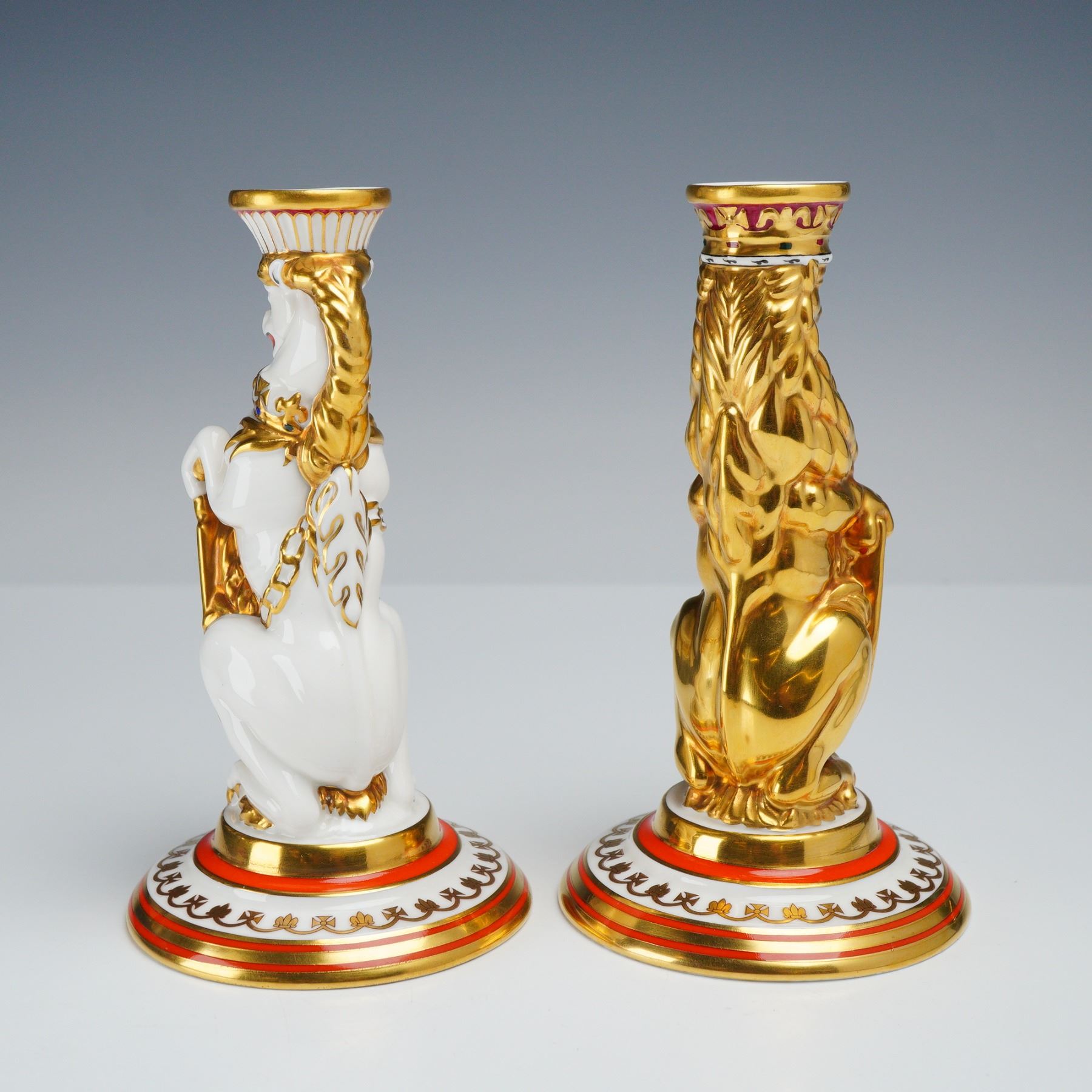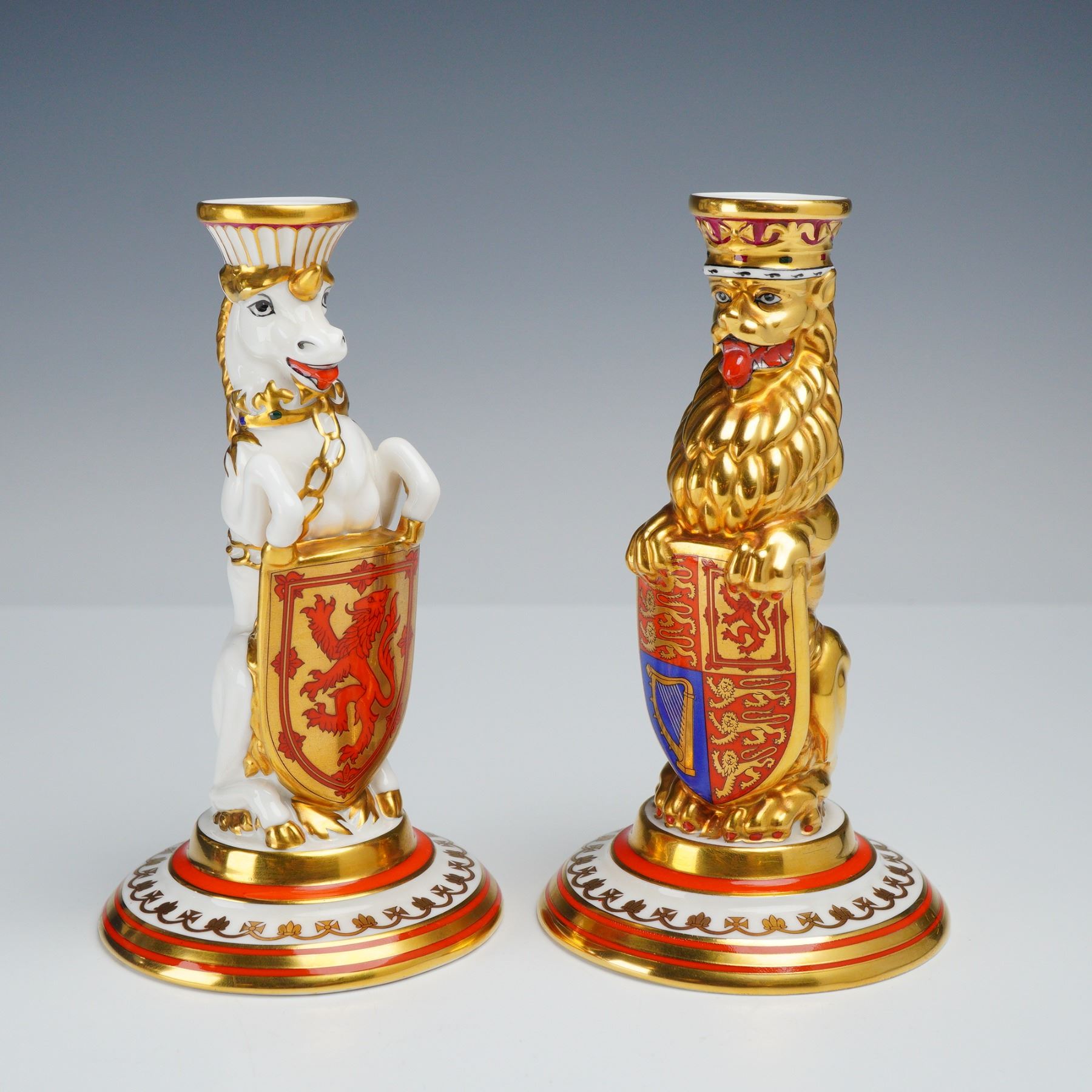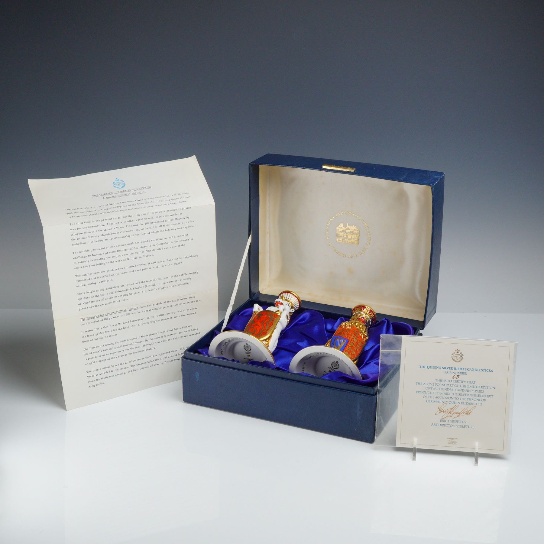 A pair of Minton fine bone china figural candlesticks titled The Queen's Silver Jubilee Candlesticks, produced in 1977 to commemorate the 25th anniversary of the accession of Queen Elizabeth II. The set depicts the heraldic beasts of the Royal Arms: the Lion of England and the Unicorn of Scotland. The Lion is decorated in 22-karat gold gilding, depicted sejant and holding a shield featuring the Royal Coat of Arms of the United Kingdom in polychrome enamels. The Unicorn is rendered in a white glaze with a gilded horn, mane, and crown-and-chain collar, holding a shield with the red Lion Rampant of Scotland on a gold ground. Both figures are set upon circular, stepped bases decorated with concentric red and gold bands and a formal gilt laurel leaf border. The candle nozzles are designed as stylized crowns. The figures were modeled by William K. Harper under the direction of Eric Griffiths, Minton's then-Director of Sculpture. The underside of each candlestick features marks applied in gold. The outer edge of the base reads: Number 63 of a Limited Edition of 250 - 1977 - The Queen's Silver Jubilee - 1952. The central maker's mark consists of a laurel wreath enclosing Founded Minton 1793, with Bone China and Made in England printed below. A retailer mark for Mulberry Hall York Fine China and Crystal Specialists is also present. This lot includes the original blue satin-lined presentation box, a historical descriptive pamphlet, and a certificate of authenticity identifying this set as pair number 63 of 250, signed by Art Director Eric Griffiths.