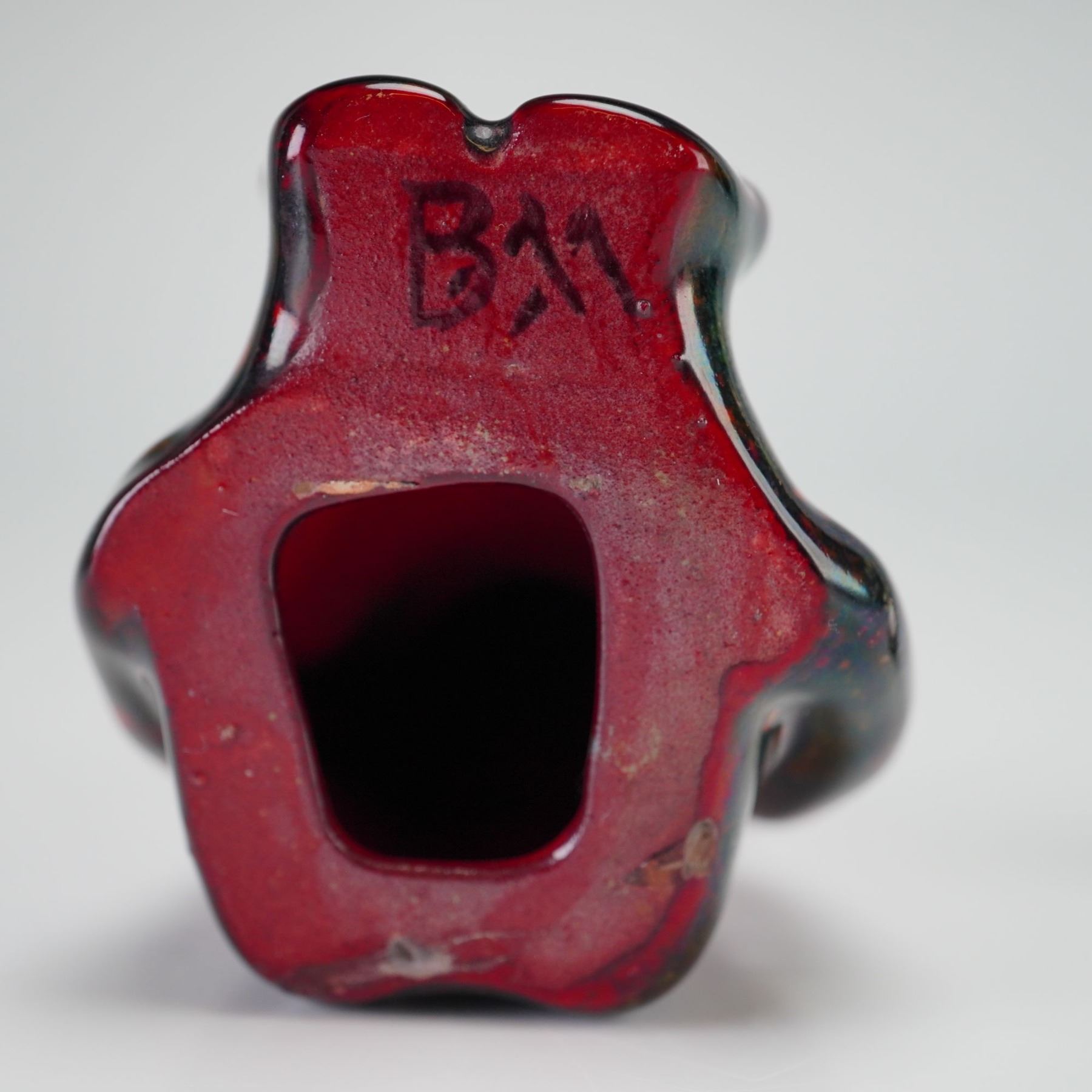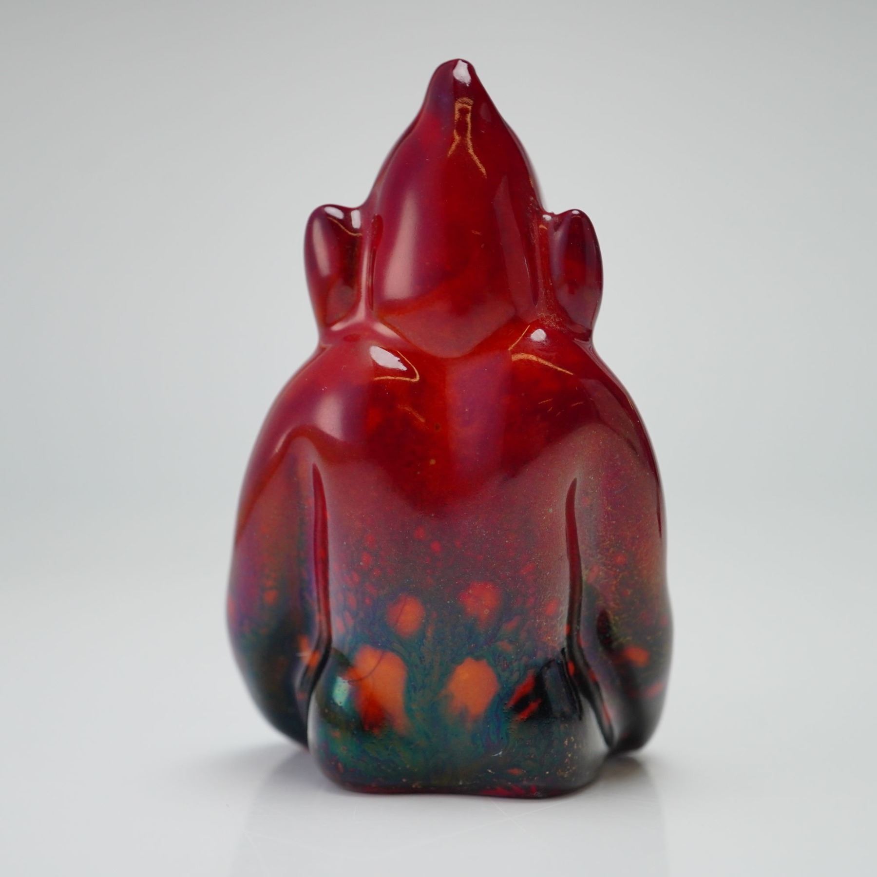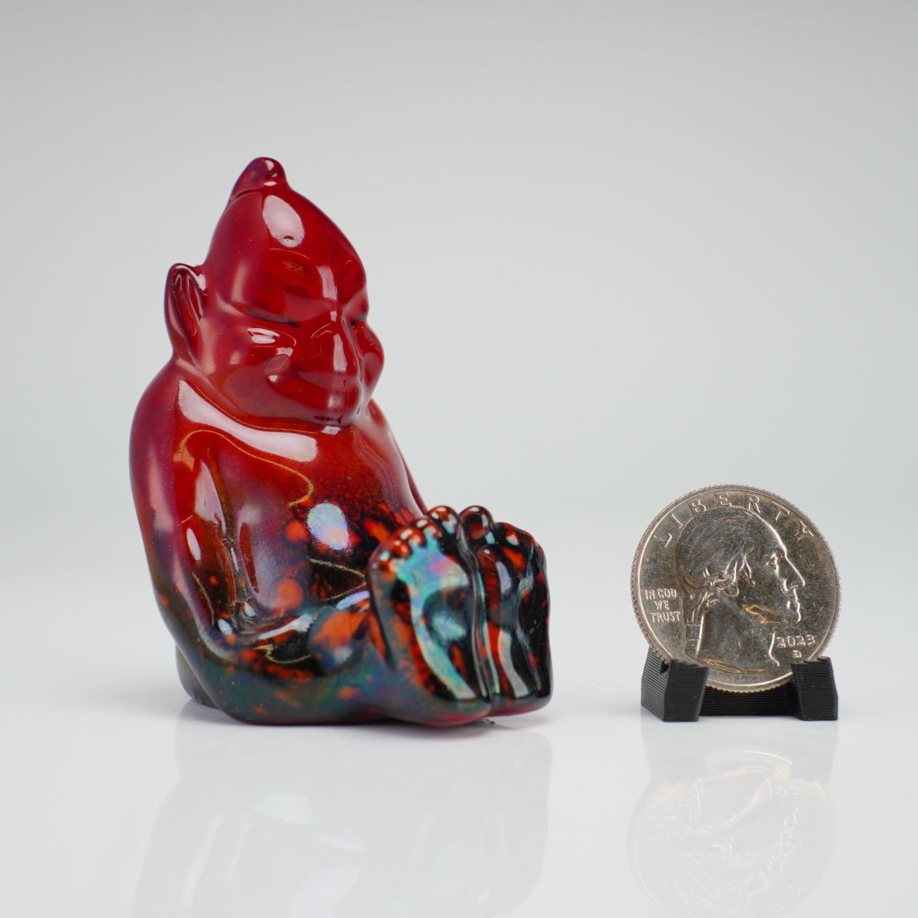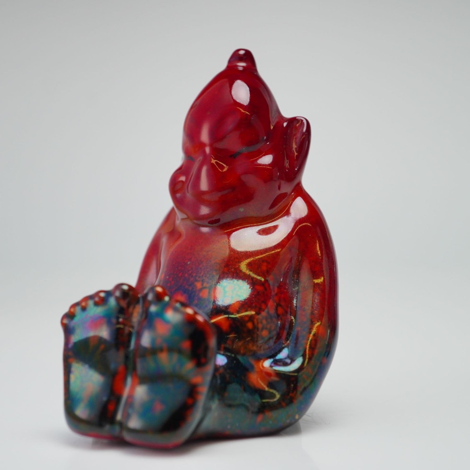 Inspired by the Billiken charm doll, this figure represents the small, grinning character with pointed ears, a rounded belly, and a playful expression, seated with legs extended. The Billiken charm doll was created in 1908 by American artist Florence Pretz and sold as a good luck figure. Rising to popularity during the "Mind-Cure" movement in early twentieth-century America, it embodied the ideal of carefree living. This Bernard Moore example features a pointed crown, pronounced ears, a wide smile, and oversized feet. It is finished in a glaze of rich red tones blending into dark metallic shades at the base. The underside is marked BM for Bernard Moore.