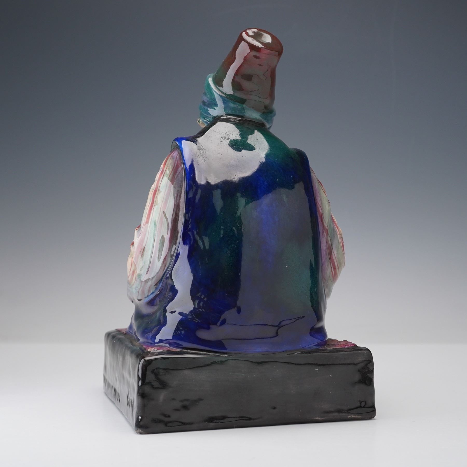 A vintage prototype colorway , modelled seated cross-legged upon a rectangular base. Depicted in traditional attire; striped shirt, blue-green coat and trousers. Handwritten title and "Potted by Doulton & Co." Royal Doulton backstamp.