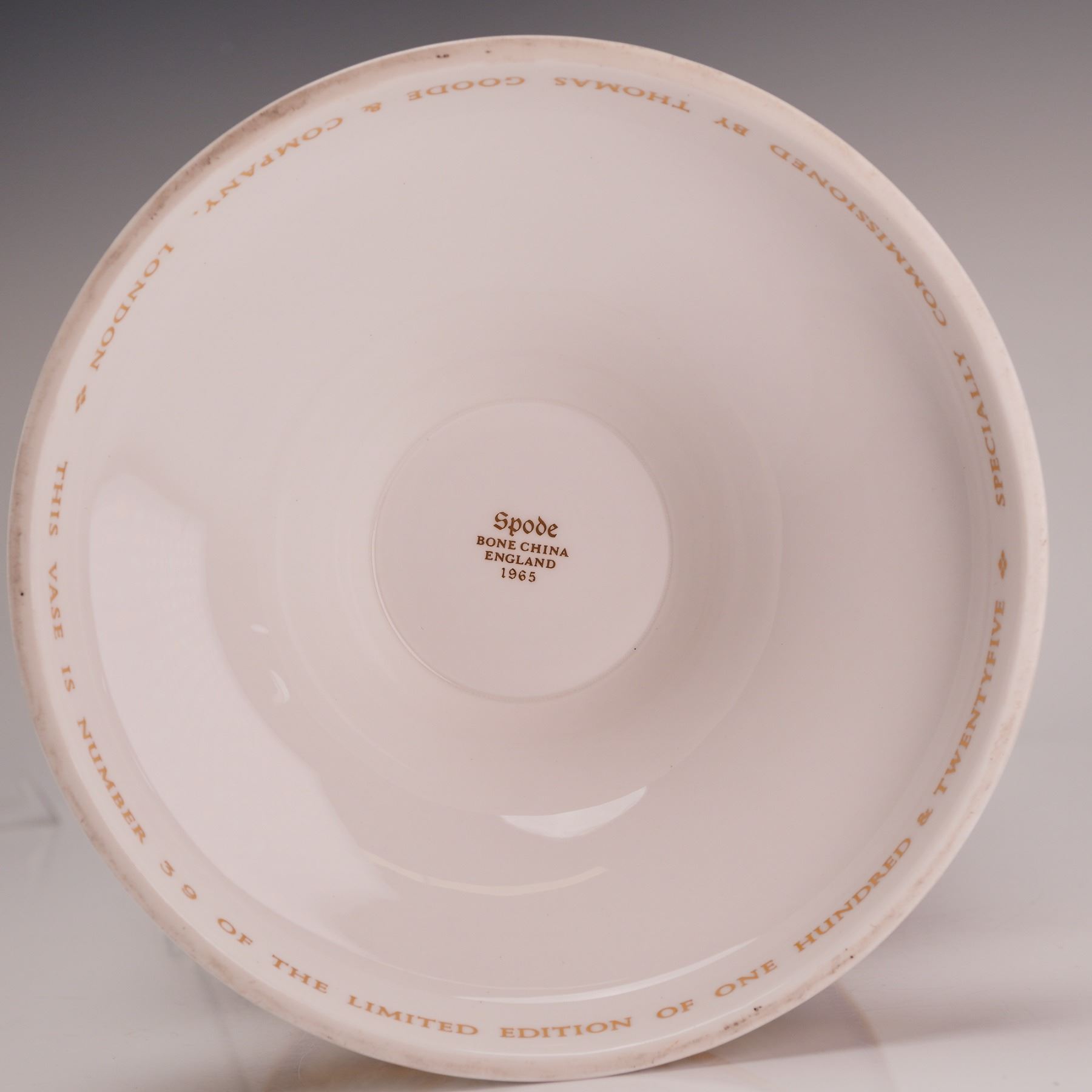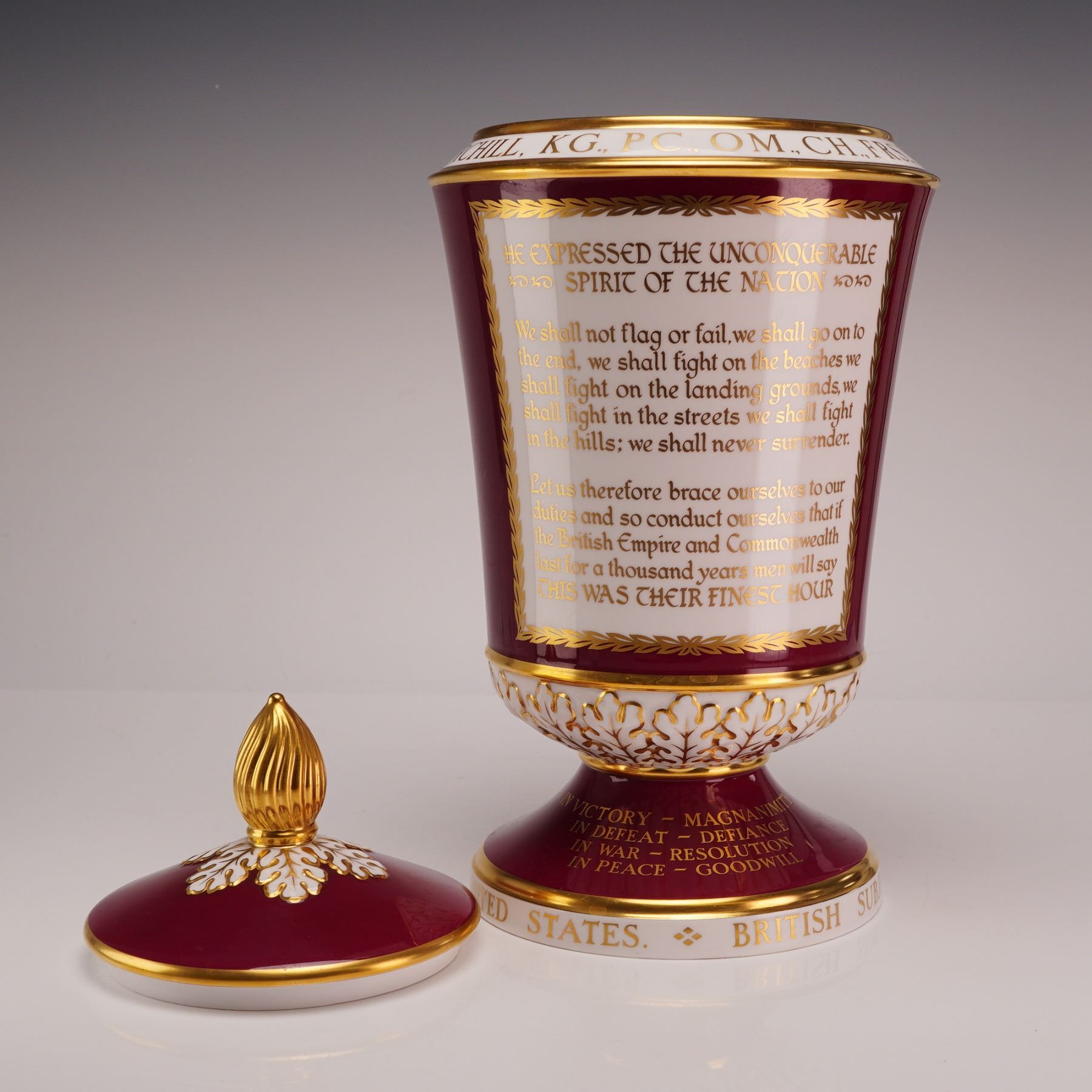 A fine bone china commemorative covered urn produced by Spode in 1965 to honor Sir Winston Churchill. This piece was specially commissioned by the luxury retailer Thomas Goode and Company, London. It is a limited edition vessel, designated as number 39 of 125. The urn features a tapered body, a stepped foot, and a domed lid with a gilded bud-form finial. The decoration consists of a rich claret ground with extensive hand-applied gilding. The front displays a central circular medallion with a transfer-printed portrait of Churchill, surrounded by a blue garter with the gilt motto Honi Soit Qui Mal Y Pense and flanked by golden heraldic lions. Banners below note his birth and death dates (November 30th 1874 and January 24th 1965) with the inscription In Grateful Remembrance. The back features a white panel with a gilded border containing excerpts from his wartime speeches, including We shall never surrender and This was their finest hour. Gilt text around the upper rim lists his honors (KG, PC, OM, CH, FRS), while the foot lists his terms as Prime Minister and his personal motto. The base of the foot identifies him as an Honorary Citizen of the United States. The lower portion of the body and the lid are decorated with relief-molded white acanthus-style foliage. The underside of the base features a brown Spode Bone China England 1965 transfer mark and gold lettering detailing the commission and edition number.