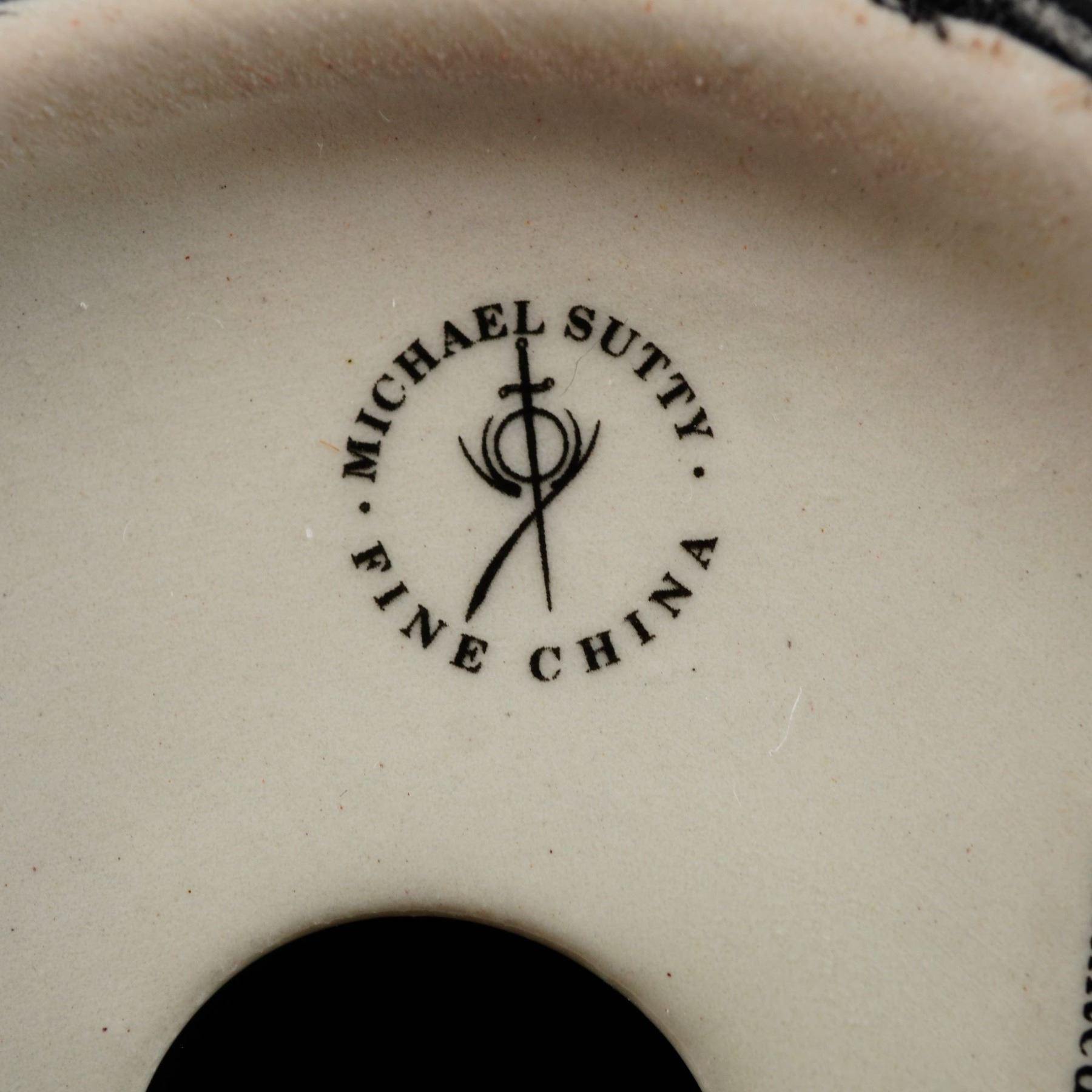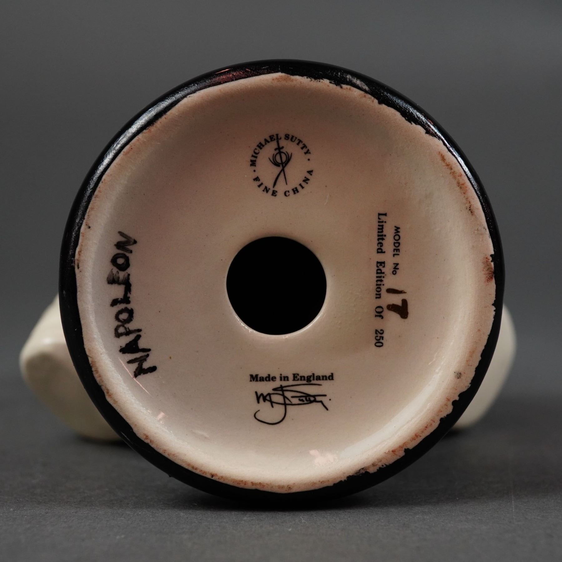 This rare white on black base Michael Sutty fine china bust of Napoleon Bonaparte is a limited edition porcelain figure. The subject is depicted in a traditional military uniform with a high collar and his iconic bicorne hat, mounted on an integral, stepped, black-glazed circular pedestal base. The underside is fully marked with the Michael Sutty circular factory stamp featuring a sword emblem, the origin mark Made in England, and hand-inscribed details including the subject name NAPOLEON, MODEL No 17, and Limited Edition Of 250. The piece also bears the hand-inscribed signature of the artist, Michael Sutty.