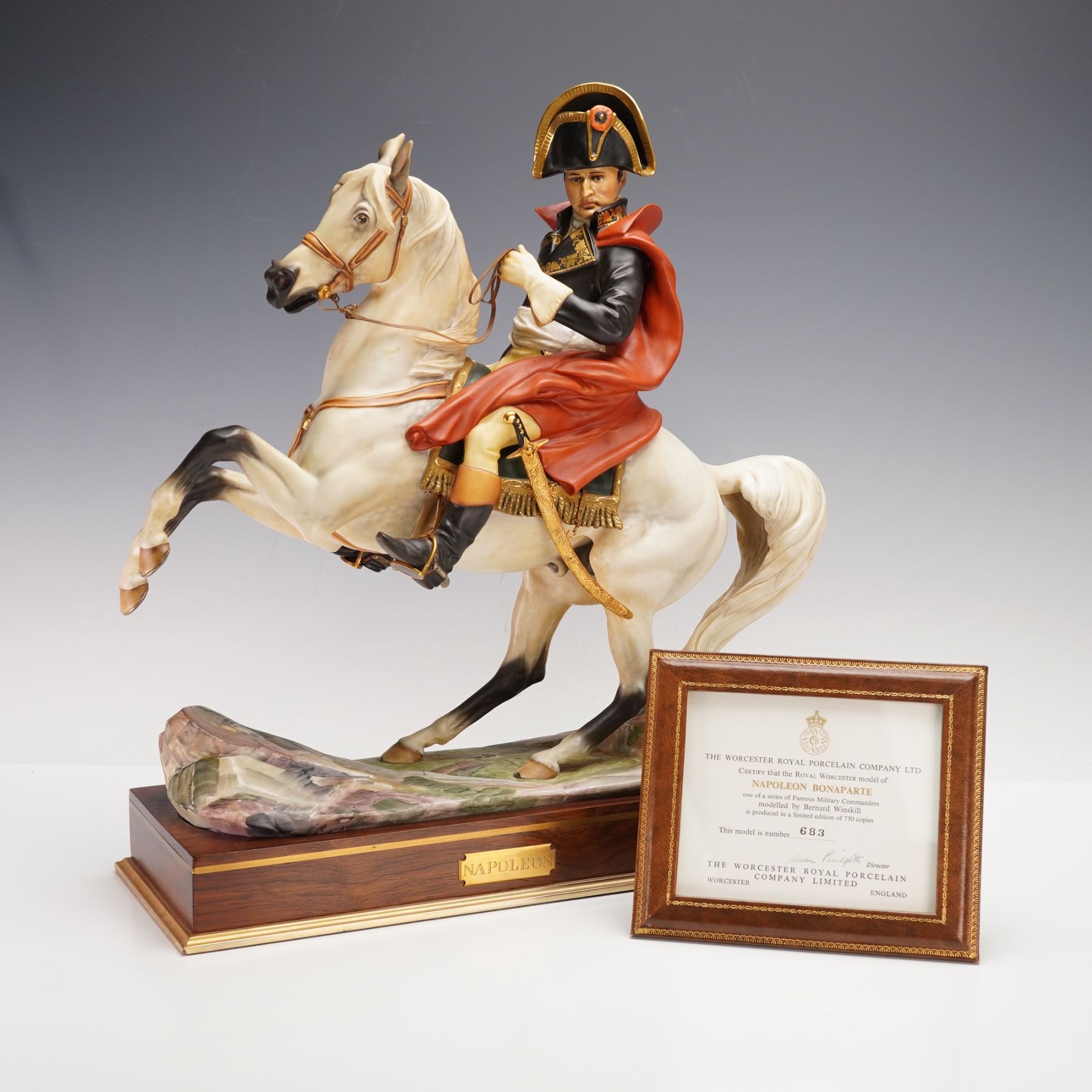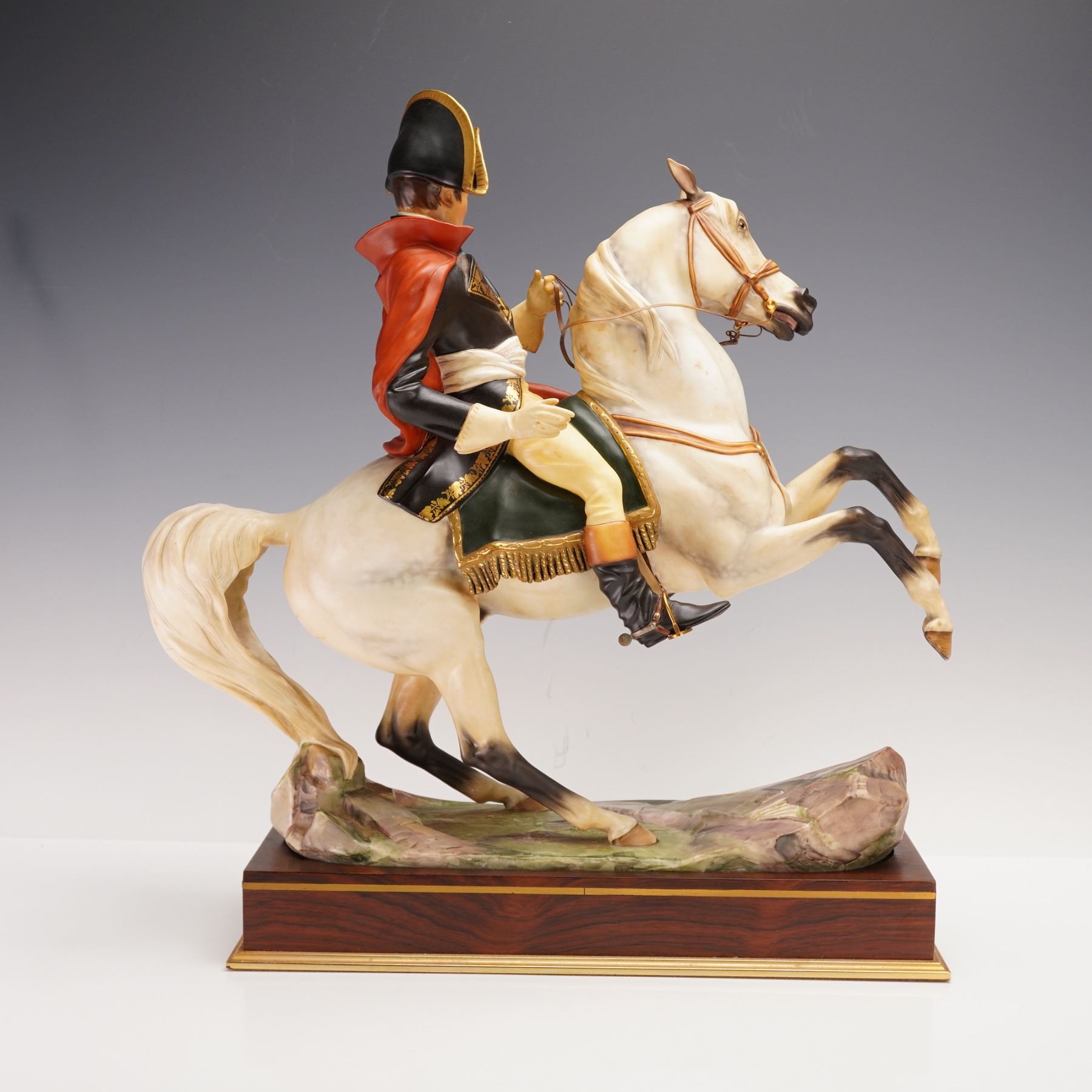 Limited edition equestrian figural modeled as French military and political leader during the French Revolution astride a rearing white horse, modeled in exquisite detail and richly hand-painted in naturalistic hues. Royal Worcester backstamp. Certificate of Authenticity included. This item has a base included.