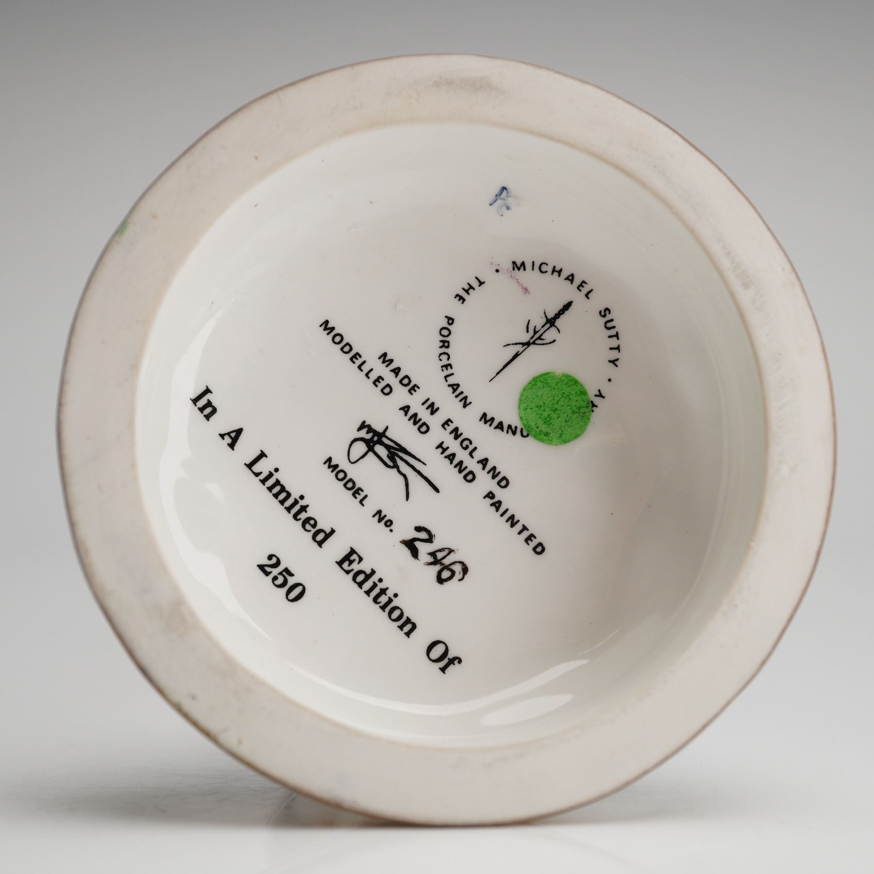 A limited edition hand-painted glazed porcelain figurine by Michael Sutty, depicting a detailed military soldier of the 1st Regiment of Foot, dated 1826. The figure is modeled in a standing pose wearing the full dress uniform, featuring a bright red coat with gold epaulets and trim, light blue trousers, and a black shako topped with a white plume. The figure stands on a circular base trimmed in gilt. The front of the base is inscribed "1st Regiment of Foot 1826." The underside of the base contains multiple black-printed factory marks confirming the maker and origin, including "MADE IN ENGLAND," "THE PORCELAIN MANUFACTURED BY MICHAEL SUTTY," and "MODELLED AND HAND PAINTED." This piece is numbered "MODEL No. 246 In A Limited Edition Of 250."