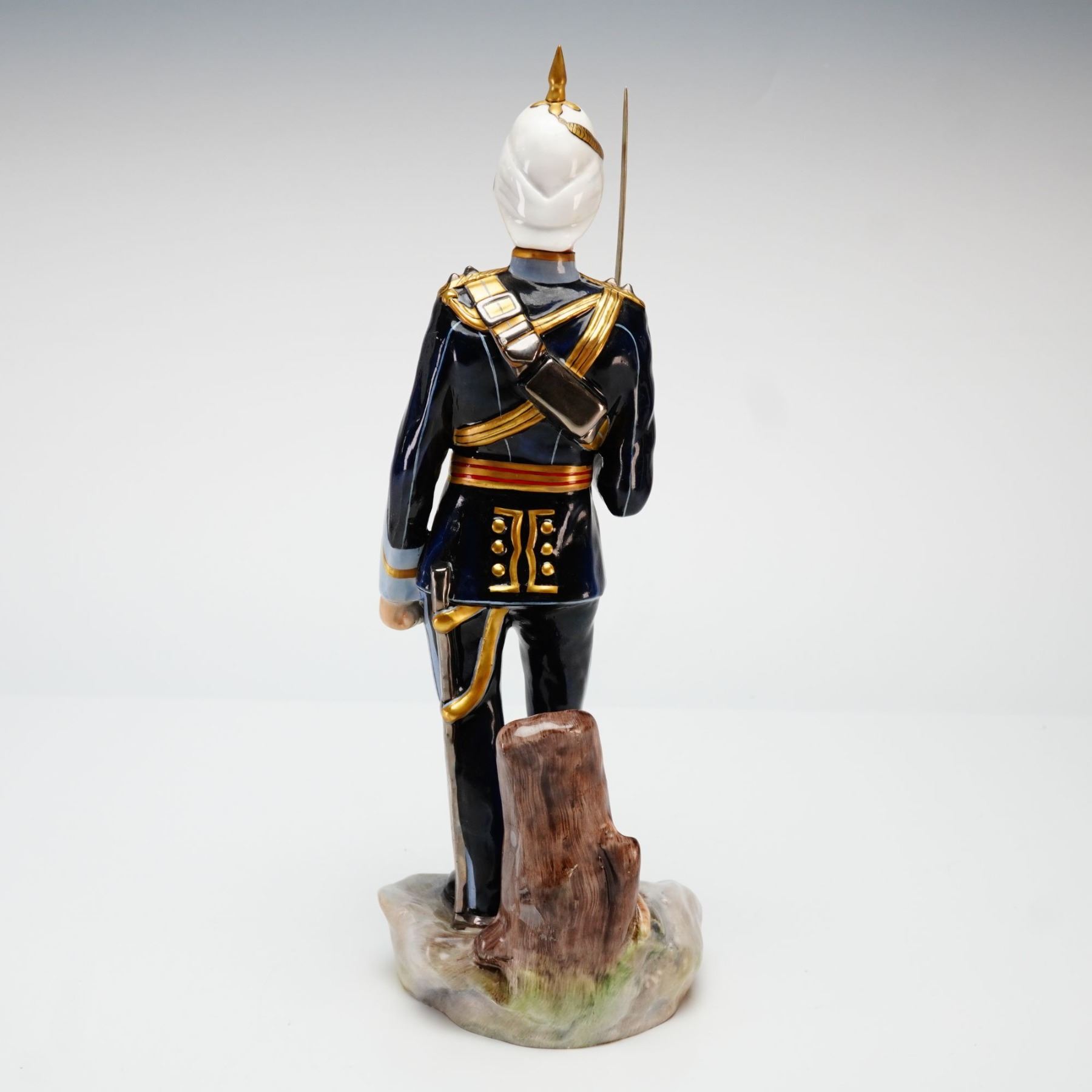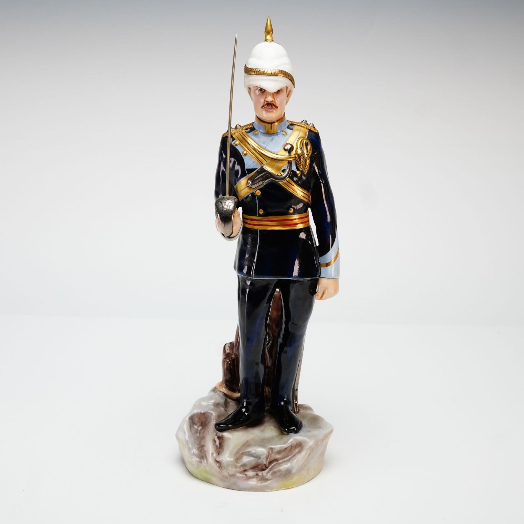 The 2nd Lancers (Gardner's Horse) ranks among the Indian Army's oldest and most distinguished armored regiments. This English porcelain figure depicting a military officer of the 2nd Lancers (Gardner's Horse). The figure is hand-painted and modeled in a dark blue uniform with gilt sashes, buttons, and belts, wearing a white pith helmet, and holding a silver-tone sword upright. The underside of the figure is marked with Michael Sutty backstamp.