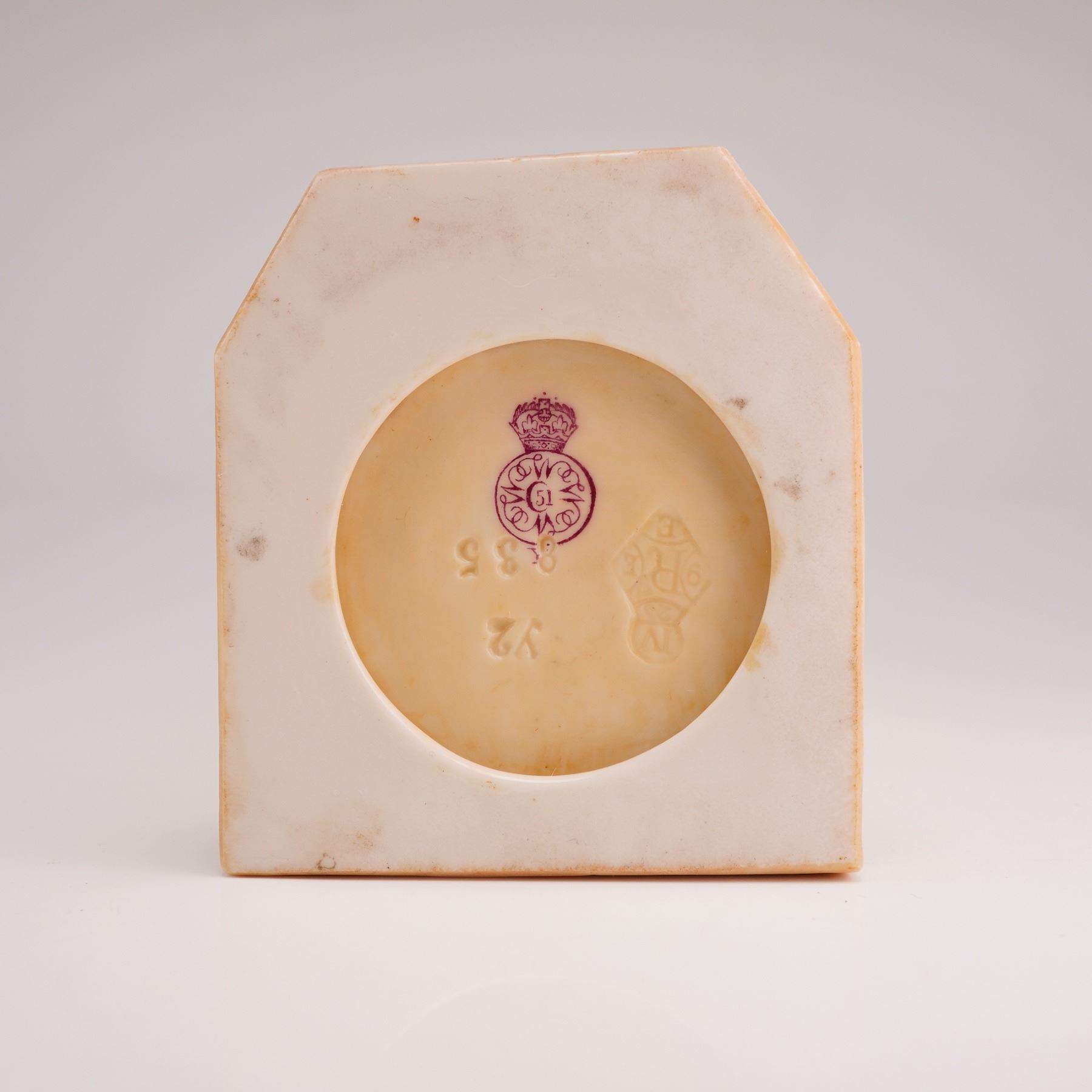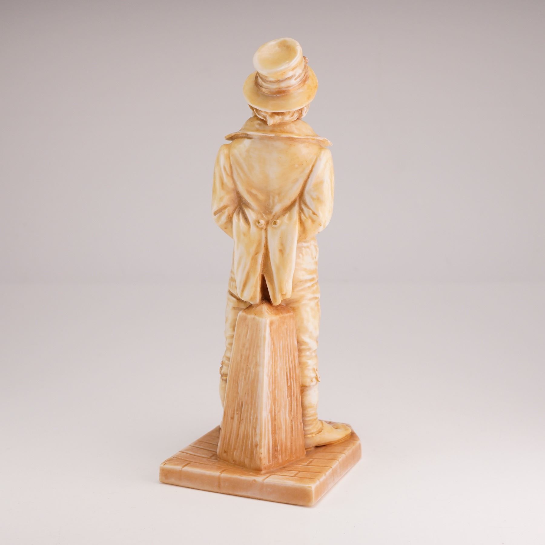 The item is made of tinted parian, also known as ivorine, which features a matte finish. The figurine is decorated in a monochromatic cream color with a light brown wash in the recesses to highlight the sculptural details. The figure depicts a man in Victorian street attire, including a crumpled top hat, an oversized tailcoat with high lapels, a waistcoat, and cuffed trousers. He is depicted standing with his feet apart and hands tucked behind his back, leaning against a short square post. The figure stands on a rectangular base with a surface modeled to resemble a cobblestone path. The underside of the base features a purple printed Royal Worcester factory mark.