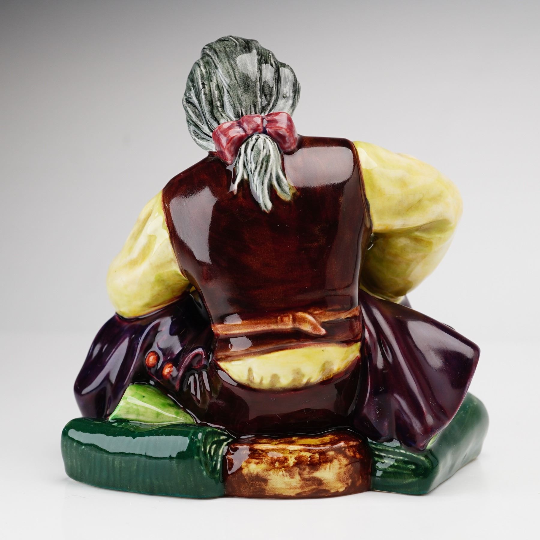 Royal Doulton ceramic figurine titled The Tailor, model number HN2174. This item is constructed of polychrome glazed ceramic and depicts a seated male figure engaged in his craft. The figure is modeled with gray hair tied in a ponytail with a red bow, wearing a pale yellow shirt, a deep brown waistcoat, and purple trousers decorated with red buttons. The figure is positioned on a naturalistic base alongside a roll of green fabric and a spool of thread. The underside of the base displays a green printed factory mark featuring a lion standing on a crown above the words Royal Doulton and England, surrounding a circular monogram of four interlocking D characters. The words Made in England are arched above the lion. An impressed model number is also located on the underside.