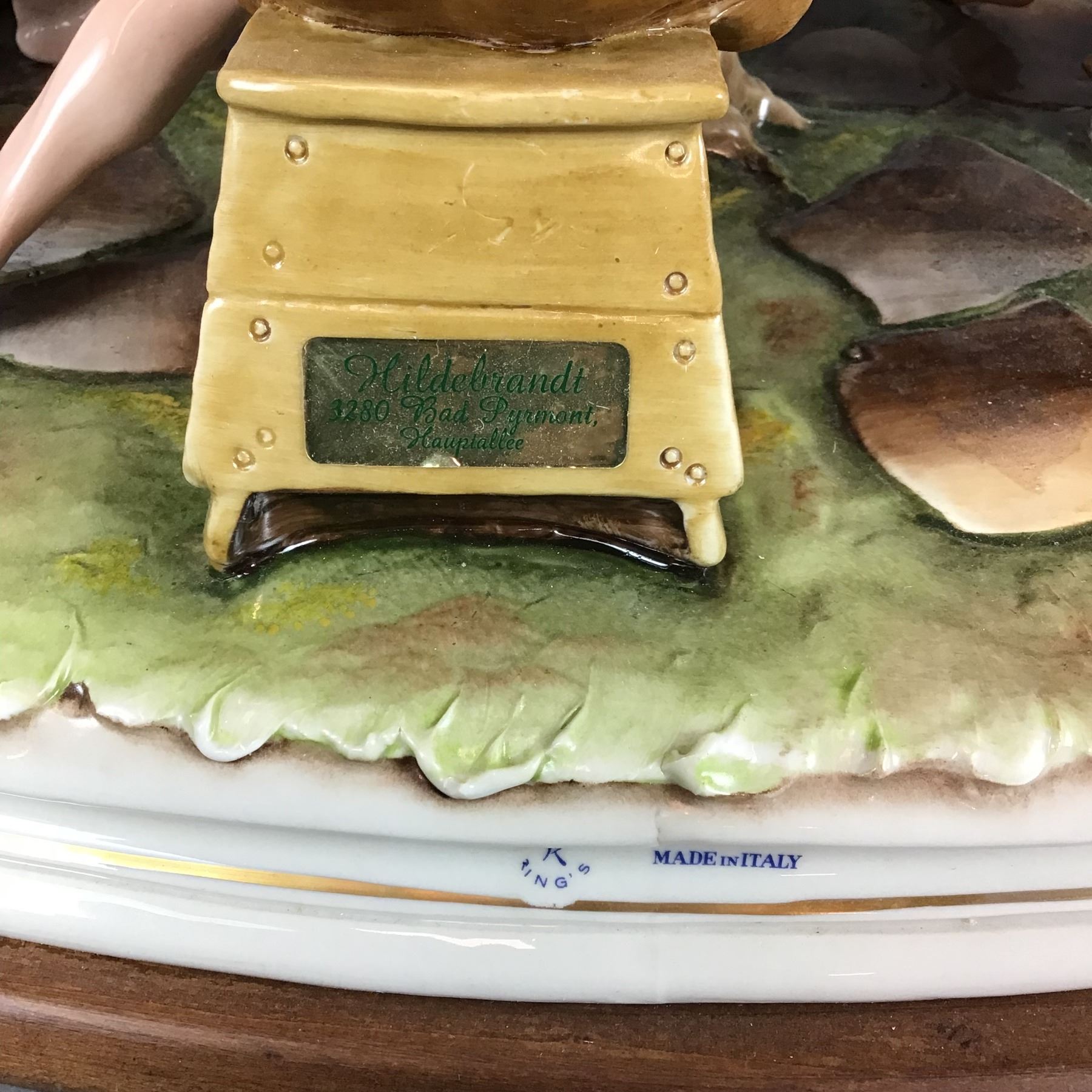A large Capodimonte polychrome porcelain figural group titled The Card Players, featuring an incised signature for artist Enzo Merli. This lg figurine depicts four young boys in various poses of concentration and play, gathered around a rustic wooden table. The scene is set upon a naturalistic base with grass, stones, and a gnarled tree stump. The construction utilizes hand-painted porcelain with a combination of matte and glazed finishes. The sculpture is mounted on a stepped, oval-shaped dark wood base. Visible markings on the white porcelain rim include a blue underglaze crown over the letter N, the word KINGS, and MADE IN ITALY.