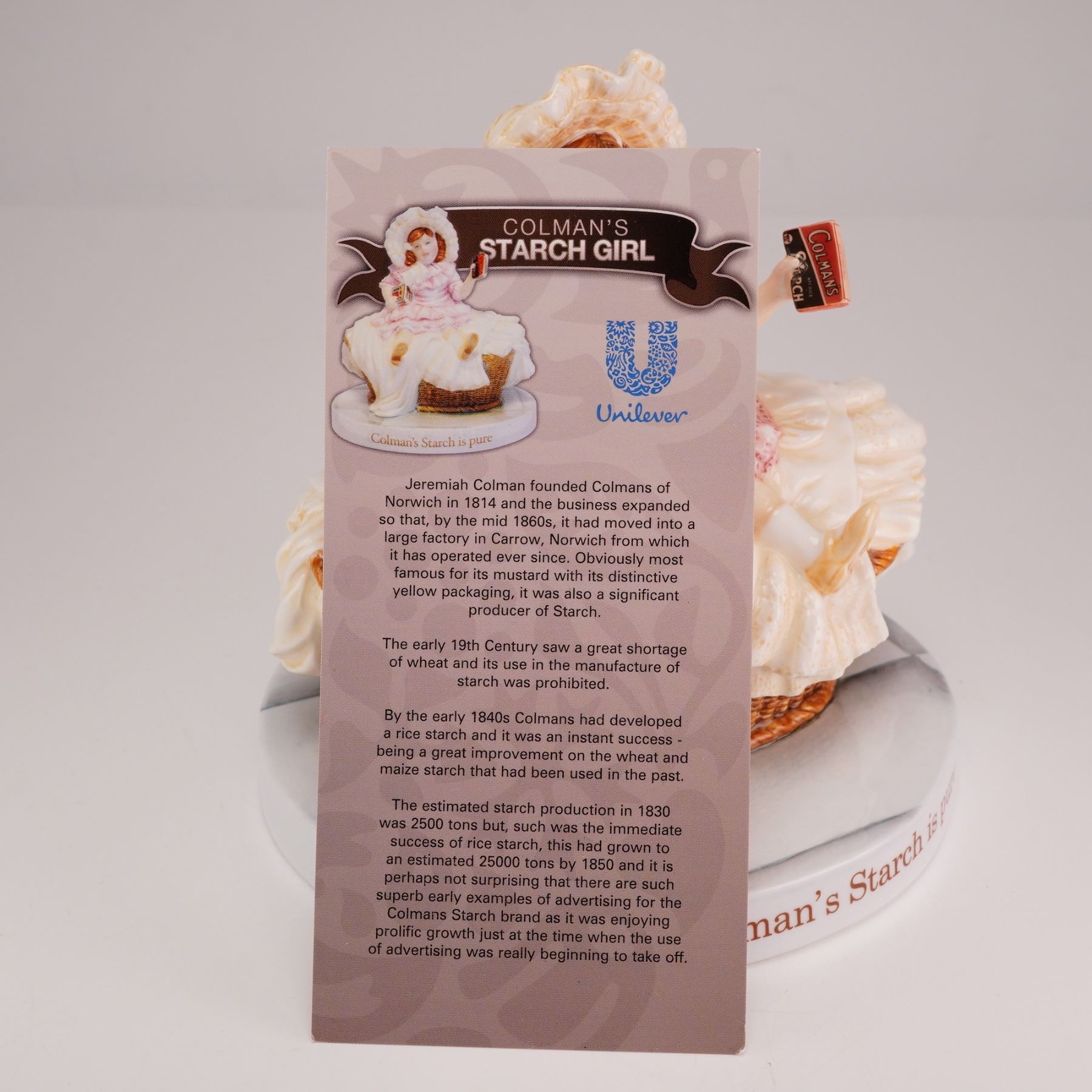 Colman's, renowned for its mustard, was established in 1814 by Jeremiah Colman at Stoke Holy Cross near Norwich, England. Beginning as a flour miller, Colman expanded into mustard production, and by the mid-19th century the business had grown into a leading manufacturer of starch, laundry blue, and mustard. The company was also noted for its progressive philanthropy, developing one of the United Kingdom's earliest industrial welfare programs for its workforce. This figurine, issued in 2011 by Millennium Collectables Ltd., is a limited edition example numbered 251 of 400. It portrays a young girl wearing a ruffled pink dress and a large, tiered bonnet, seated on a white cloth draped over a woven laundry basket. She holds two miniature boxes of Colman's Starch. The circular base has a marbled top and a brown transfer-printed inscription along the front edge reading Colman's Starch is pure. The underside bears the Royal Doulton backstamp. Certificate of Authenticity included.