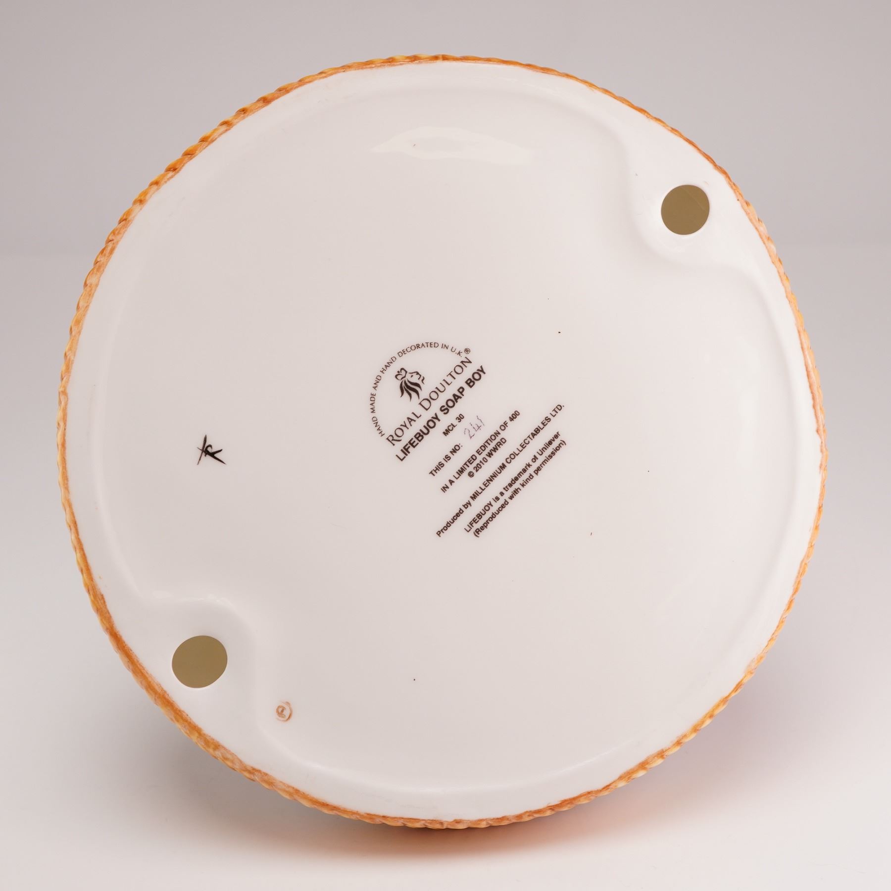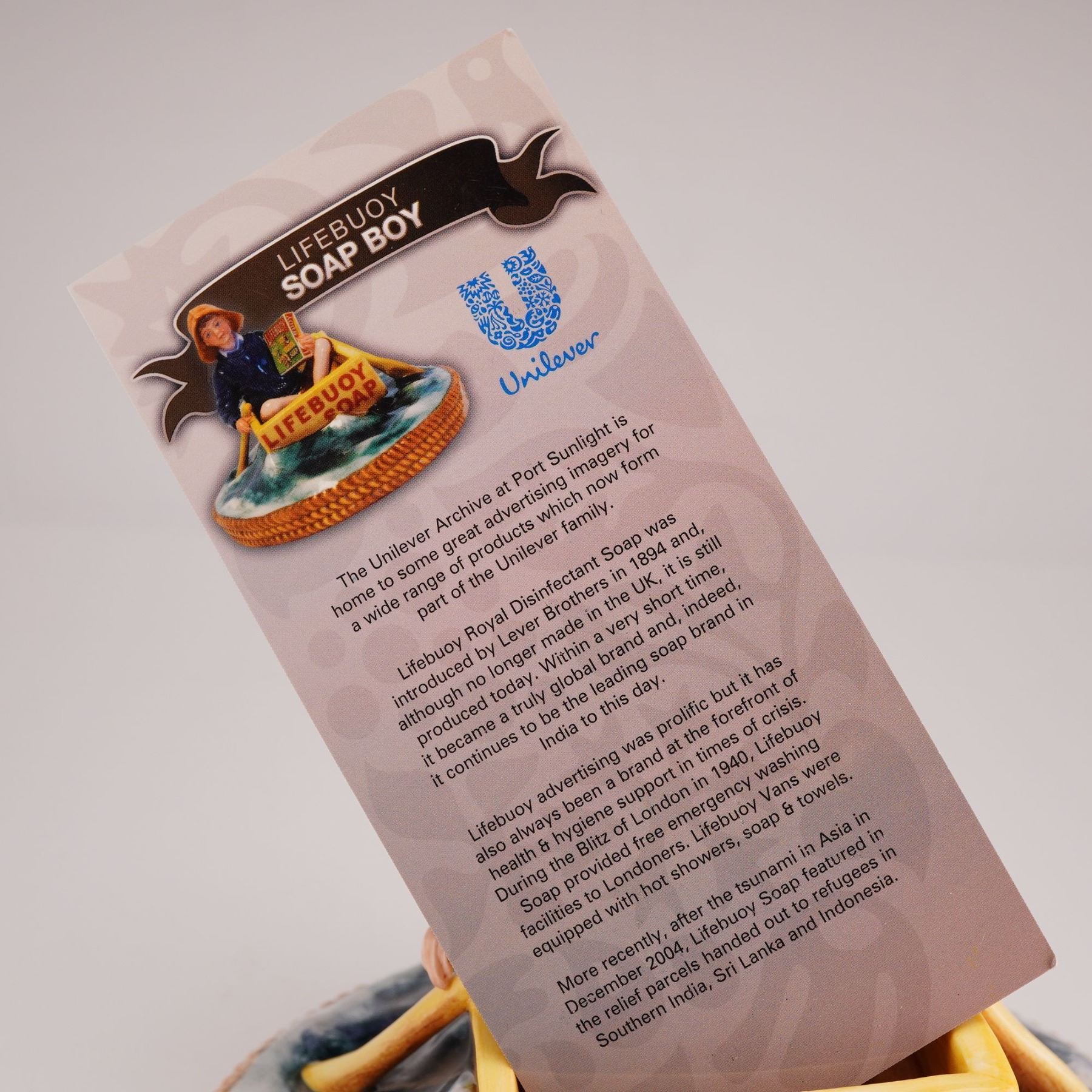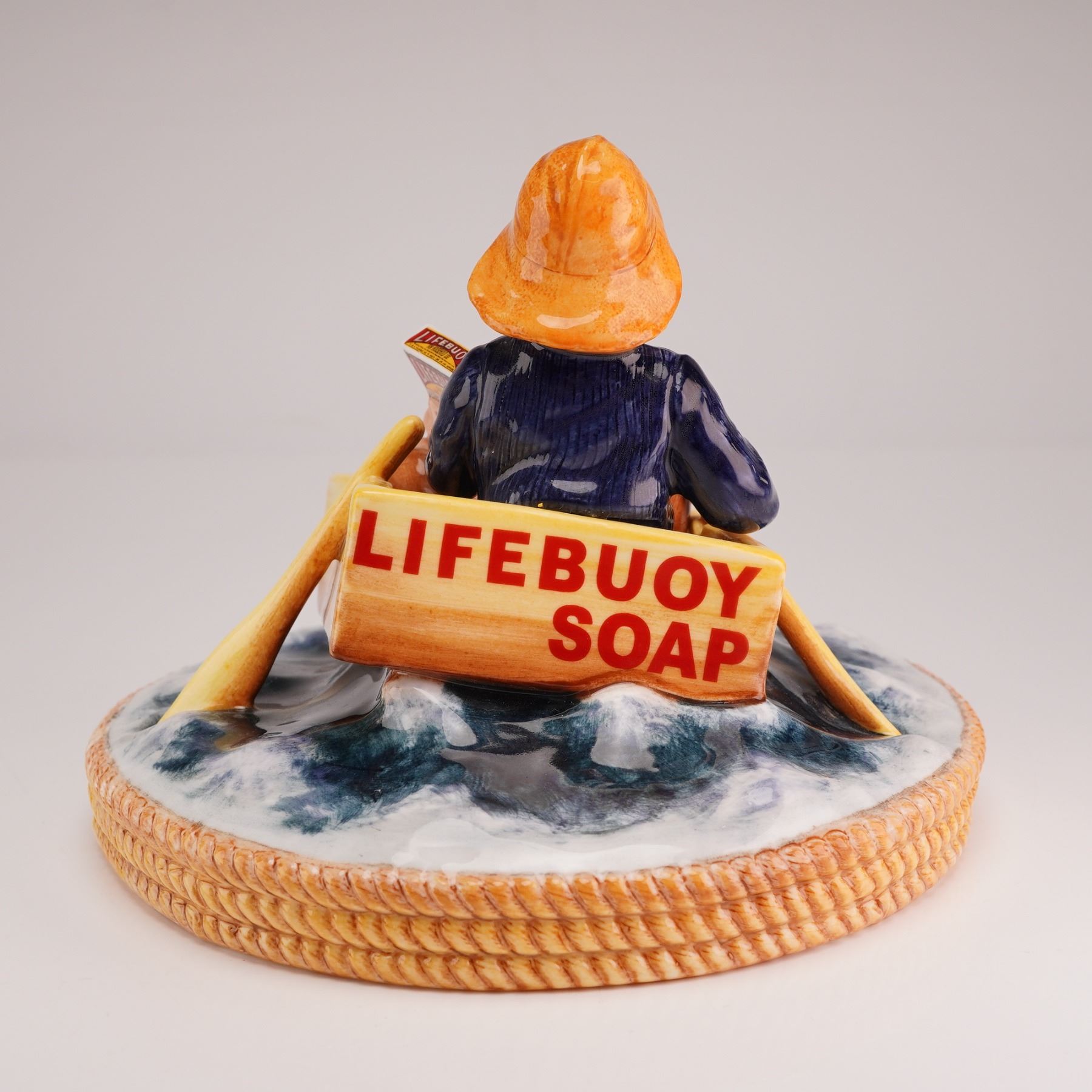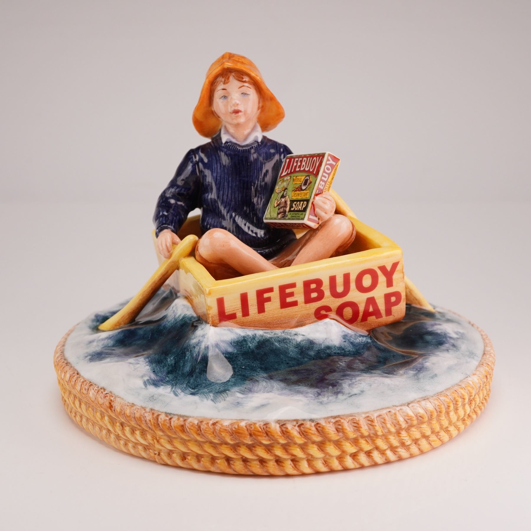 Introduced in 1894 by Lever Brothers, Lifebuoy was developed as an affordable red health soap with a distinctive carbolic scent, intended to help prevent the spread of cholera and germs. Known for its octagonal form and its memorable 1930s body odor advertising campaigns, it remained a household staple in both the United States and Britain for more than a century before being discontinued in the U.S. in 2006. This limited edition example, numbered 241 of 400 and produced for Millennium Collectables Ltd., features a young boy wearing an orange yellow sou'wester hat and a dark blue textured sweater, seated in a yellow crate marked Lifebuoy Soap and styled as a boat. He holds a miniature Lifebuoy soap box. The figure rests on a circular base modeled as blue and white churning water with a rope motif in relief along the border. The underside is marked with the Royal Doulton backstamp and the piece is accompanied by its certificate of authenticity.