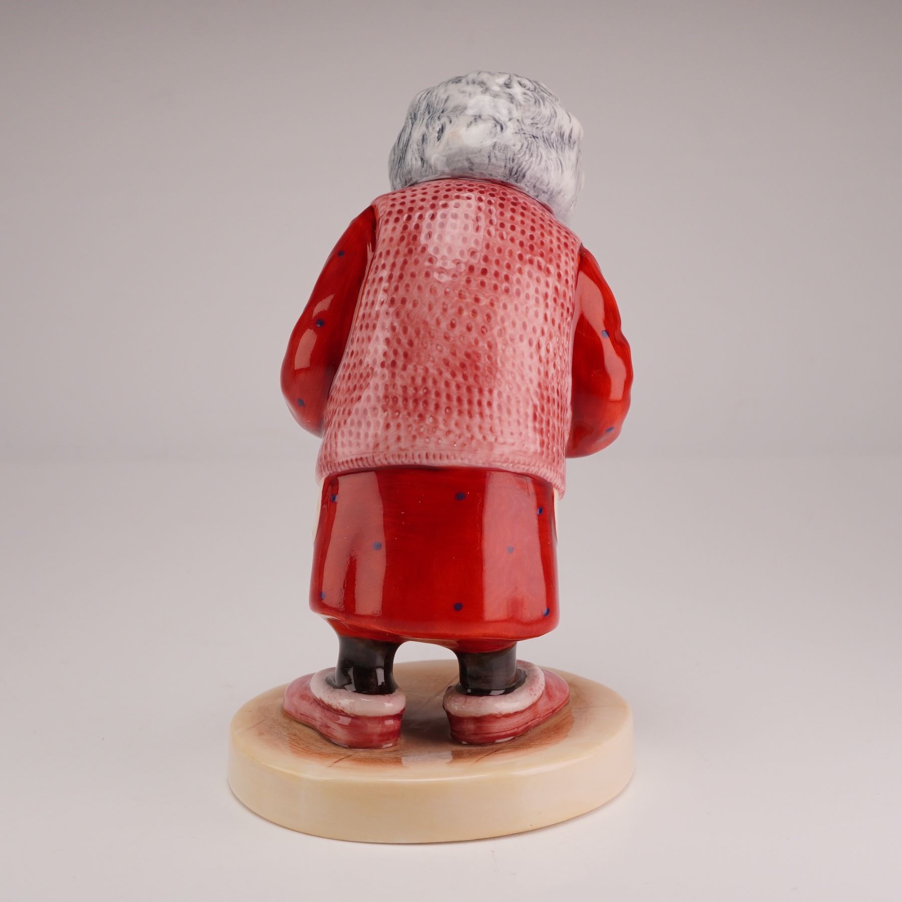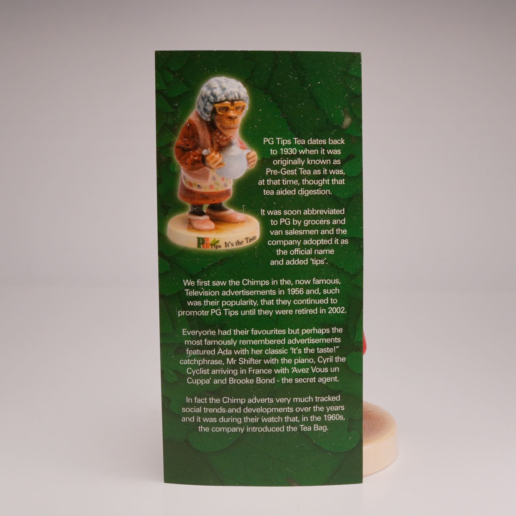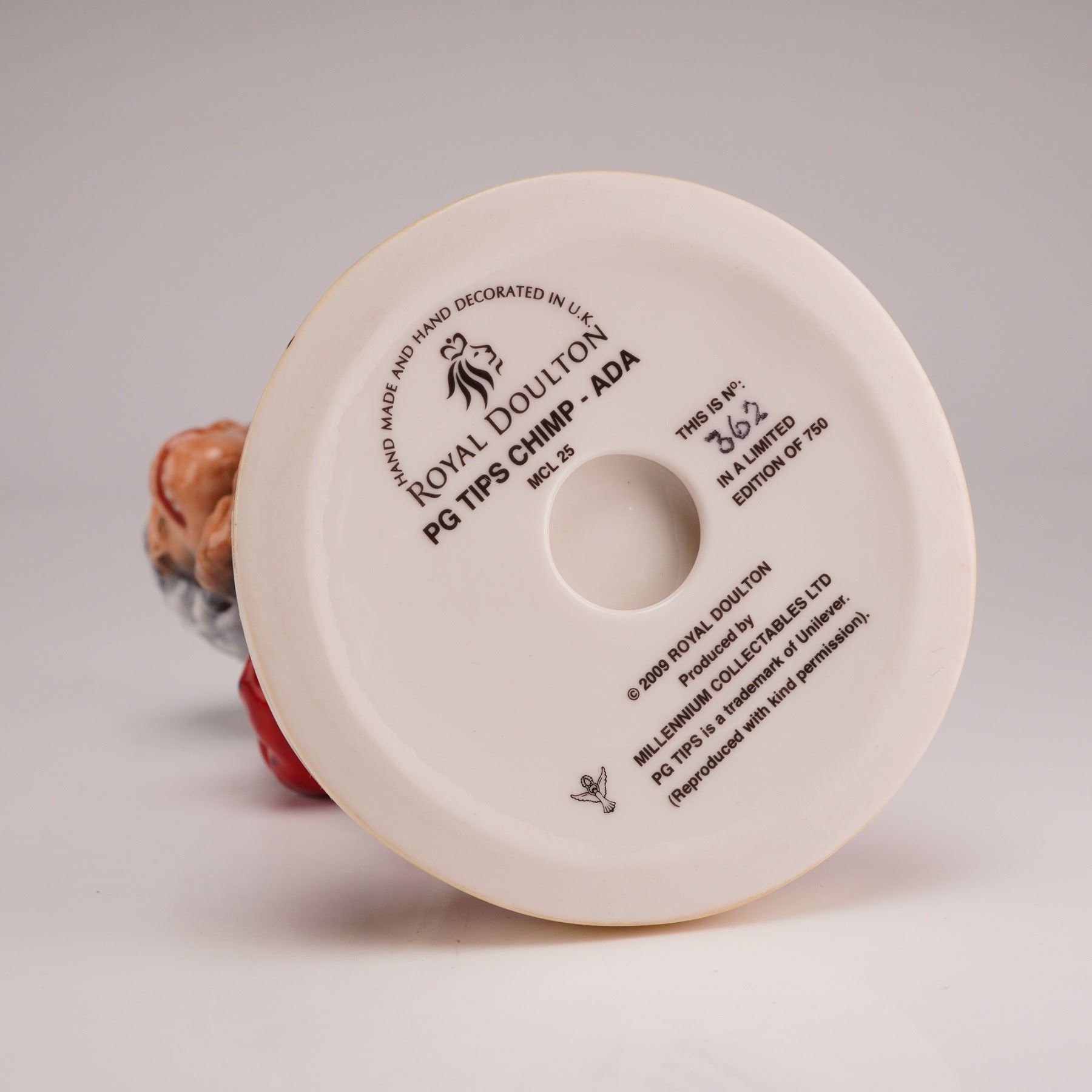 Introduced in 1930 by Brooke Bond under the name "Pre-Gestee" and originally promoted as a digestive aid, PG Tips grew into one of Britain's leading tea brands, distinguished by its use of the top two leaves and a bud. The brand became widely recognized through its 1956 "chimps tea party" advertisements and later with the introduction of pyramid tea bags in 1996. This limited edition hand-decorated ceramic figurine, numbered 362 of 750 and produced by Royal Doulton, portrays Ada from the long-running PG Tips chimpanzee advertising campaign. Finished in a high-gloss glaze, the figure is modeled in anthropomorphic dress, wearing a white wig, orange-rimmed spectacles, a pearl-style necklace, and a floral apron over a red dress. She is shown in a slightly hunched stance, holding a grey teapot. The circular base bears the PG Tips logo and the slogan "It is the Taste," along with the Royal Doulton backstamp. Includes certificate of authenticity.