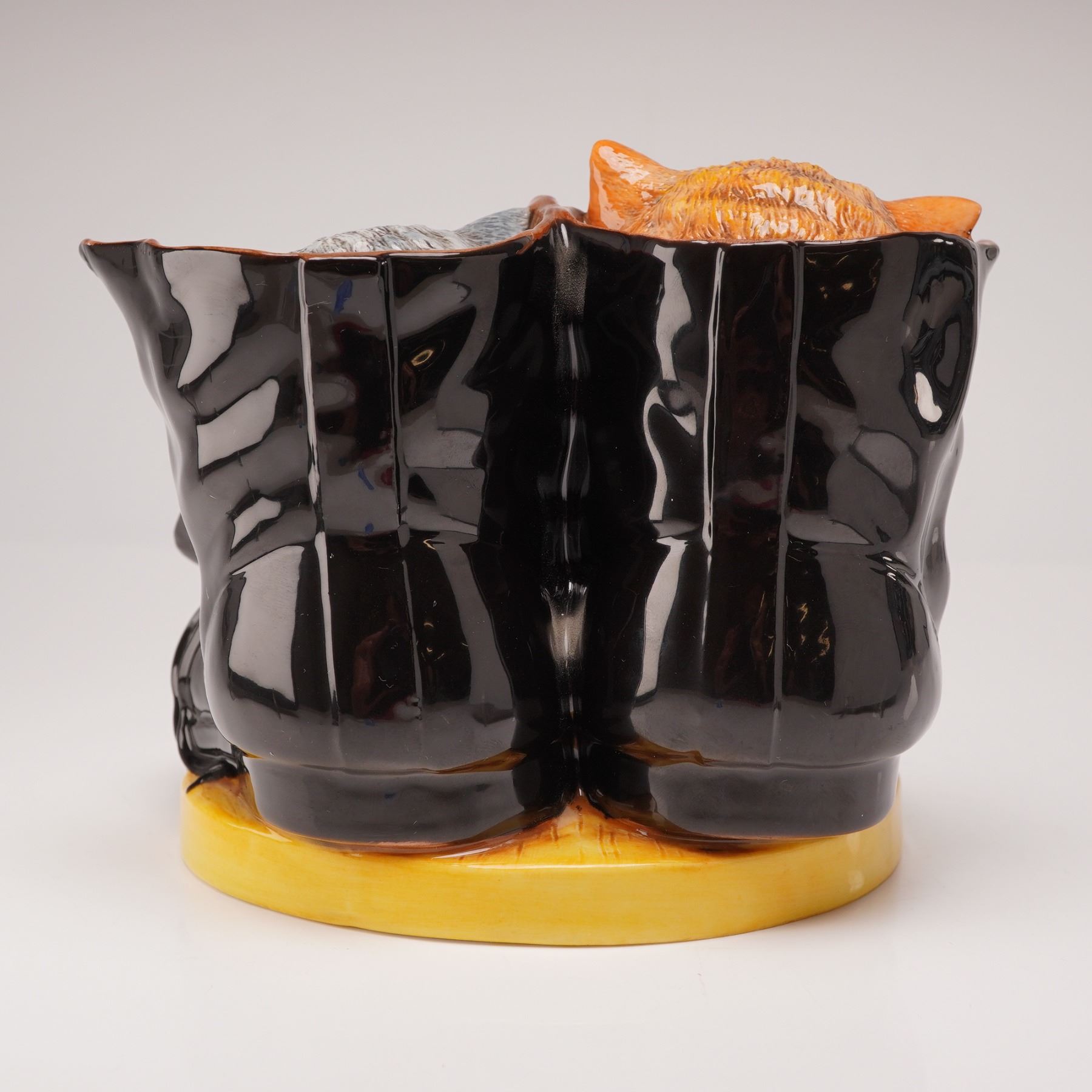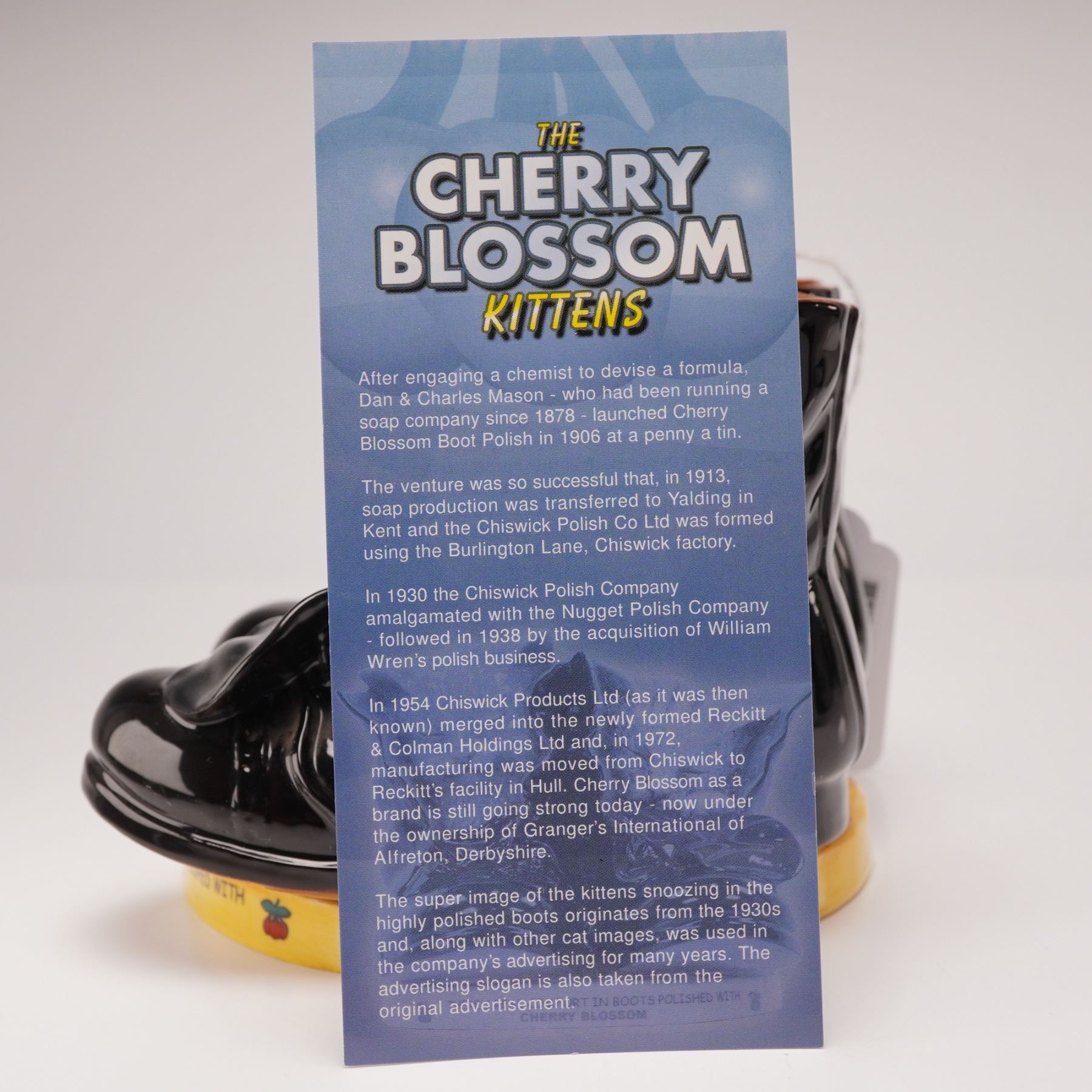 Cherry Blossom has been a leading brand of shoe and boot polishes for over a century, with some of its most memorable advertising campaigns featuring kittens. This limited-edition example, numbered 337 of 750, draws inspiration from the brand's classic 1930s imagery. The glazed polychrome ceramic figure depicts a ginger tabby and a grey tabby kitten nestled asleep within a pair of polished black boots. The composition is set on a circular yellow base inscribed with the vintage slogan, "There's real comfort in boots polished with Cherry Blossom." The underside bears the Royal Doulton backstamp, and the piece is accompanied by its certificate of authenticity.