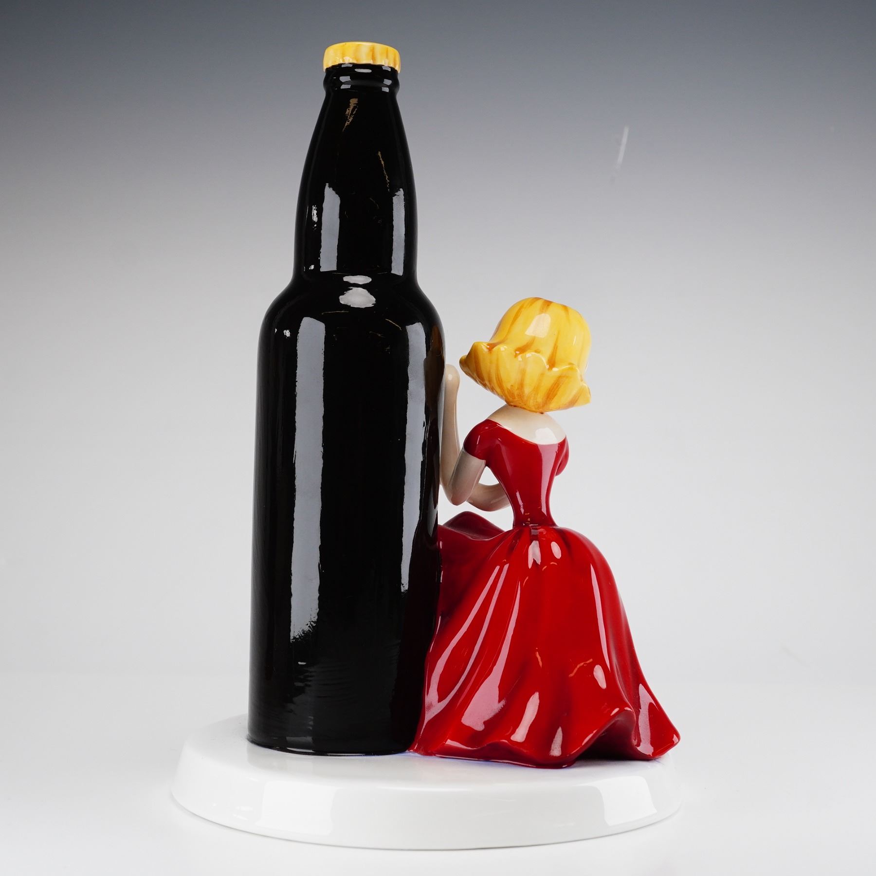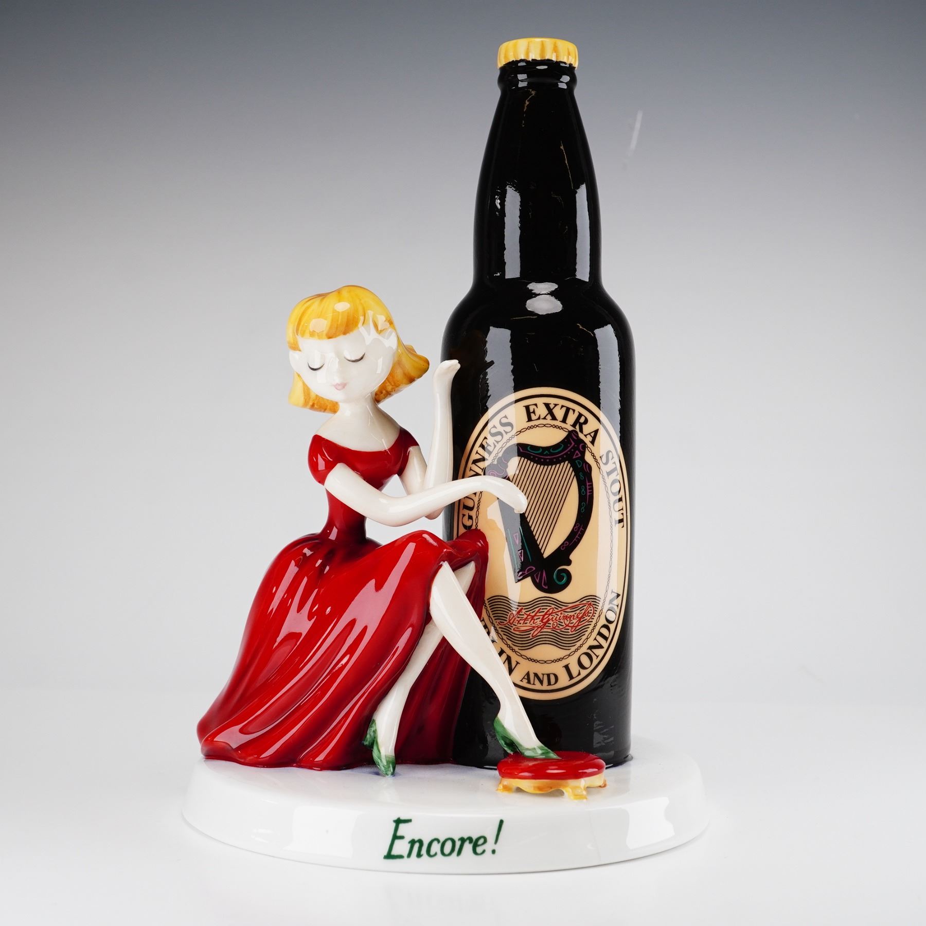 Royal Doulton Guinness Harpist advertising figurine, model number MCL 29. This hand-decorated ceramic piece was produced in the United Kingdom in 2010 for Millennium Collectables Ltd. under license from Guinness. The figurine depicts a blonde woman wearing a red evening gown, seated beside a large bottle of Guinness Extra Stout. The figure is posed to mimic playing the harp featured on the bottle label. The bottle is finished in a high-gloss black glaze with a yellow crown cap. The circular white base is inscribed with the title Encore! in green script on the front edge. The underside bears the Royal Doulton lion and crown backstamp along with the model designation MCL 29 and the name of the modeler, Shane Ridge. This piece is a limited edition, hand-numbered 157 of 750. The base also retains two paper auction labels from previous cataloging.