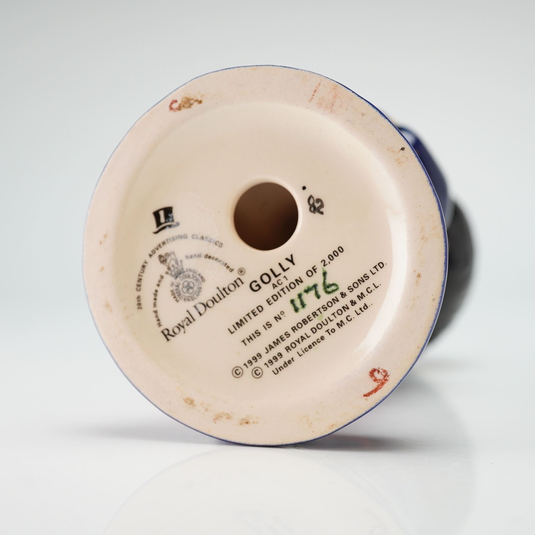 This hand-decorated ceramic advertising figurine was manufactured by Royal Doulton in 1999 as part of the 20th Century Advertising Classics series. The figure depicts the iconic Robertson's marmalade mascot, Golly, wearing a blue tailcoat, yellow waistcoat with a red bow tie, and red trousers. The character is shown holding a miniature replica jar of Golden Shred marmalade. The front of the base features the white script slogan Golly it's Good!. The underside displays a full Royal Doulton backstamp, identifying the piece as model GOLLY AC1 from a limited edition of 2,000, with this specific item hand-numbered 1176. It includes 1999 copyright marks for James Robertson & Sons Ltd. and Royal Doulton.