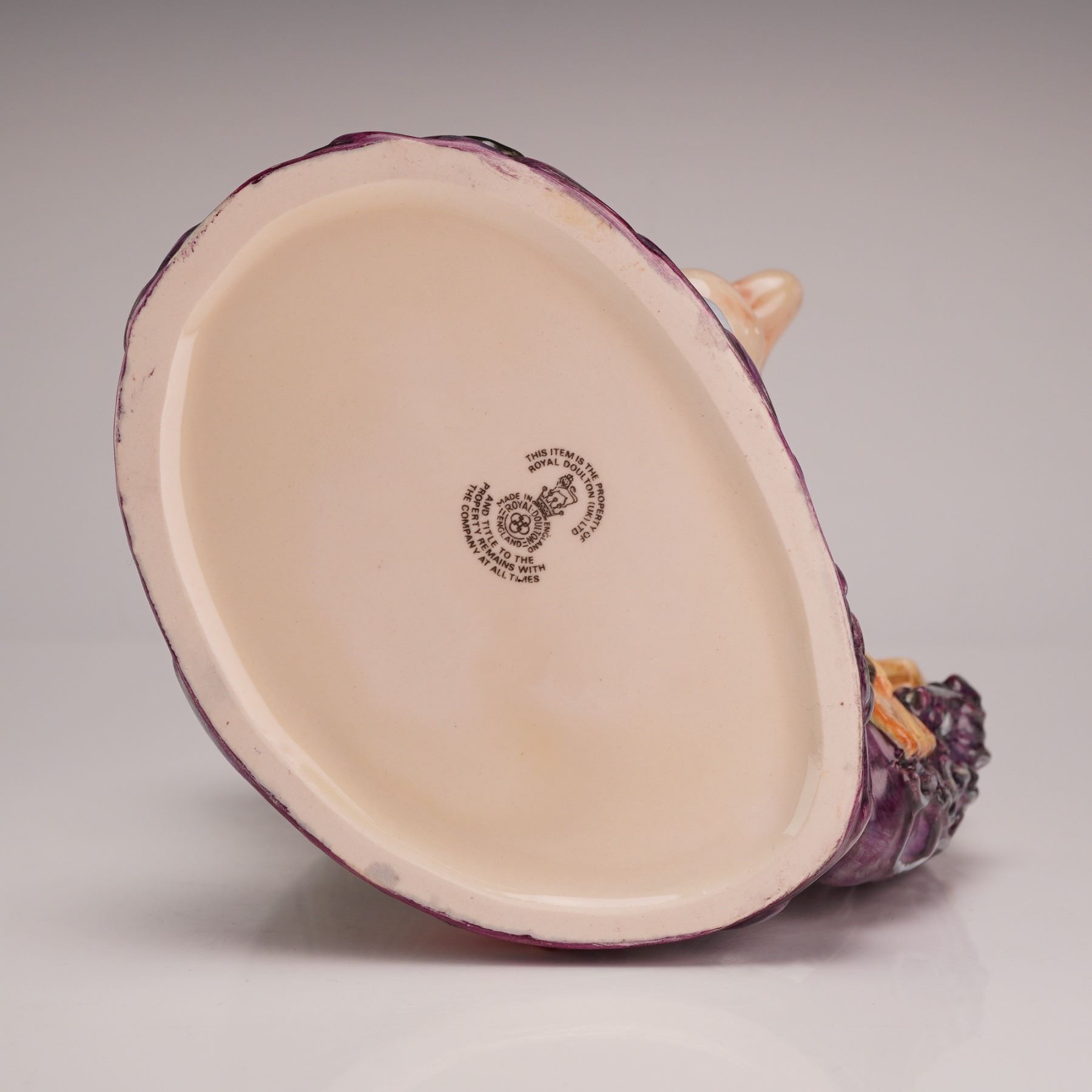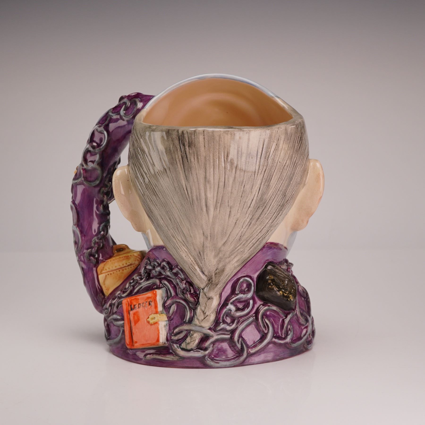 Royal Doulton Marley's Ghost D7142 large character jug. This earthenware jug is constructed with hand-painted under-glaze and over-glaze enamels. The subject is depicted with a detailed face, realistic flesh tones, and gray hair, wearing a pale blue head wrap tied under the chin. The base and handle are a deep purple color, molded with gray chains, a padlock, and tan cash boxes. On the reverse, an orange-red book is visible among the chains with the word LEDGER partially visible on the cover. The base features a black printed mark. The outer edge of the mark states: THIS ITEM IS THE PROPERTY OF ROYAL DOULTON (UK) LTD AND TITLE REMAINS WITH THE COMPANY AT ALL TIMES. The center logo features four interlocking D characters, surrounded by the words MADE IN ENGLAND and ROYAL DOULTON ENGLAND, surmounted by a crown and lion.