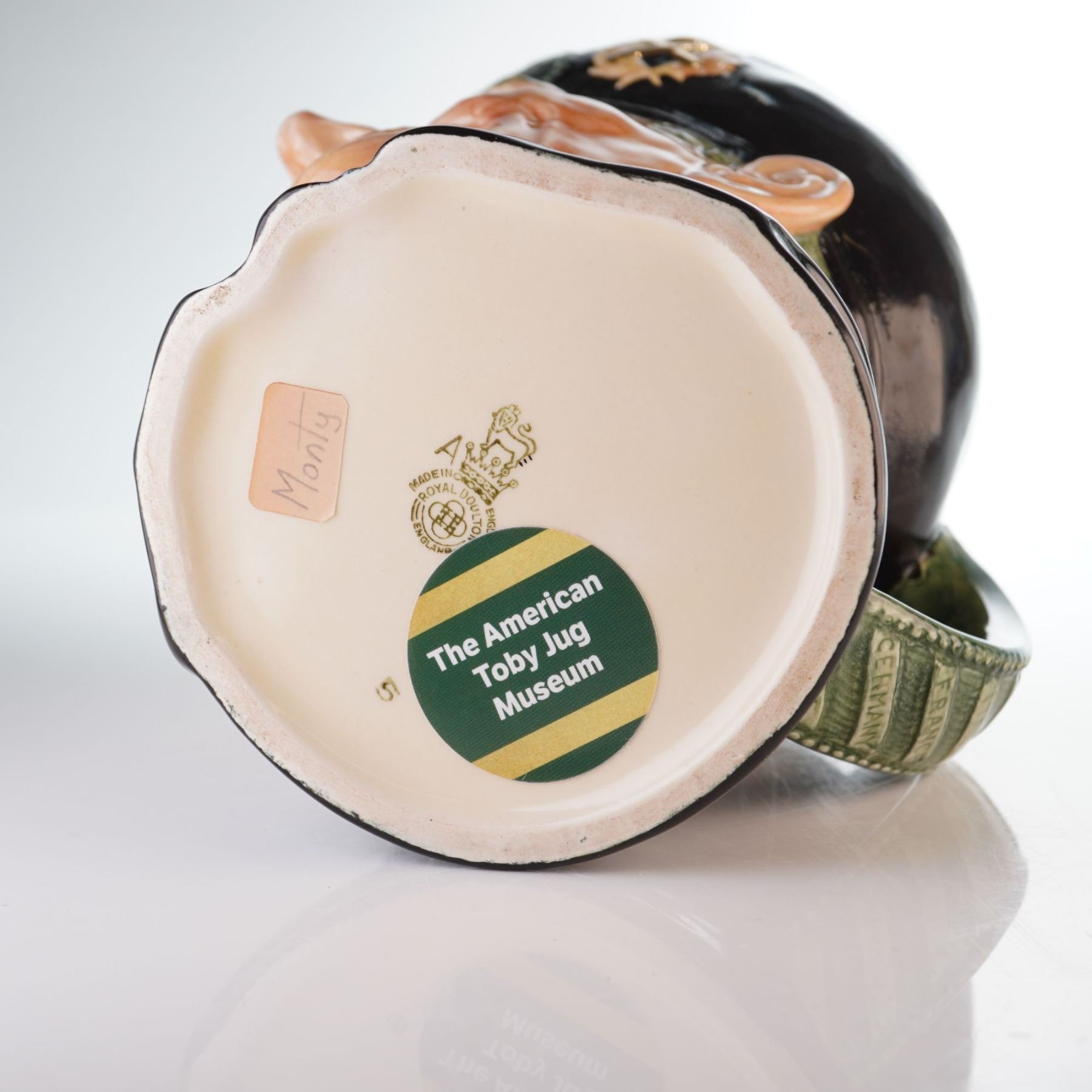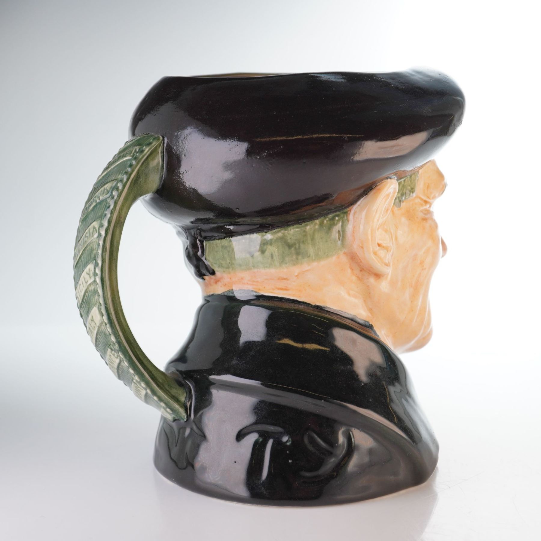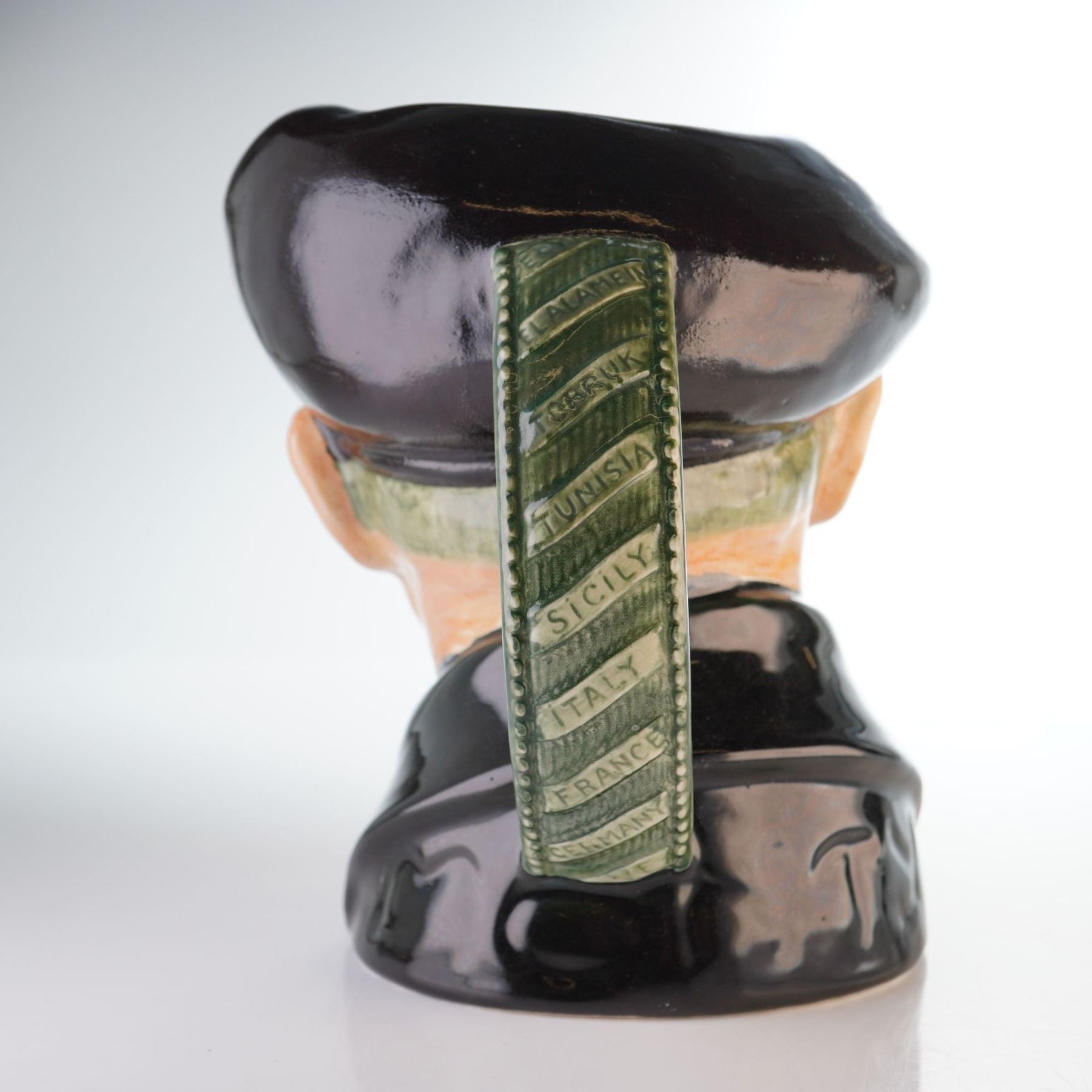 Bernard Law Montgomery (1887-1976), 1st Viscount Montgomery of Alamein ("Monty"), was a leading British commander in WWII, noted for the Allied victory in North Africa (1942) and accepting the German surrender at Luneburg Heath (1945). This large character jug portrays Montgomery in a black and gray uniform, wearing a black beret adorned with hand-painted gilt badges. The grayish-green handle is decorated with the names of various theaters of war. The underside bears the Royal Doulton backstamp, along with a provenance sticker from the American Toby Jug Museum.