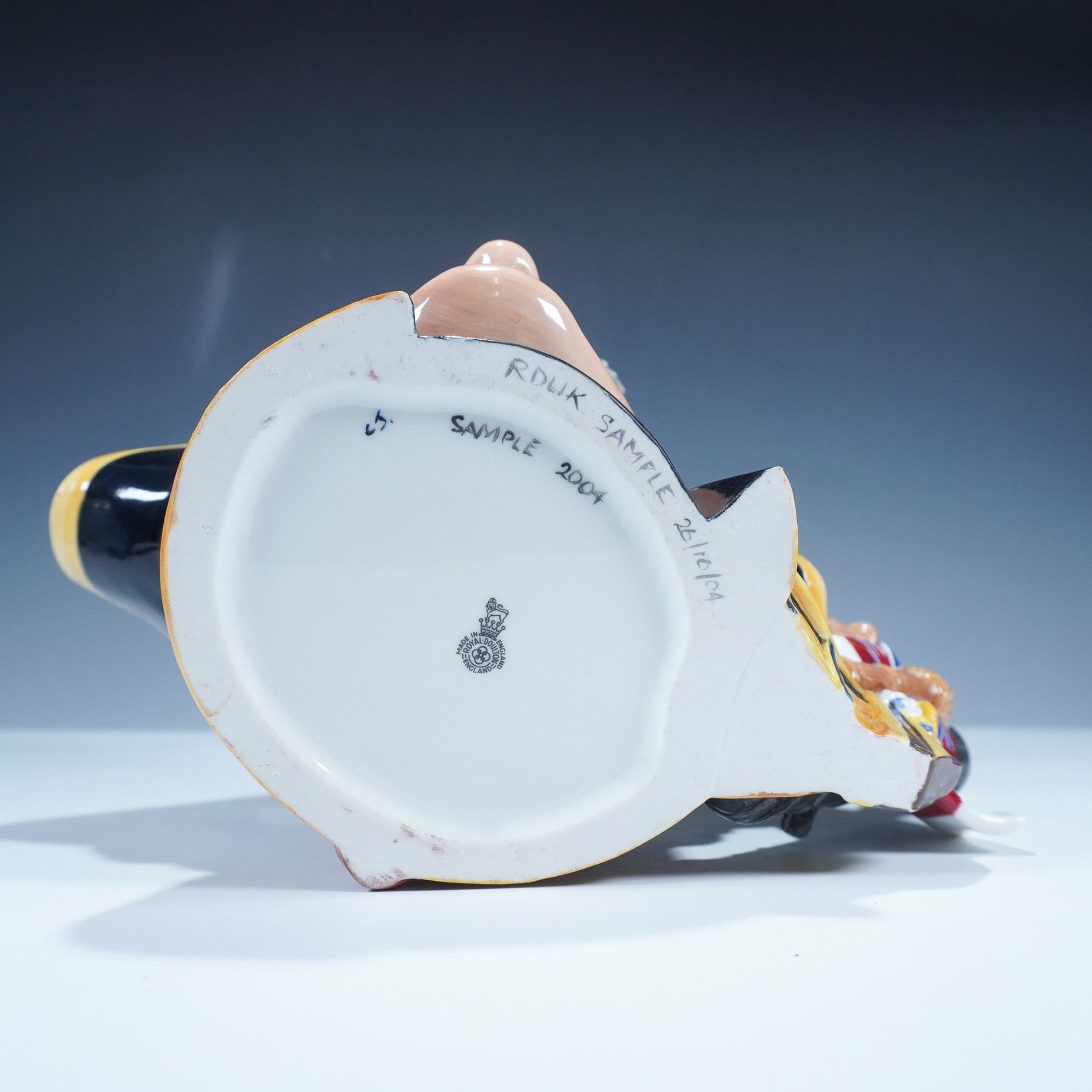 This sample edition features a figural representation of Admiral Lord Nelson, a key figure in British naval history during the late 18th and early 19th centuries. The handle is modeled as a composite of nautical elements associated with Nelson's naval career, including the prow of HMS Victory, a cannon, a telescope, and the British Naval Standard. The base is marked with the Royal Doulton backstamp. Marked: RDUK Sample 26/10/04 - Sample 2004.